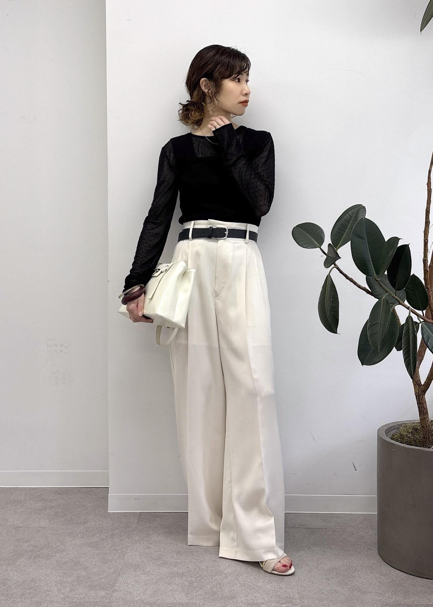 トレンド感あるスパンコールのキャミワンピとパンツでレイヤードスタイルにまとめました。