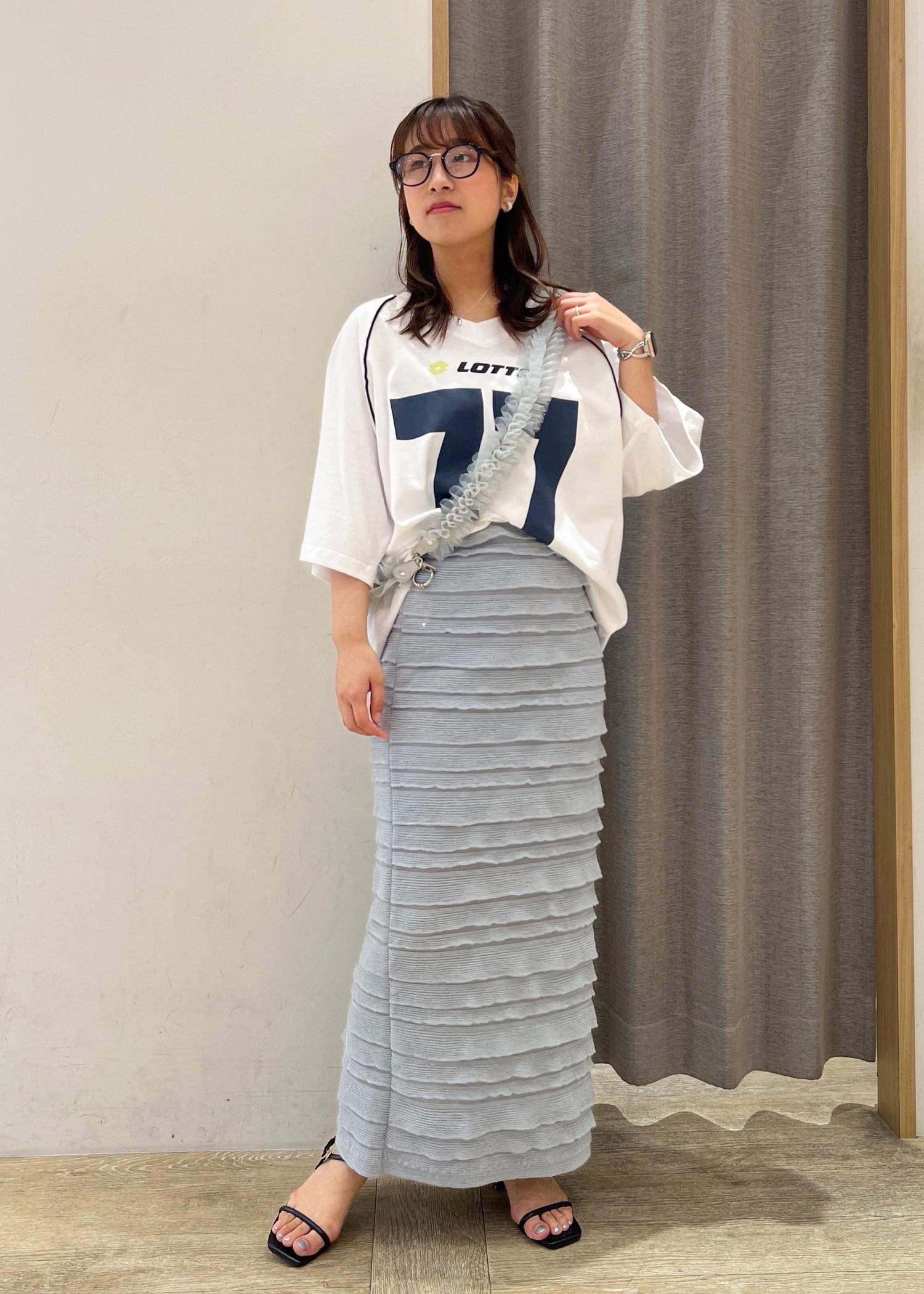 オーバーサイズのTシャツをタイトスカートとヒールサンダルでレディに着こなすコーデです。