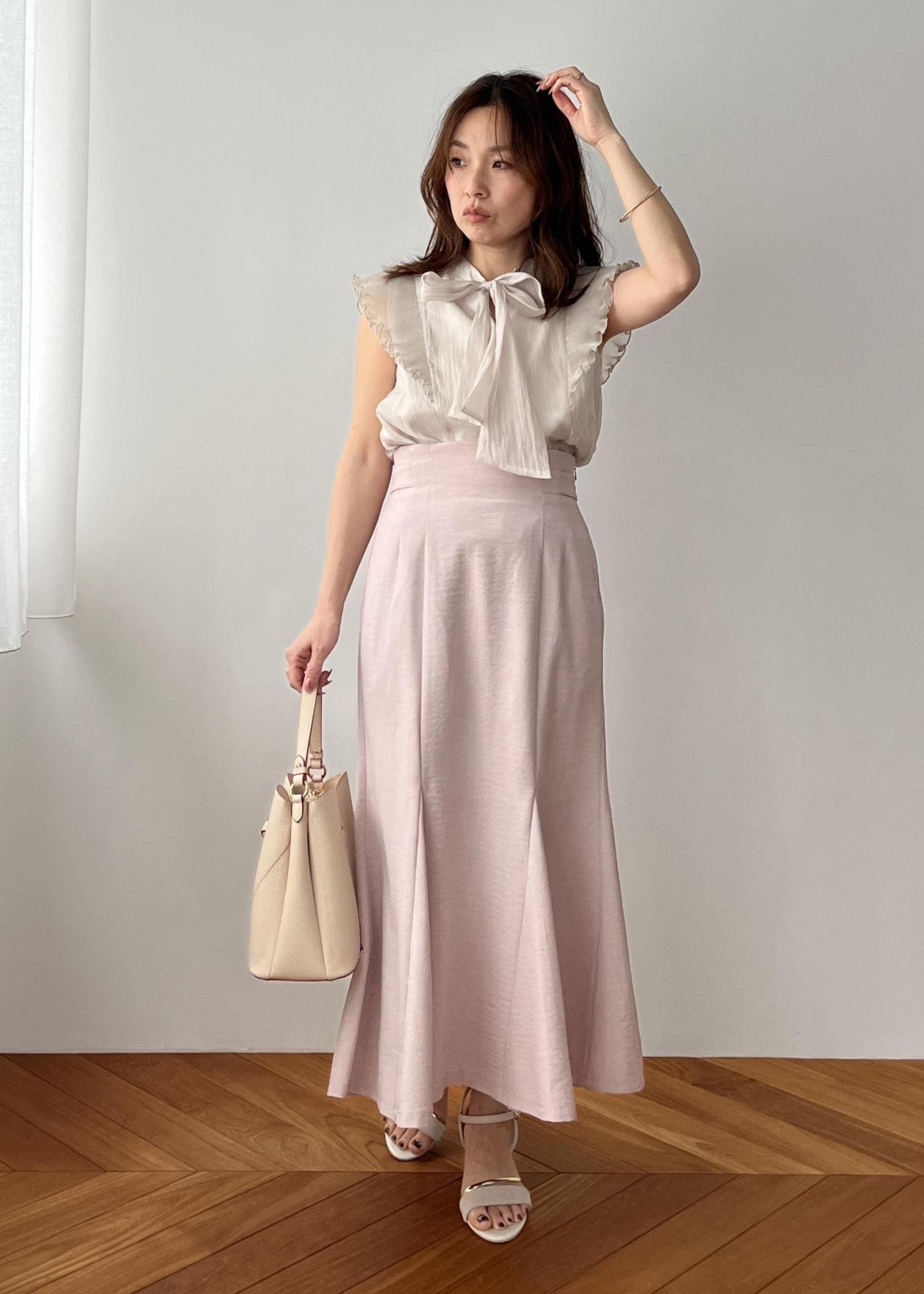 VIS主役級!華やぎシアーシャイニーボウタイフリルブラウス【前後2WAY】【洗える】キナリ / F¥5,489レビュー前後2wayで着れるボウタイブラウス。