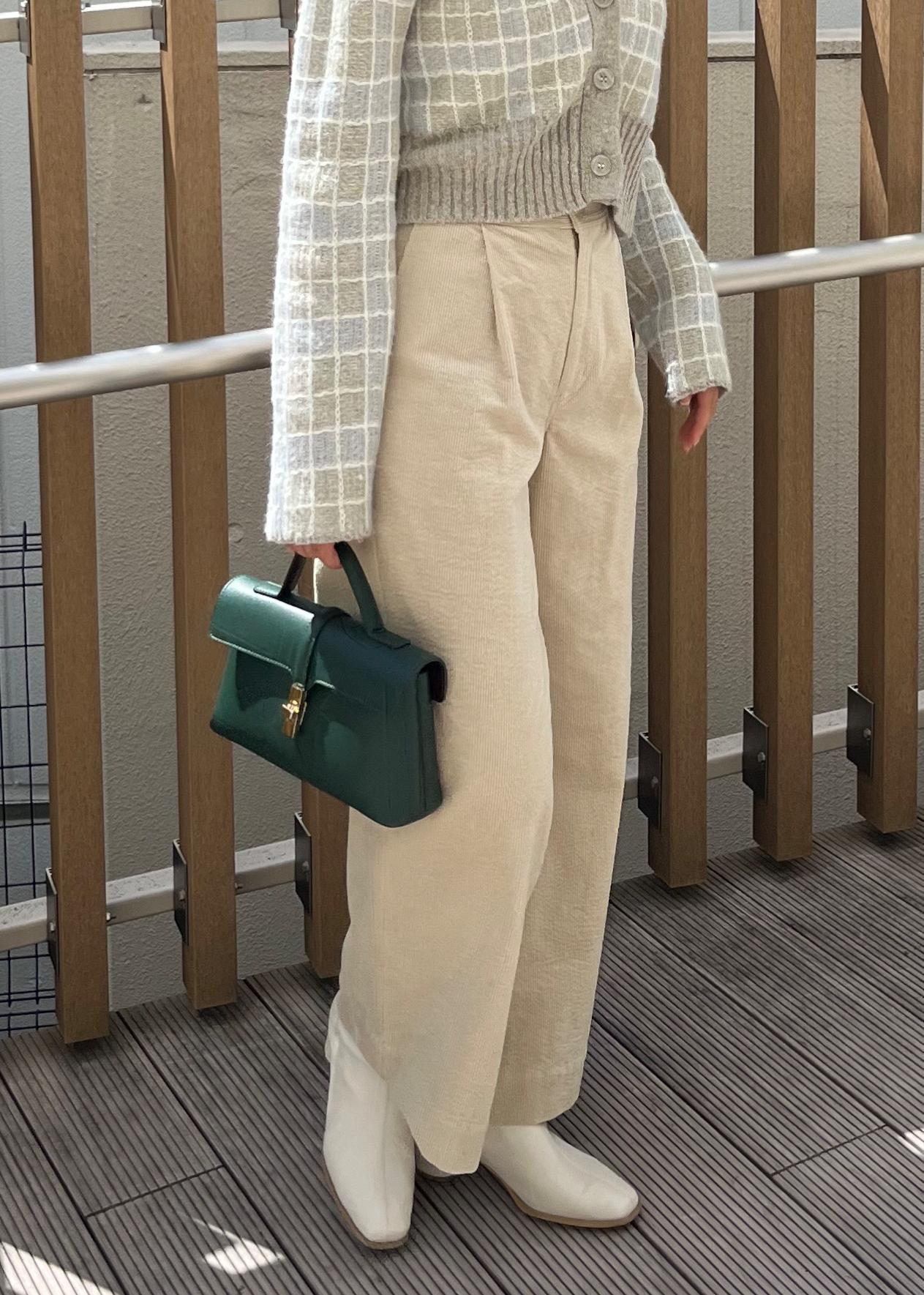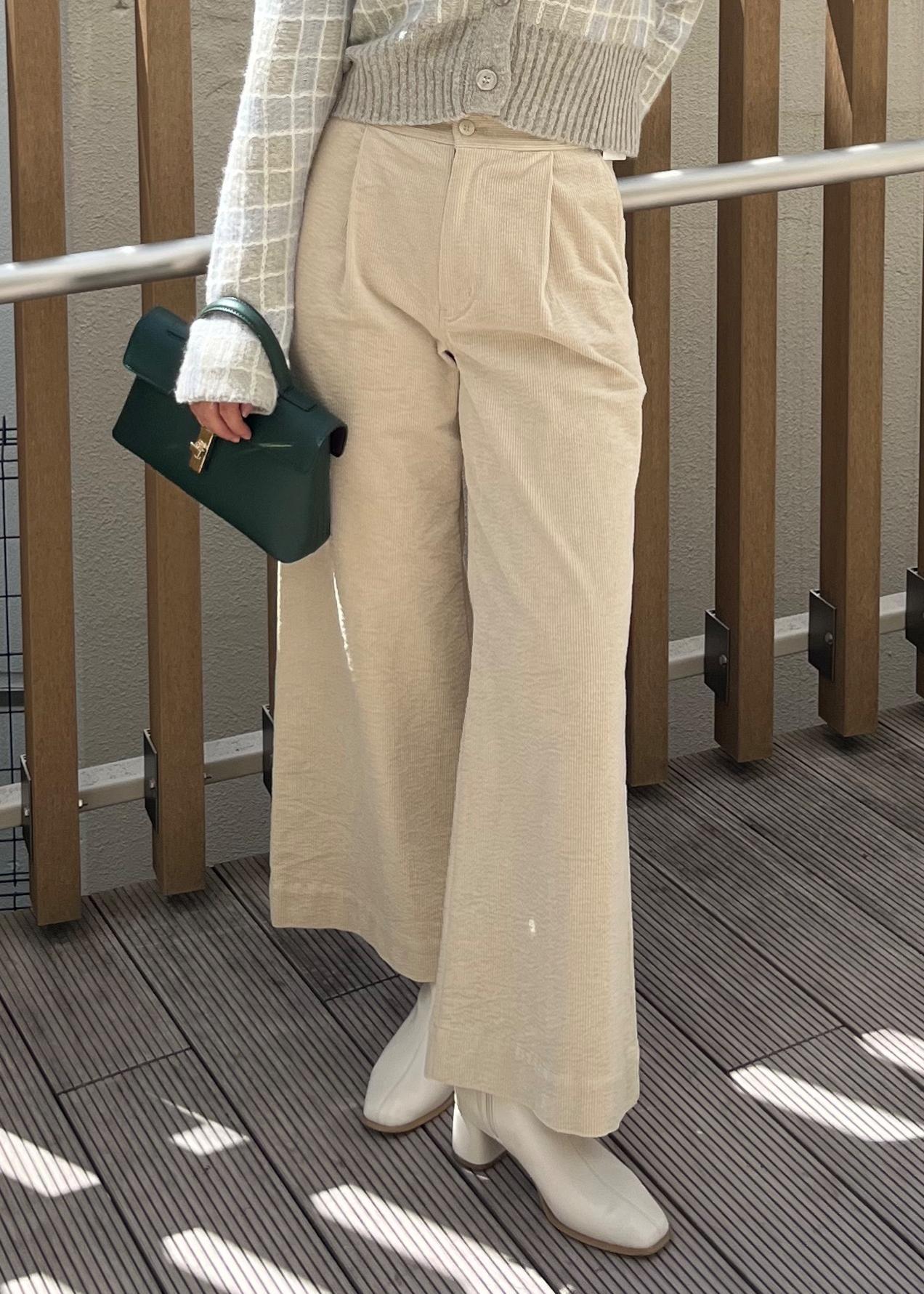 コーデュロイ素材ですが、タックが入っていて腰回りもたつかず、すっきり着られます◎ -