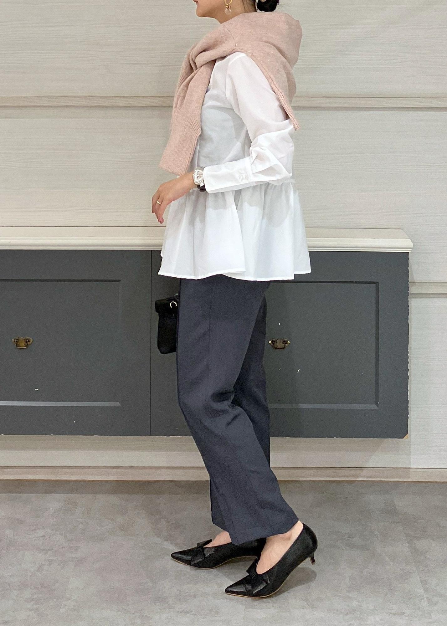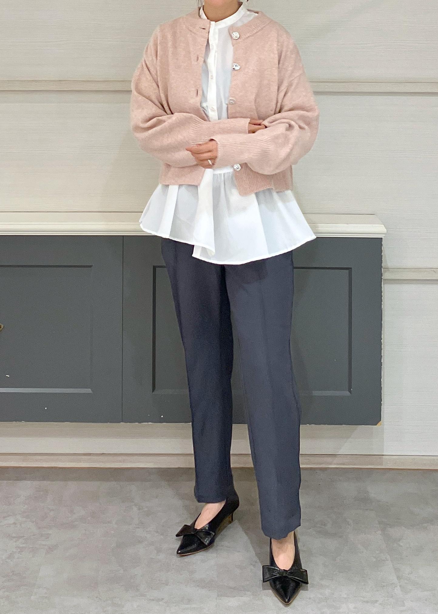 シャツとテーパードパンツのシンプルコーデには差し色で優しいピンクのカーディガンが合いました◎