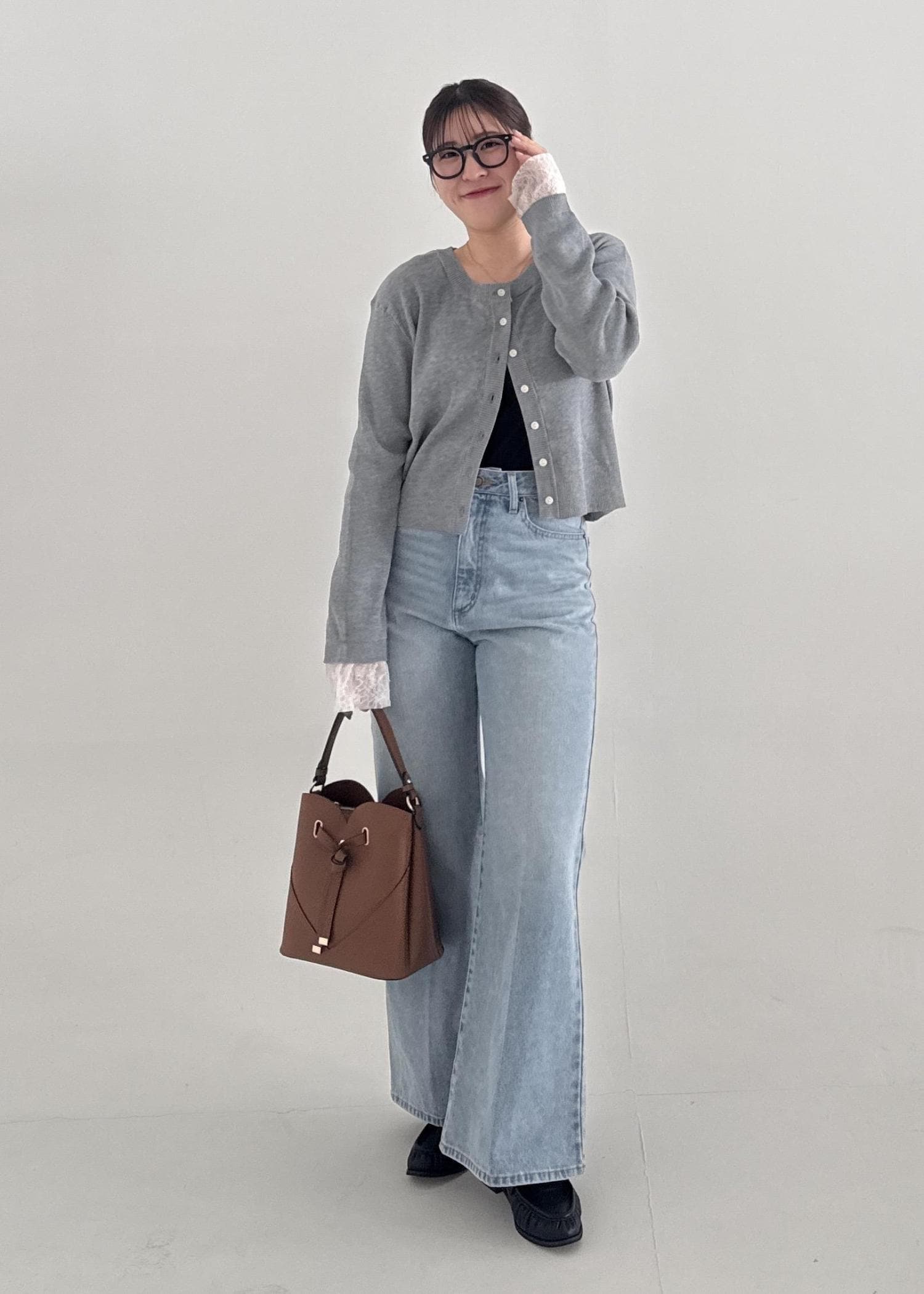 シャツは着丈が長めなのでショート丈のカーディガンを合わせてバランスが良くなるようなコーデにしました!