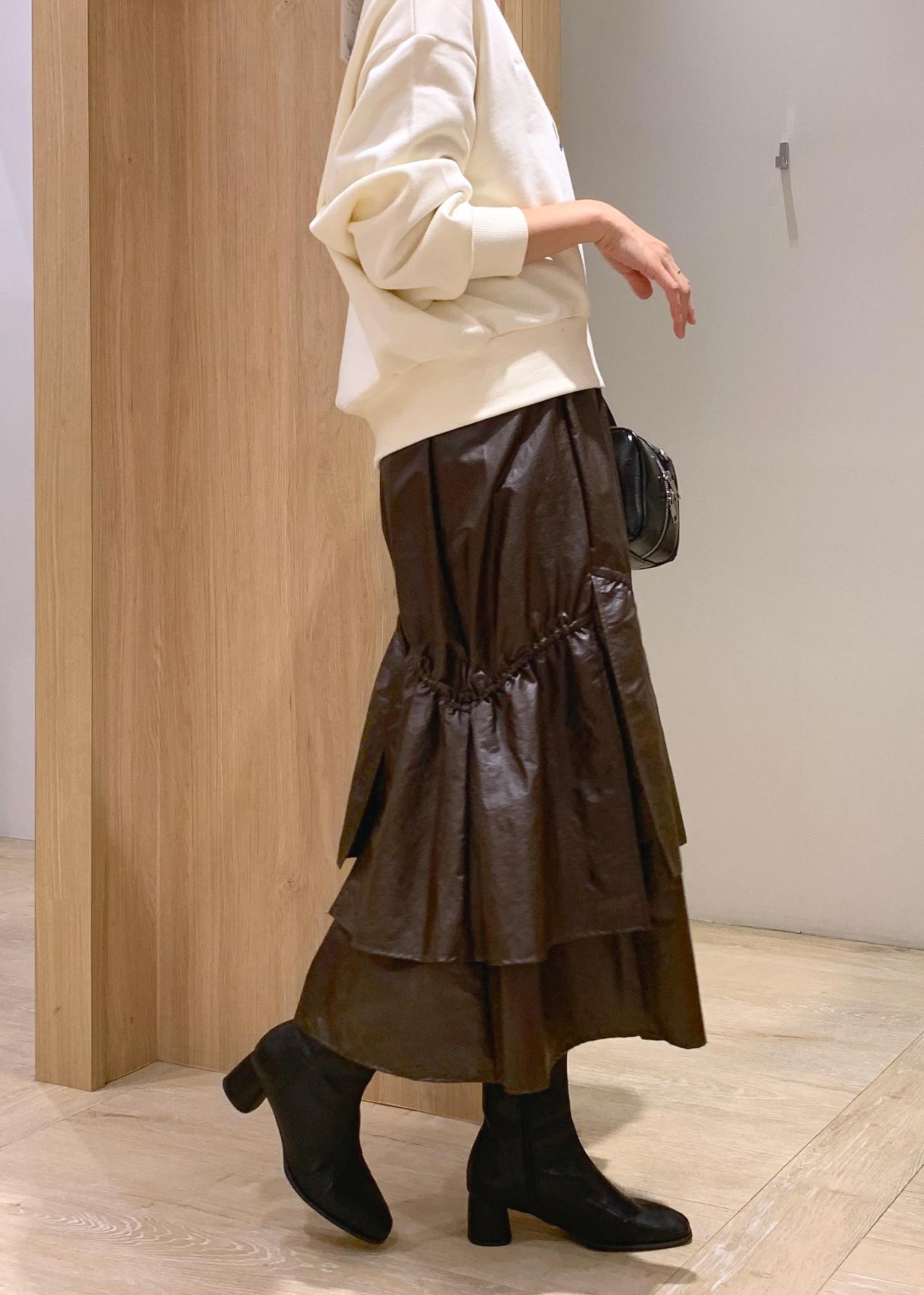 アウトレットVISチンツ加工ギャザーロングスカートダークブラウン系 / F¥3,164レビュー着用感としては重みなく、ハリ感も強すぎず軽い質感です。裏地は付いてないですが、透け感なく着用でき、冬場は中にタイツも着込みやすいです◎