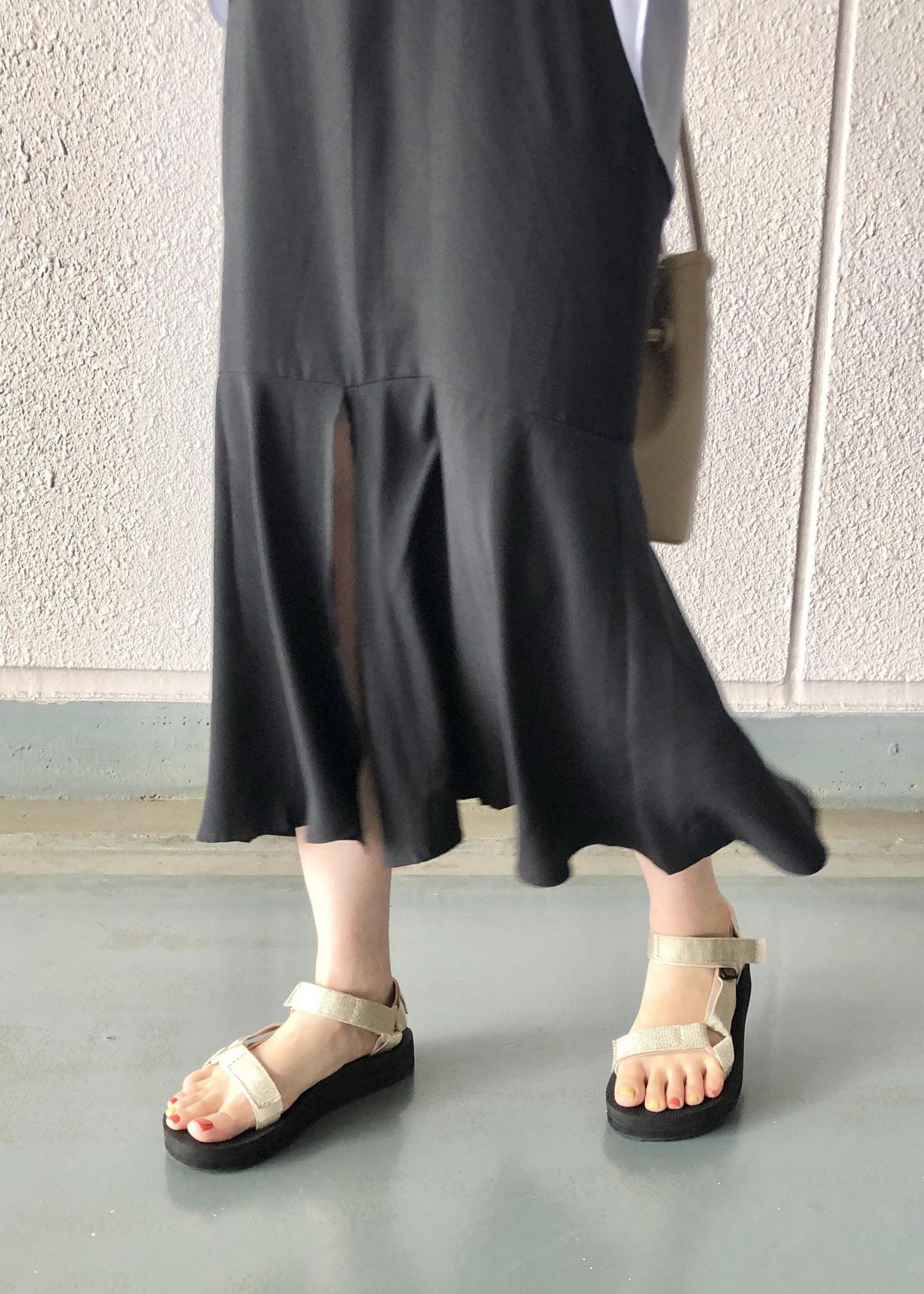 綺麗めシルエットのキャミワンピースに トレンドのシアーブラウスを合わせました。 ワンピースとトップスは、モノトーンカラーで合わせて、よりブラウスのカラーが映えるように。 キャミワンピは、インナーを変えるだけで様々なスタイルを楽しめる1枚です。
