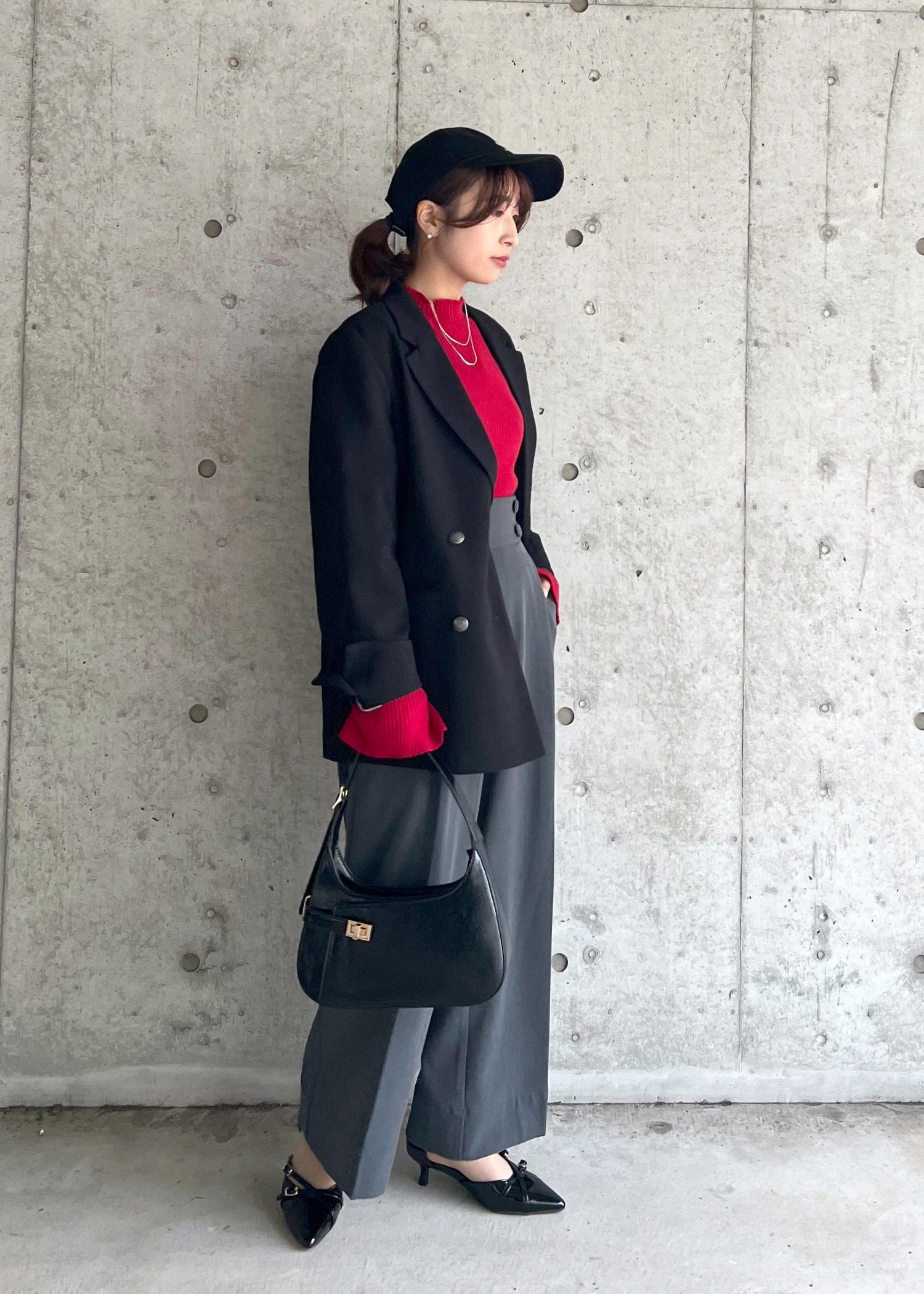 赤のインナーをポイントに、ブラックトーンでシックにまとめたクールカジュアルコーディネートです。