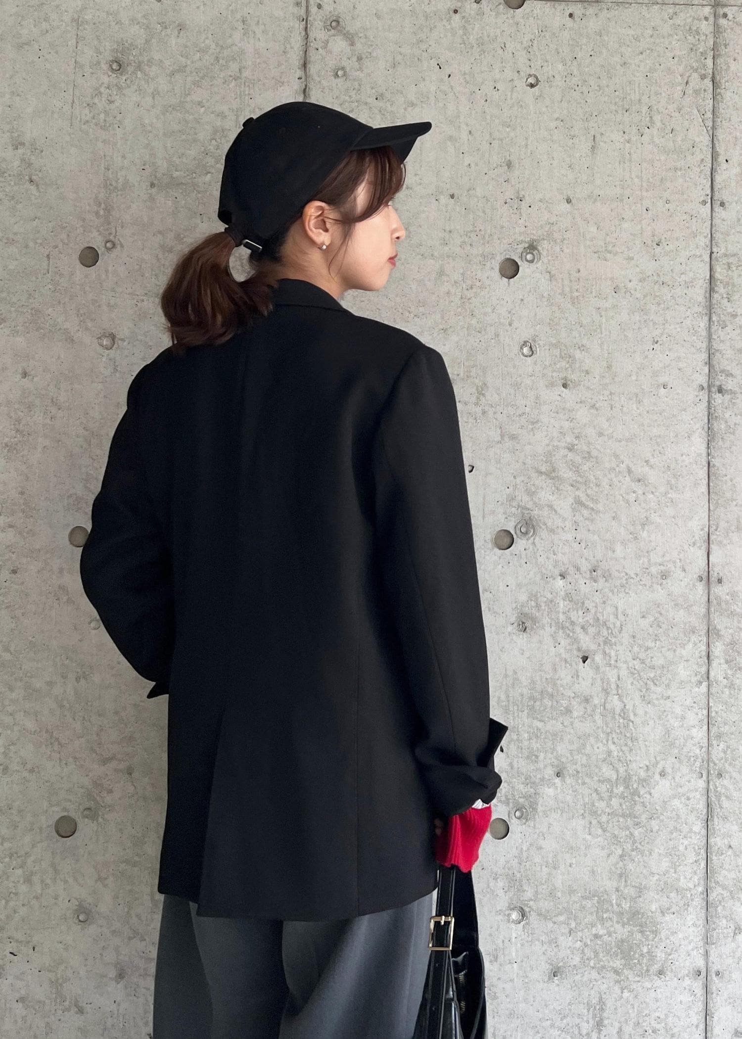 インナーのレッドがアクセント!ブラックカジュアルコーデ