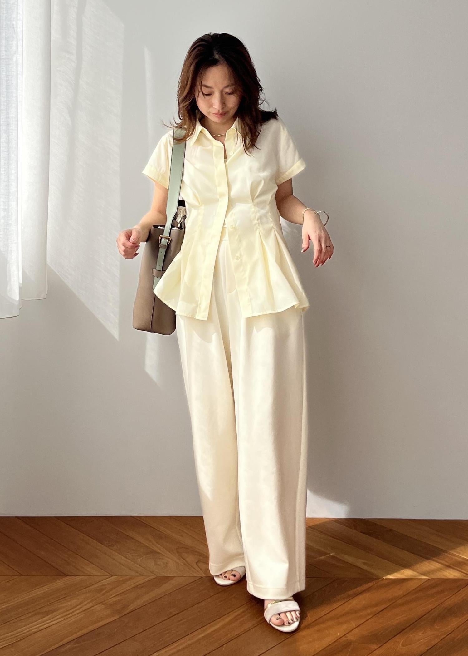 VIS【美easy】ウーリッシュ2タックワイド/スラックスパンツ【洗える】ブラック / S¥5,929レビュー152cmでSサイズ着用し、着丈はペタンコ靴で床につかない丈。通常SSサイズを着用する事が多いですが、かかとが見える位の長さだったので、ワンサイズあげて床スレスレの長め丈にしました。ウエストはボタンで調節できるので安心です。シワになりにくく、太すぎないシルエットがとてもキレイなパンツ!woolの様な素材感で高見え効果◎です