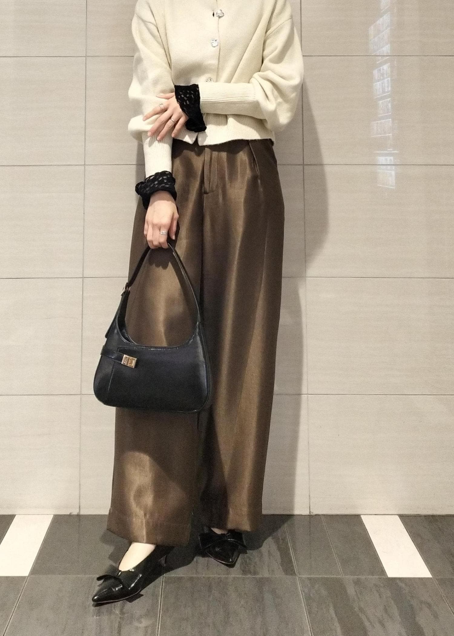 アウトレットVIS【洗える】シャイニーワンタックワイドパンツダークブラウン / M¥2,307レビュー光沢感がポイントのワイドパンツ♪