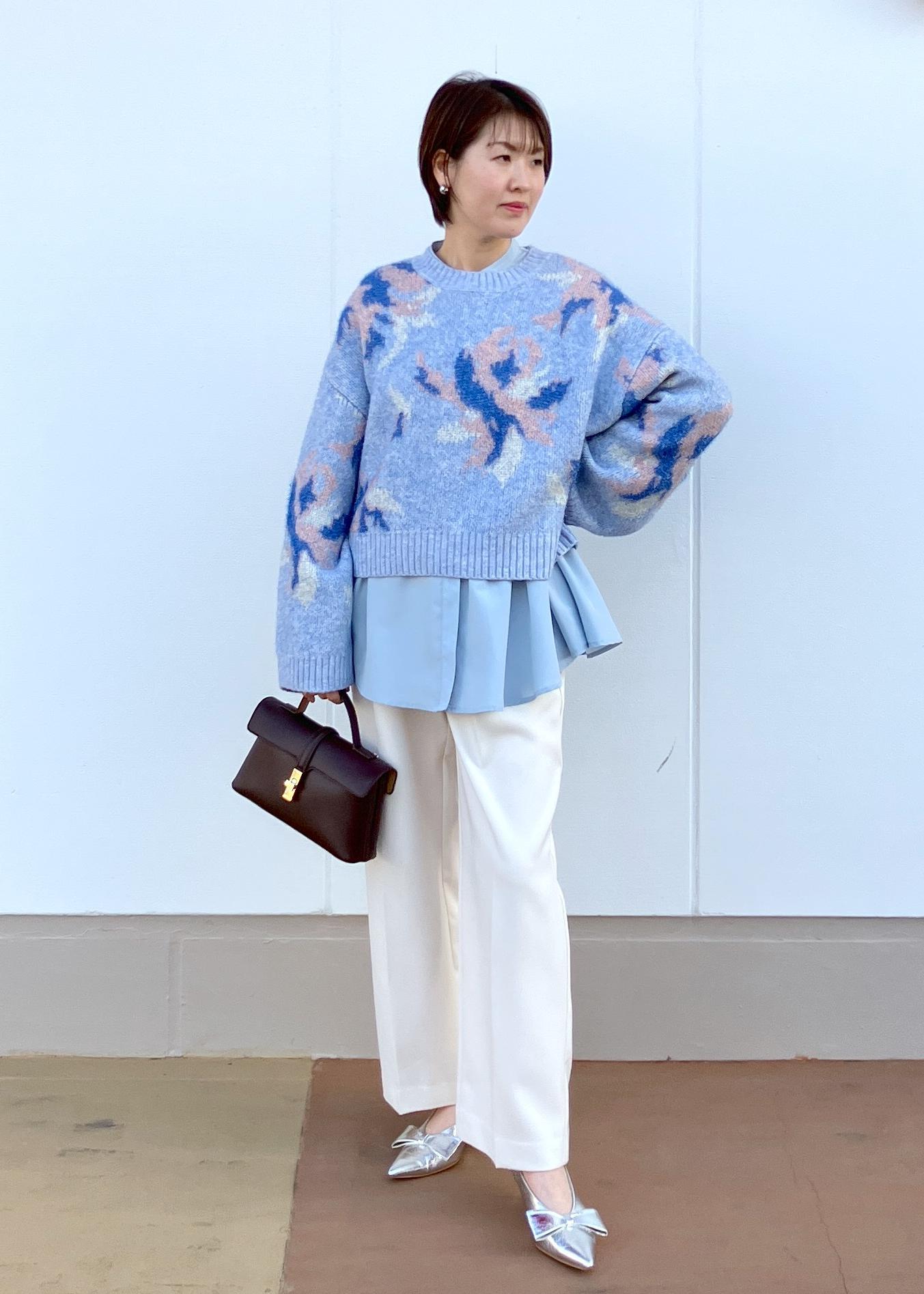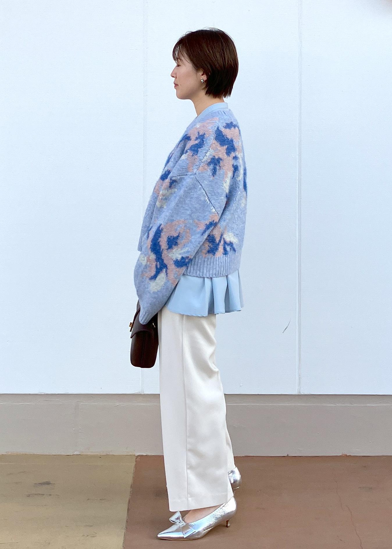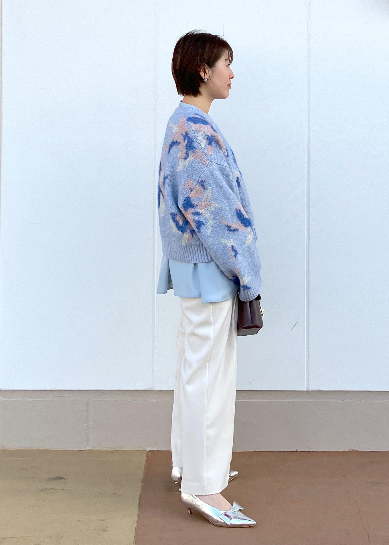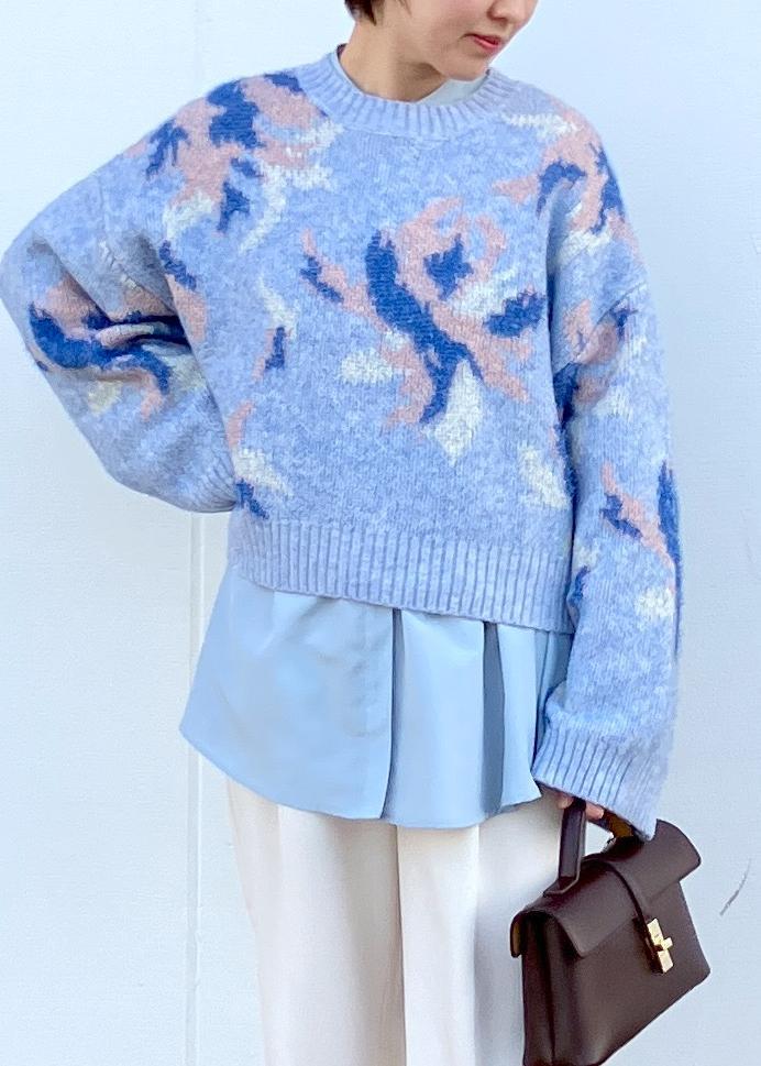 アウトレットVISフラワージャガードニットプルオーバーブルー系 / F¥2,636レビューフラワージャガードで華やかさ漂うゆるりとしたシルエットのニットです!ゆったりとしたシルエットでウエスト丈なのでボトムス合わせがしやすいです!花柄ですがぼかしのある柔らかな雰囲気で甘くなりすぎません!1枚着もしていただけます!