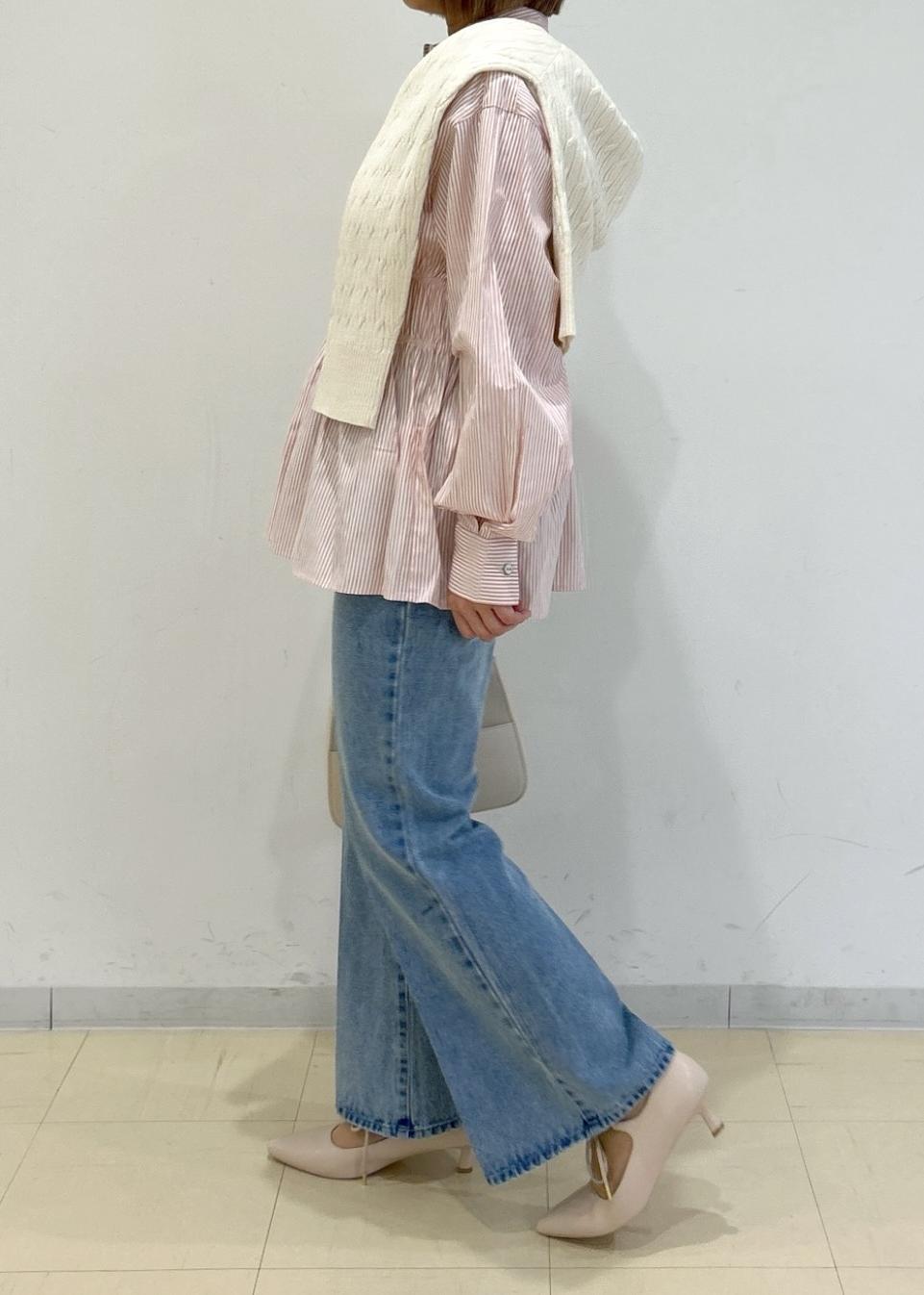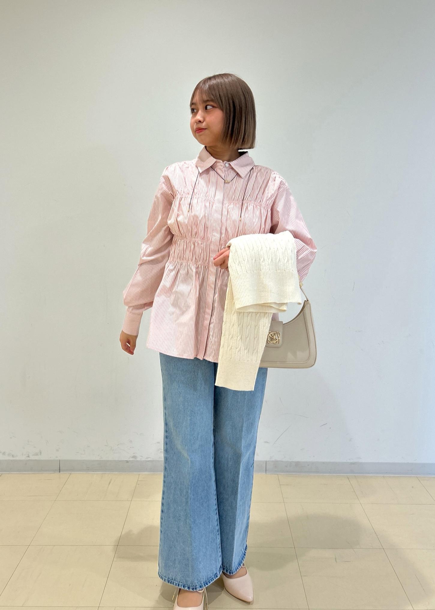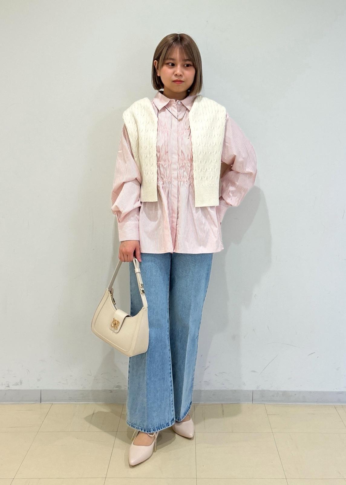 シャツをデニムに合わせ、カラーを春カラーのピンクとアイボリーでまとめることで春らしいコーディネートにしました♪