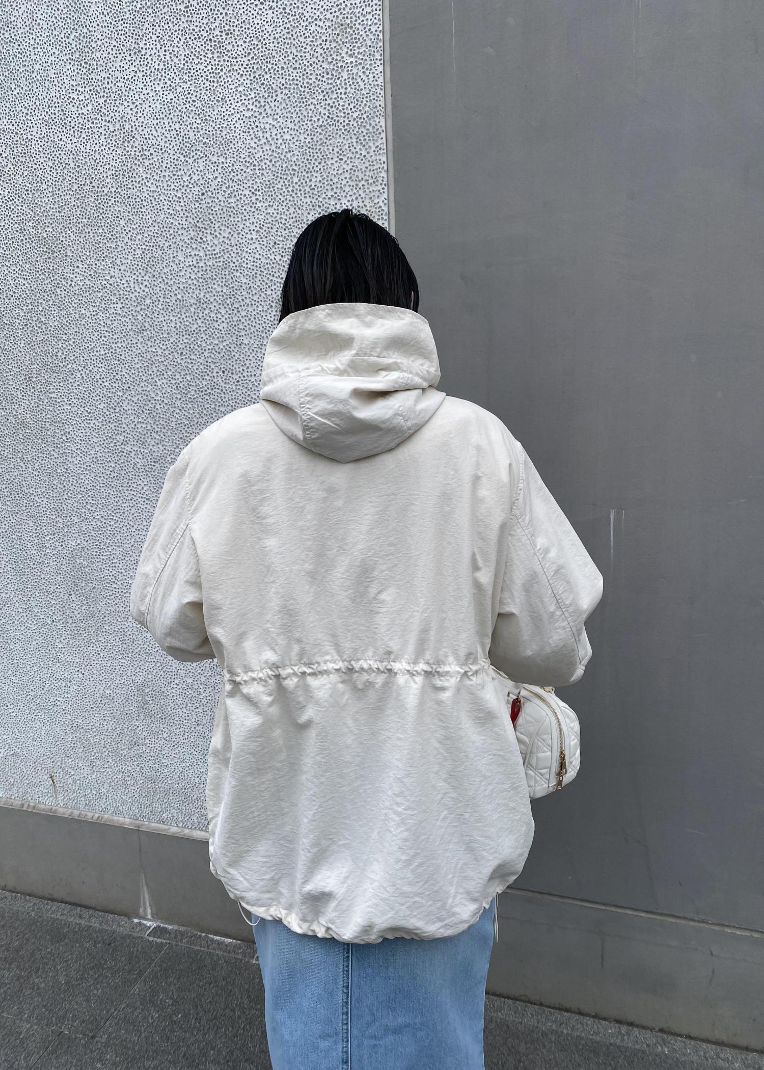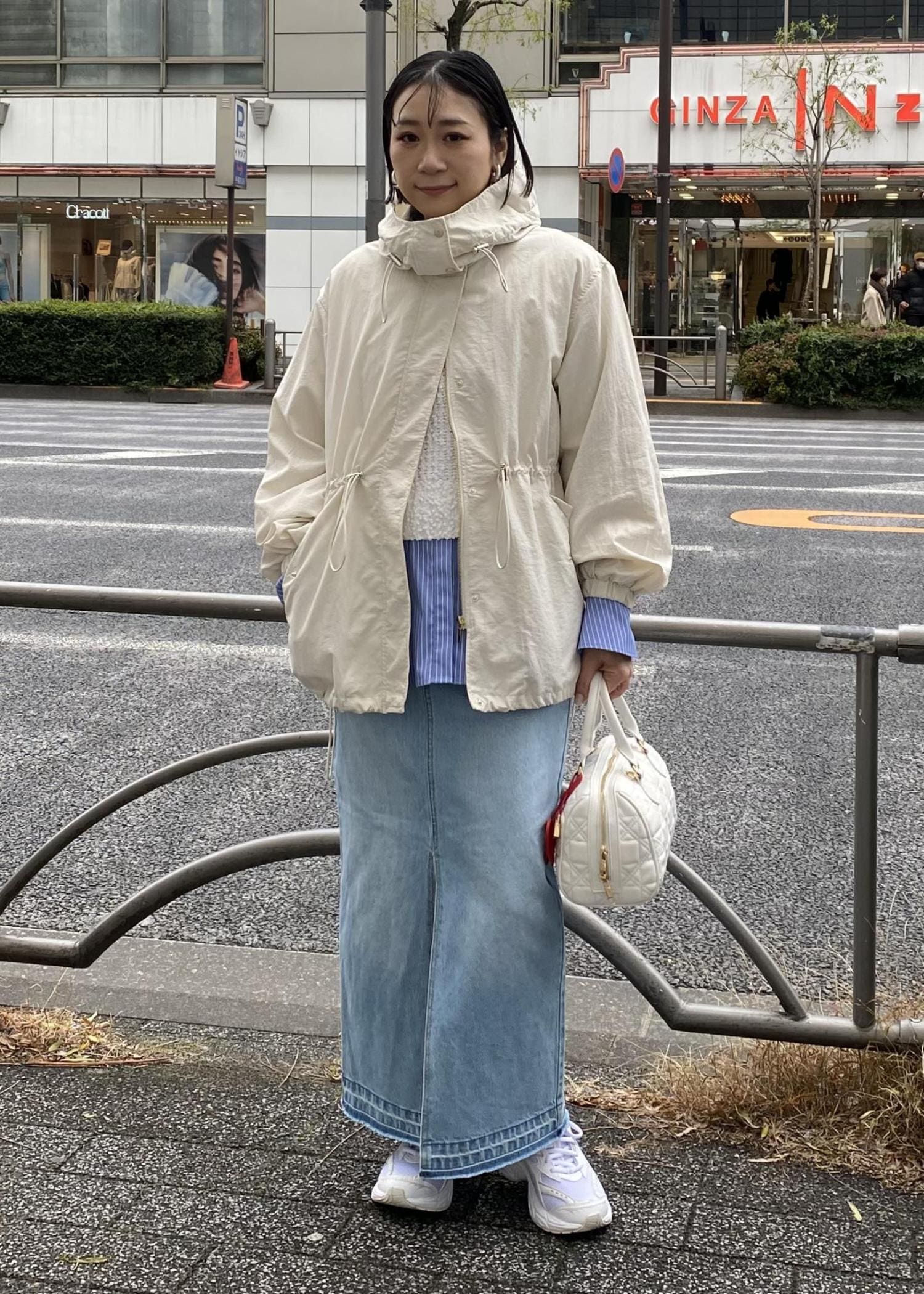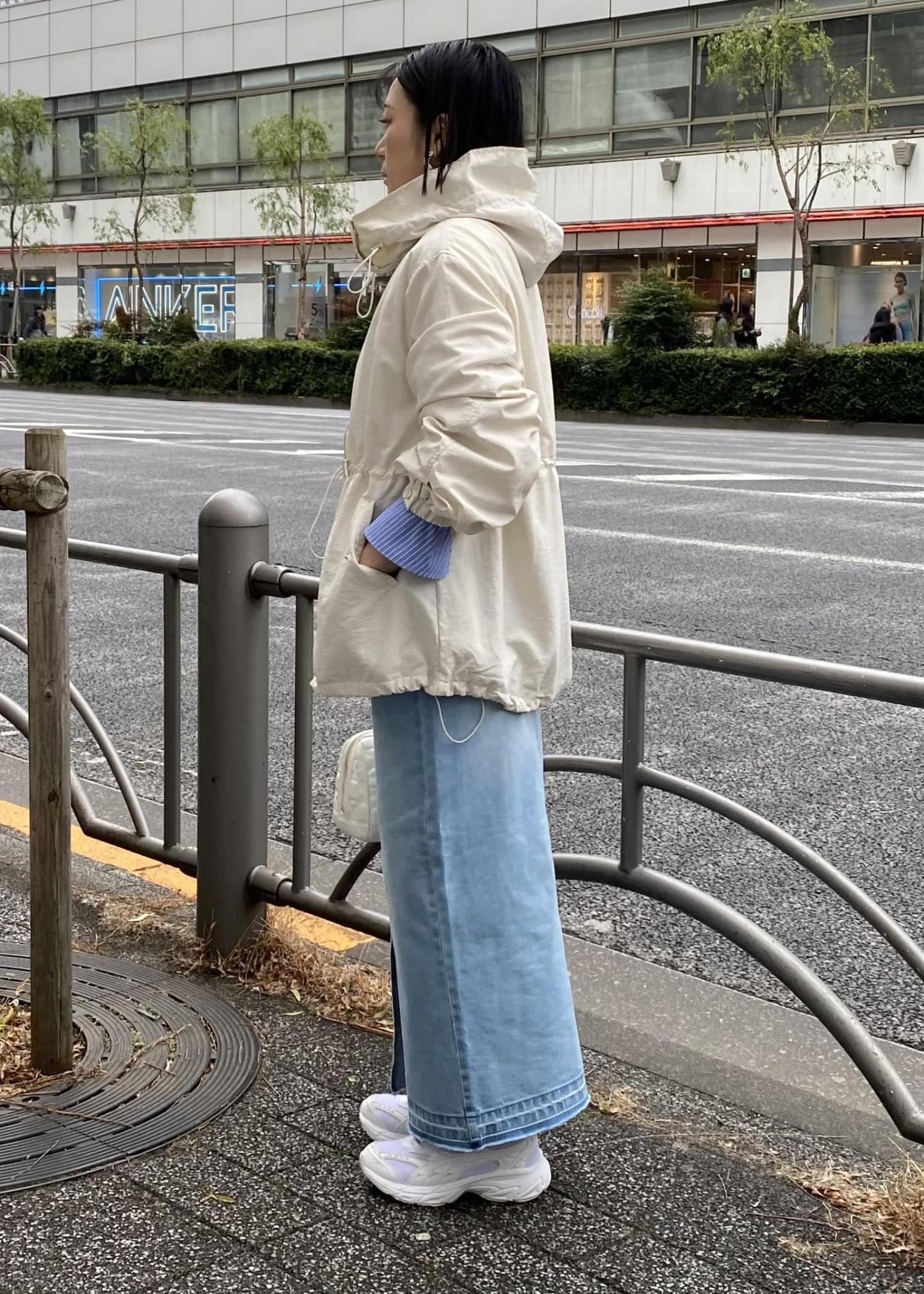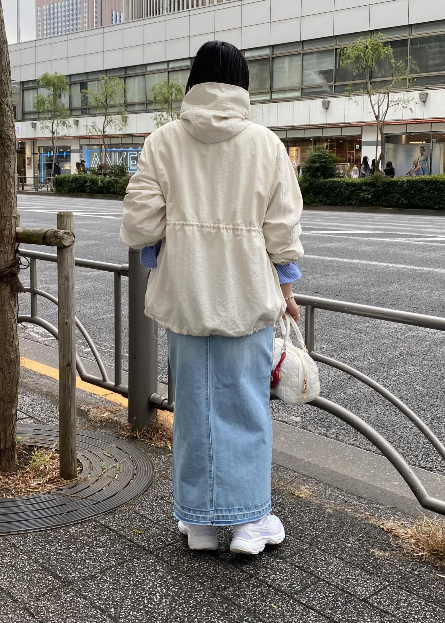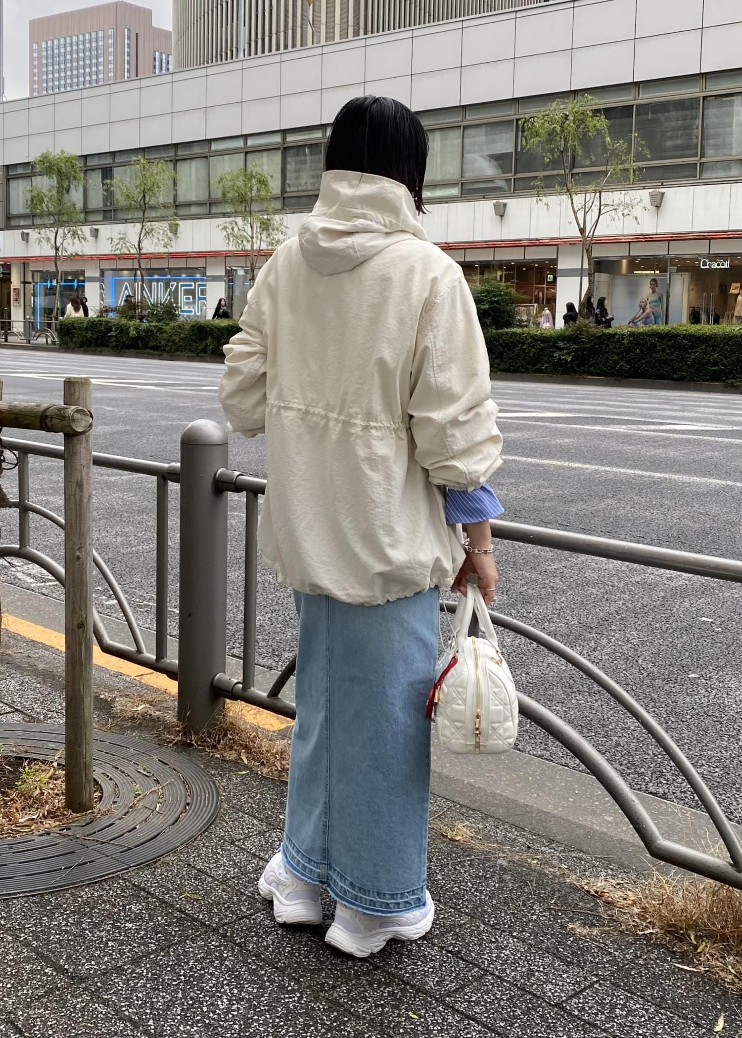 今年のマンパはウエスト絞れるタイプで、サラッと羽織ってもウエストマークするだけで少しスタイル良く見えます◎