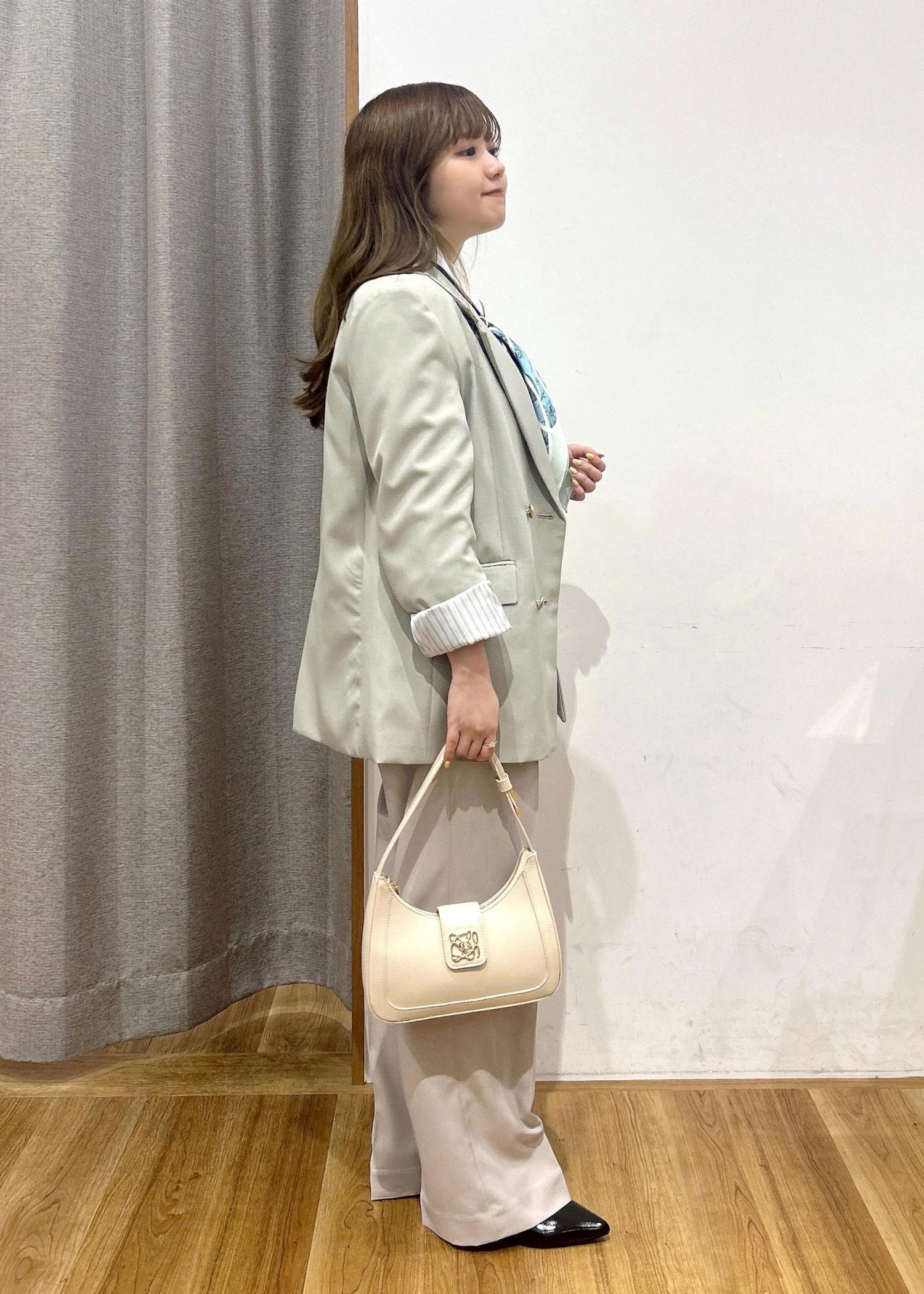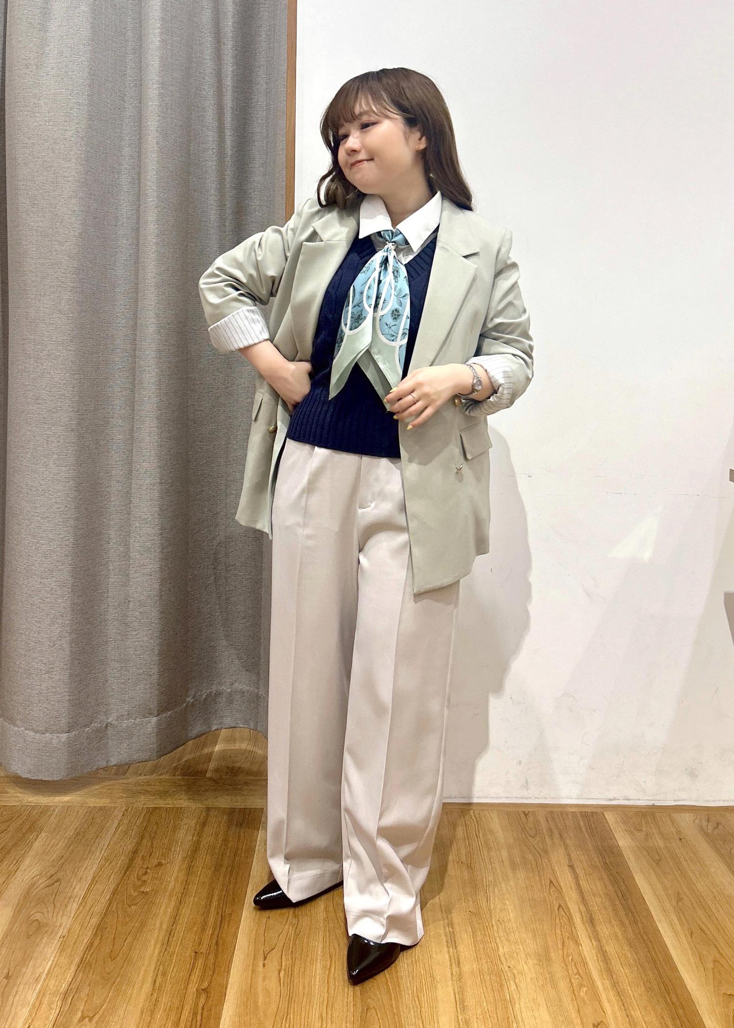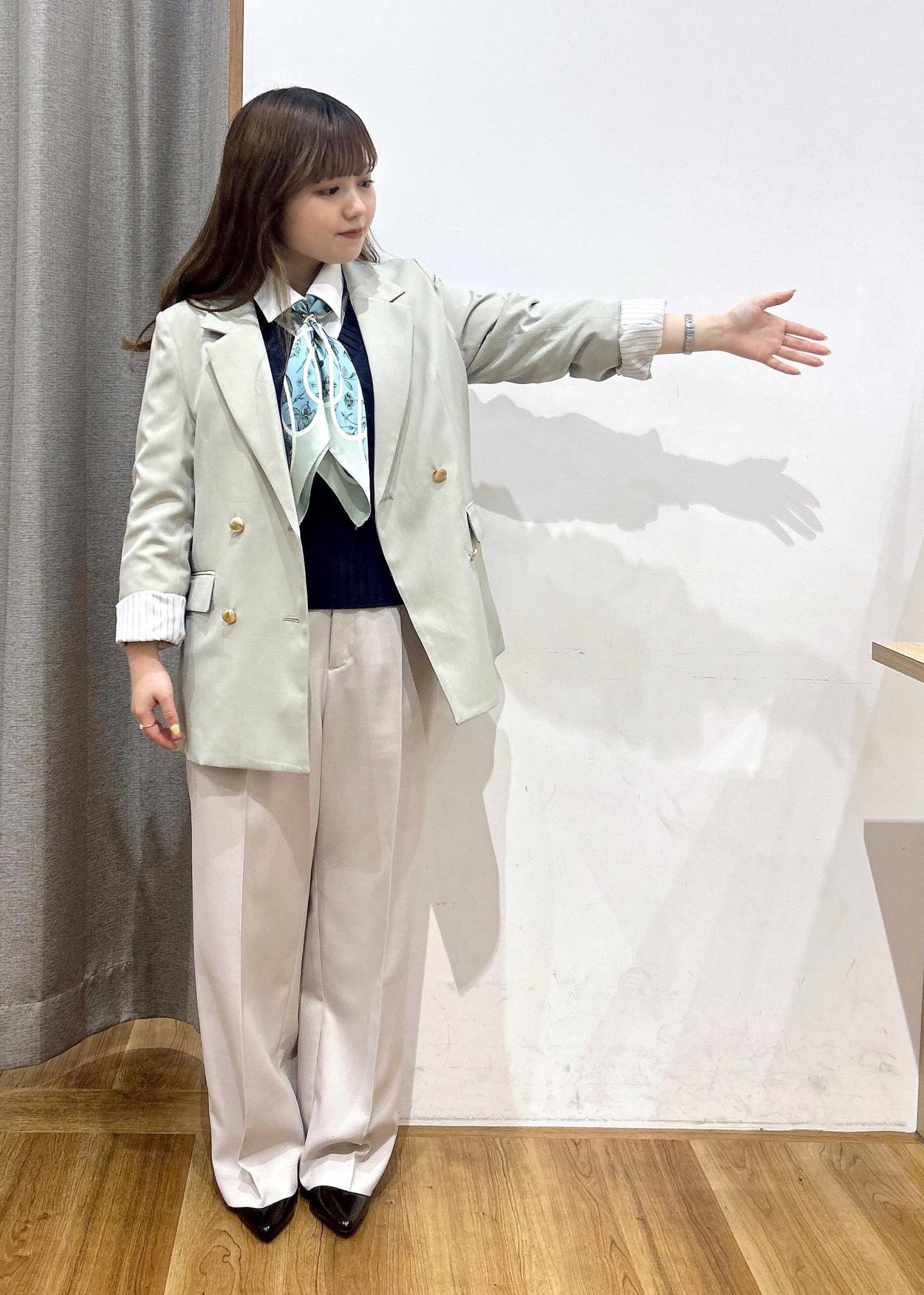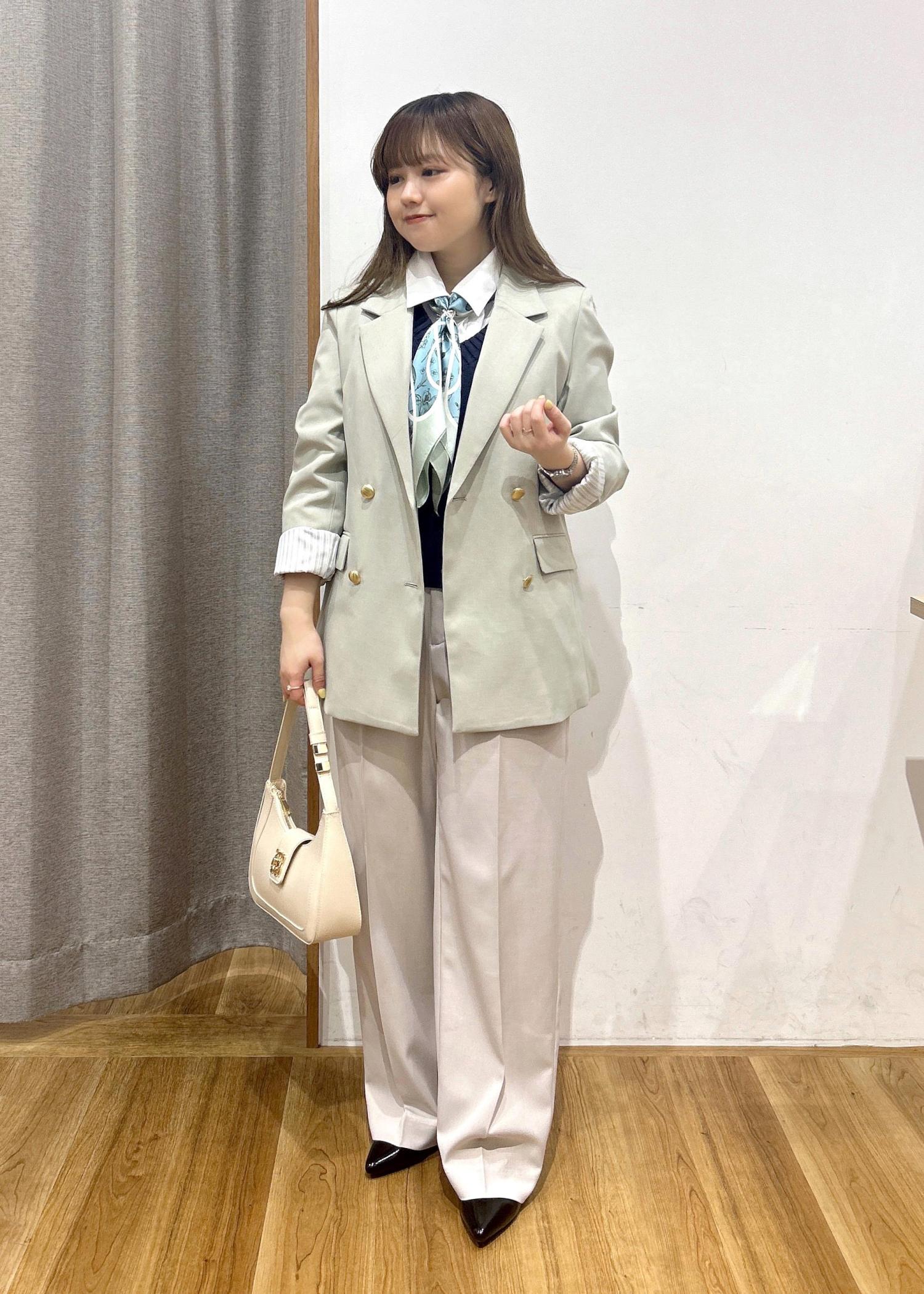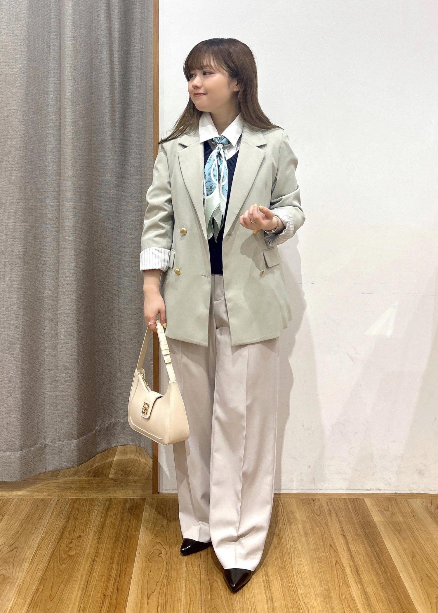 トレンド感あるスカーフをアクセントに、春っぽい色のグリーンをメインにした、ジャケットとストレートパンツのセットアップでコーディネートを組んでみました!