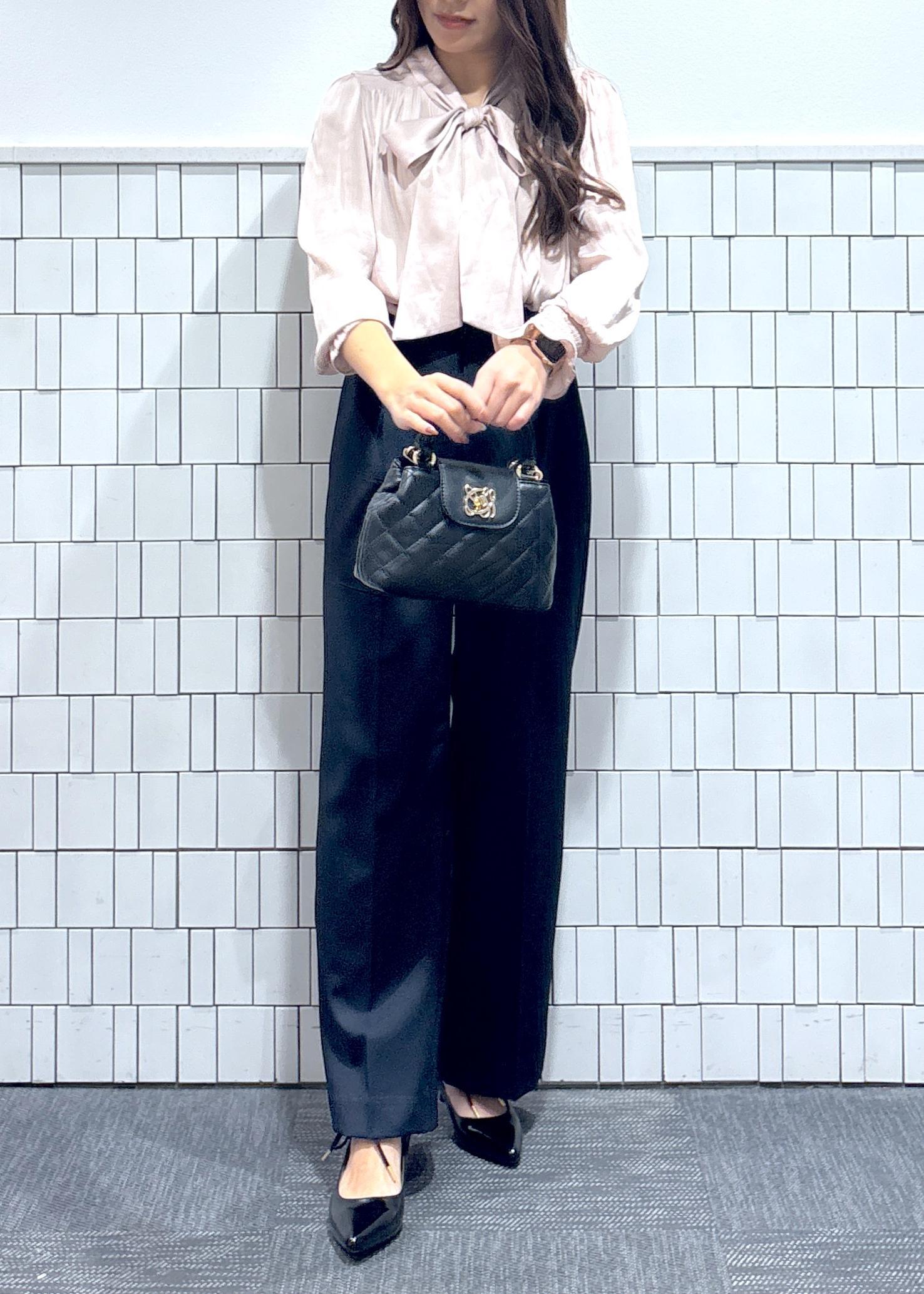 暗めのネイビーなので、ピンクのブラウスを合わせて可愛らしさも出しました☺︎