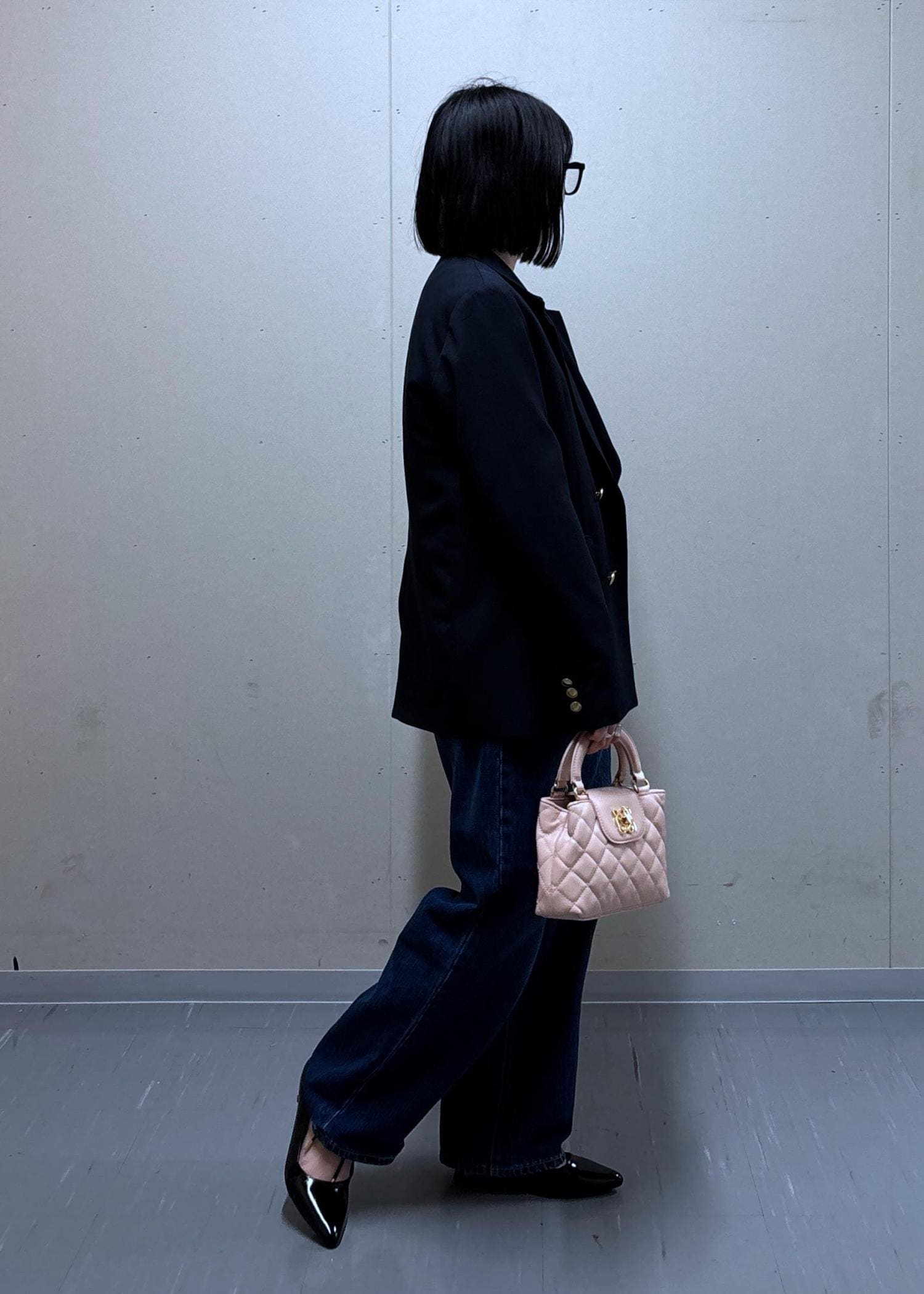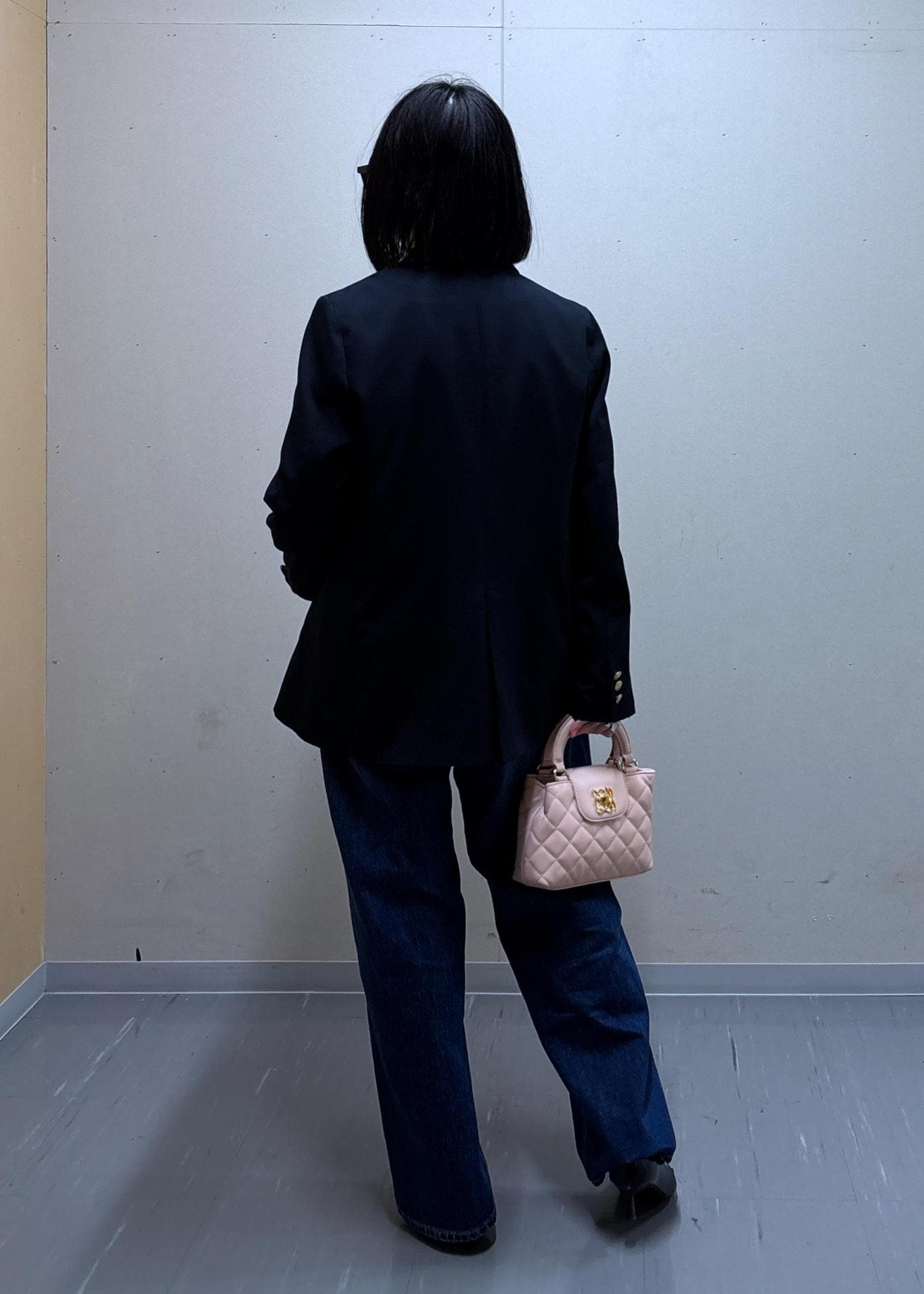 ネイビーのジャケットとデニムを合わせて大人カジュアルな印象ですが、差し色のピンクでシンプルすぎないようにしました!