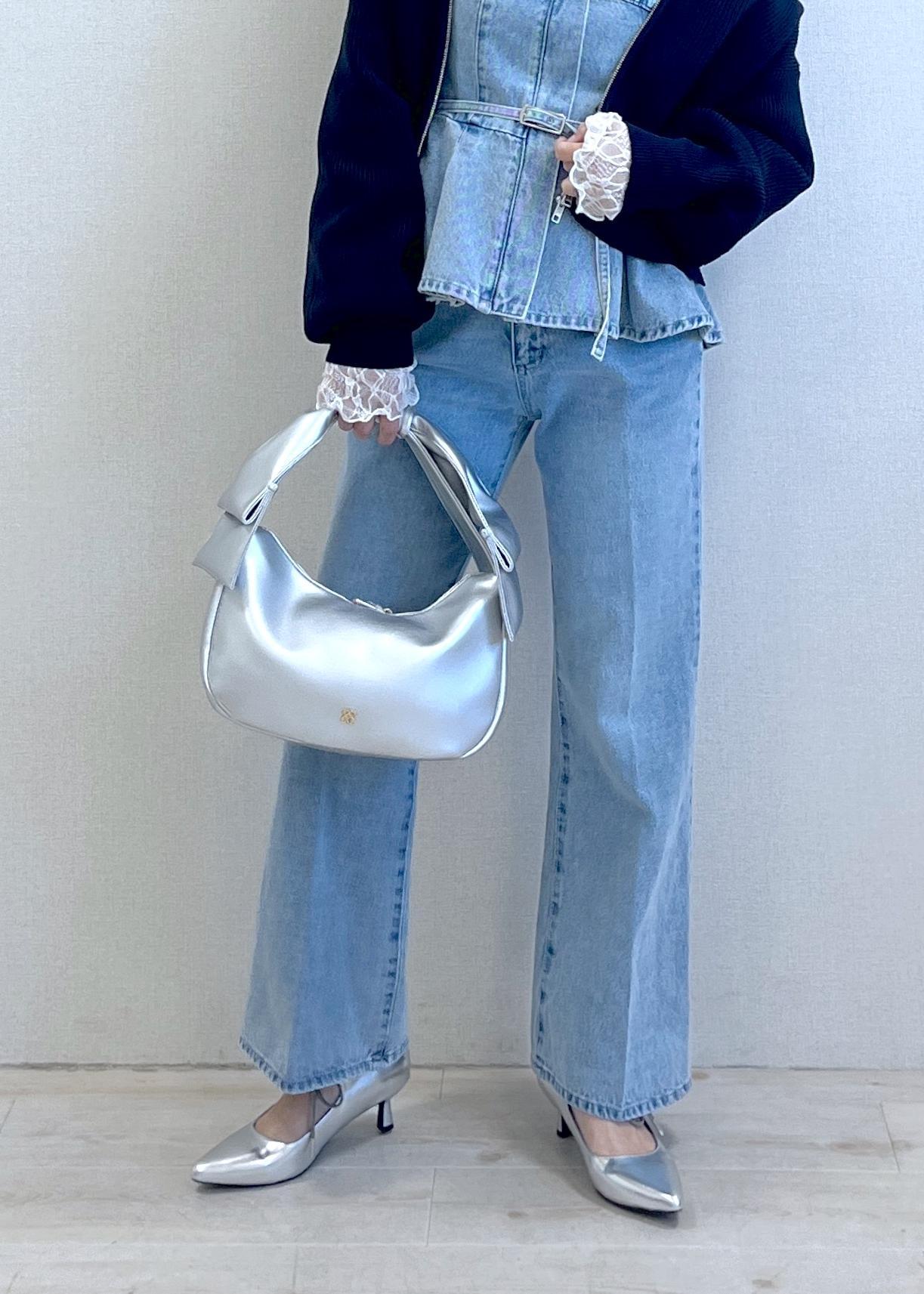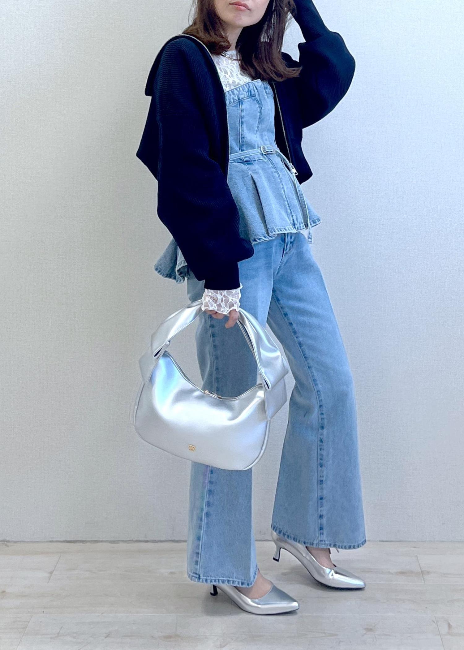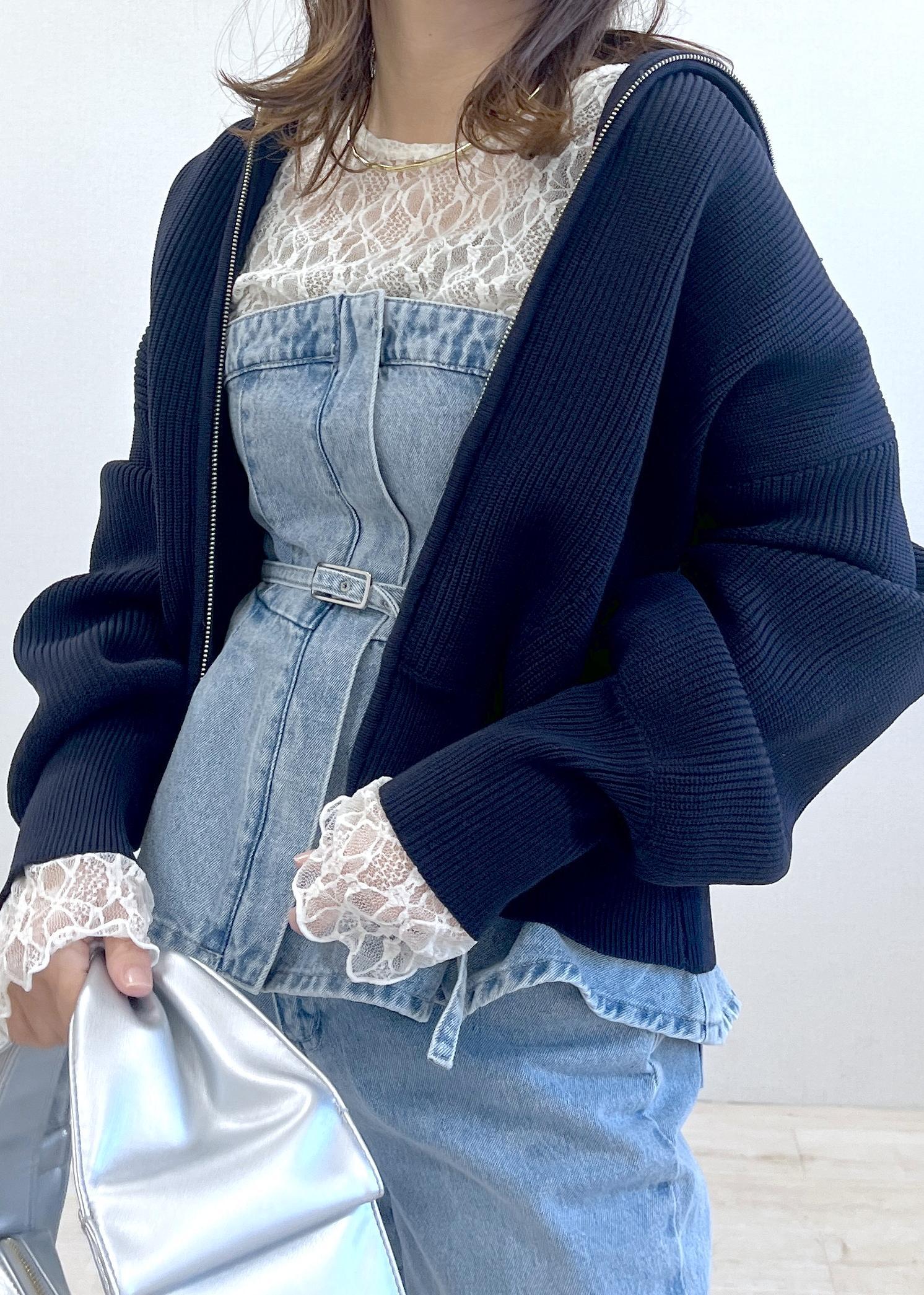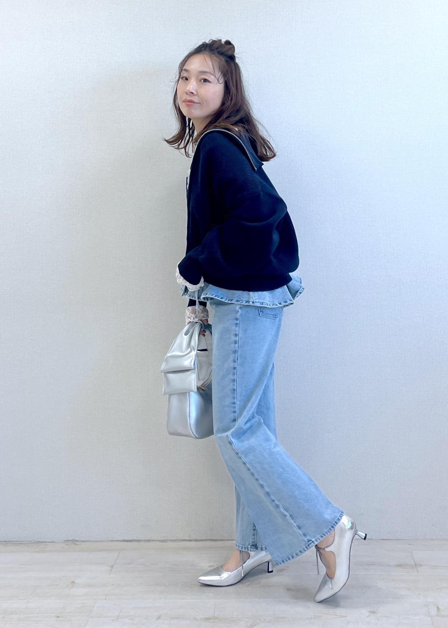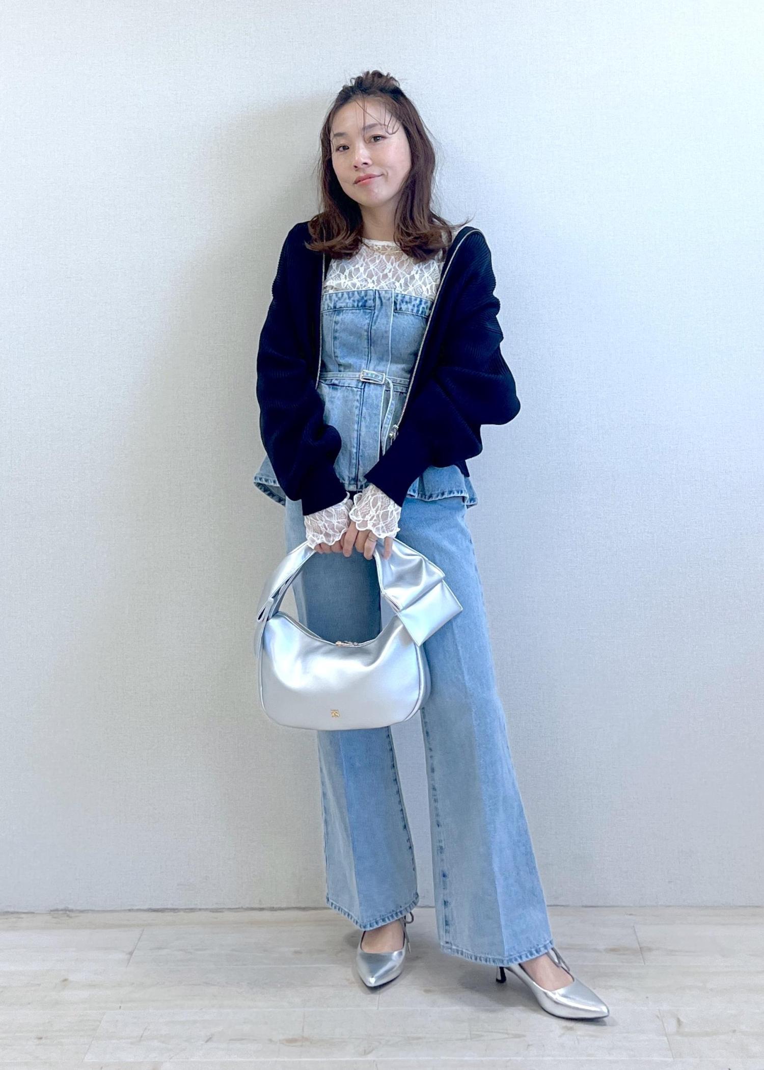 春らしくデニムセットアップにレースインナーとニットカーデで今からすぐに着られるイメージに