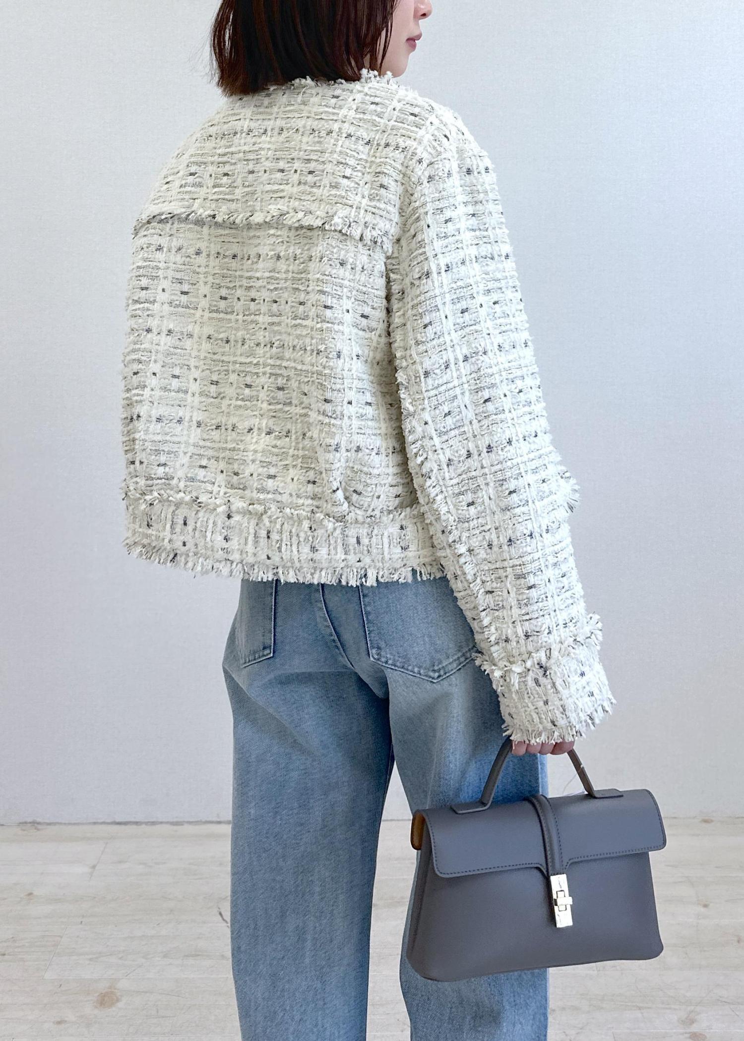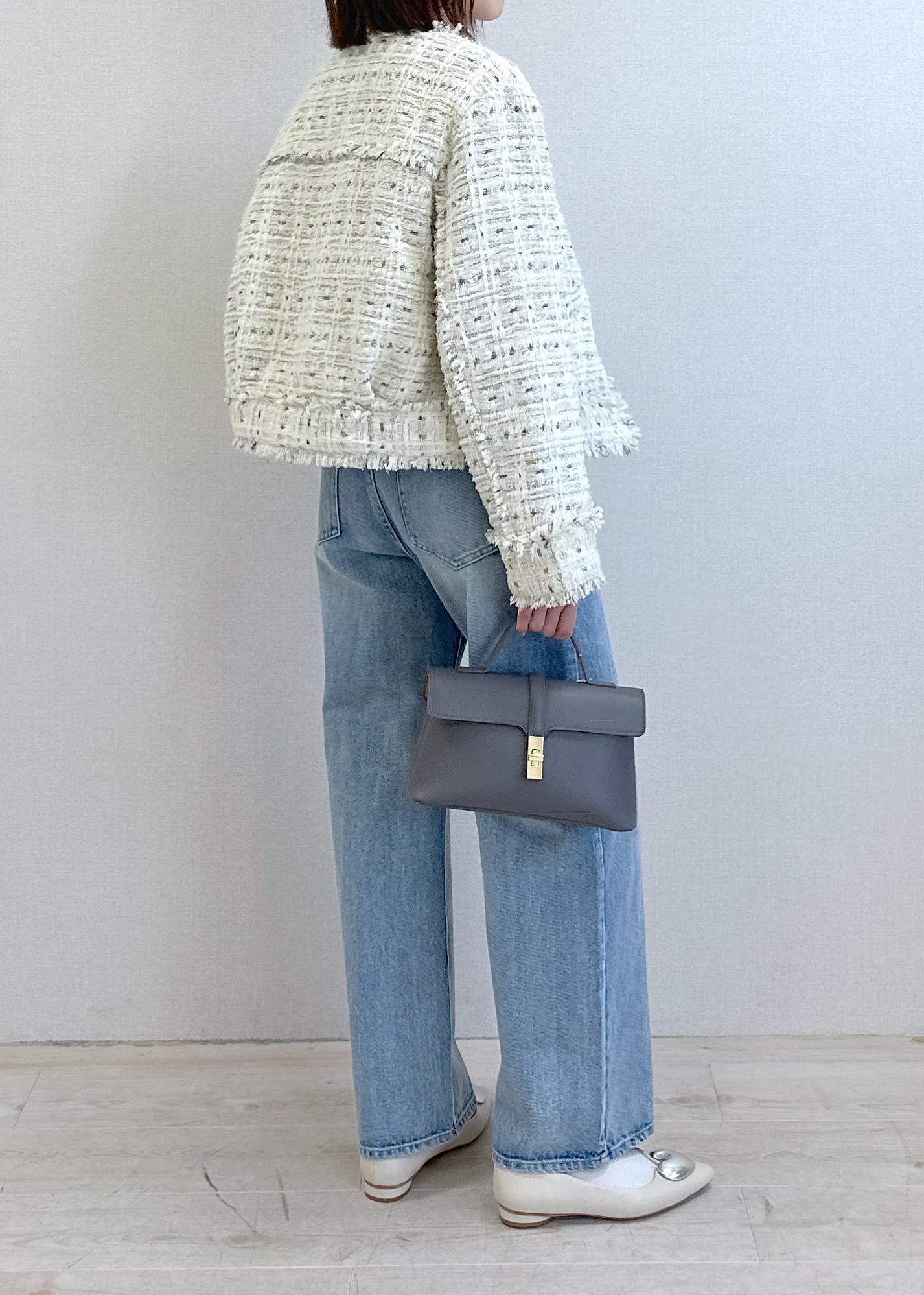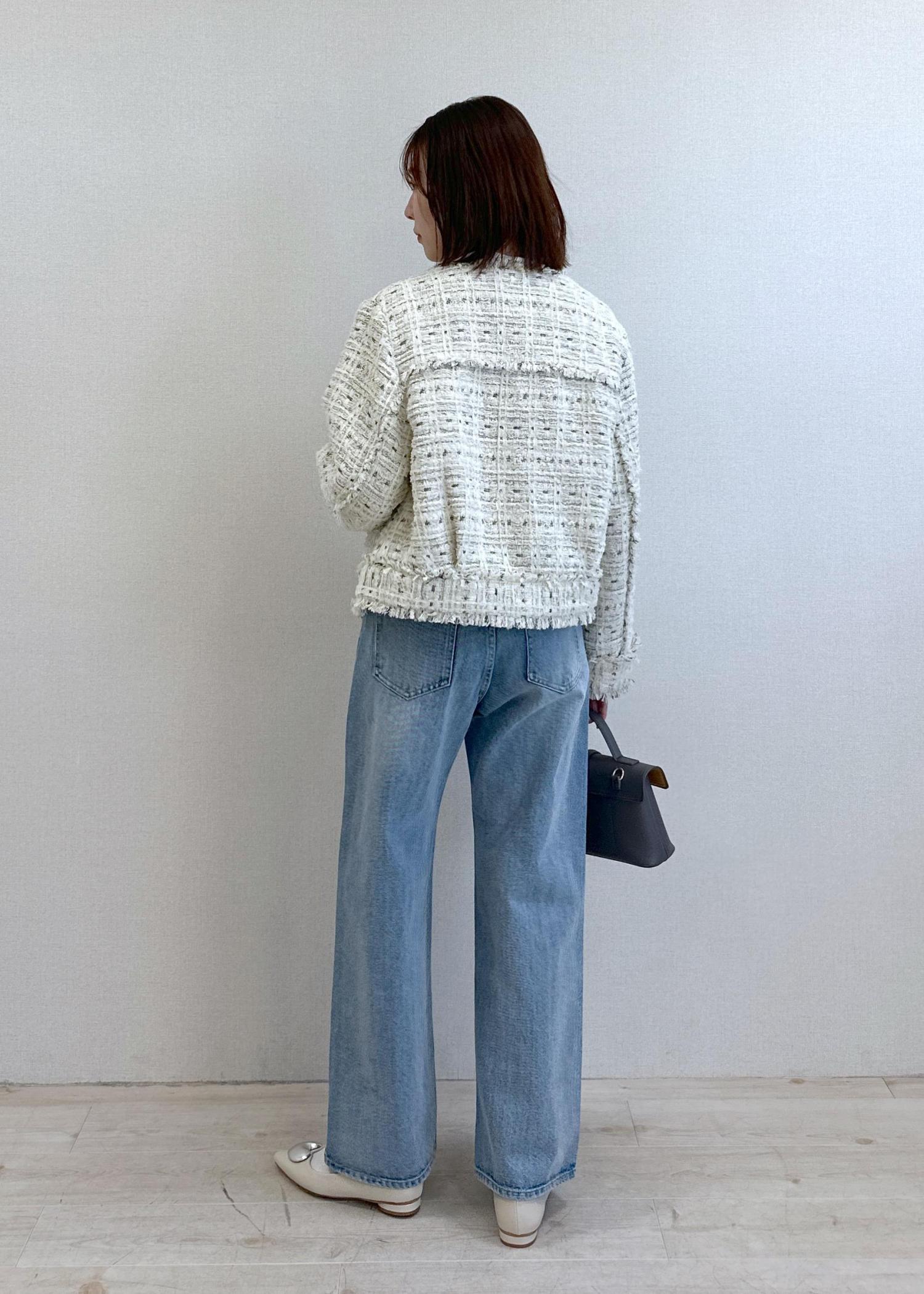 ツイードジャケット×デニムのきれいめカジュアルコーデ。