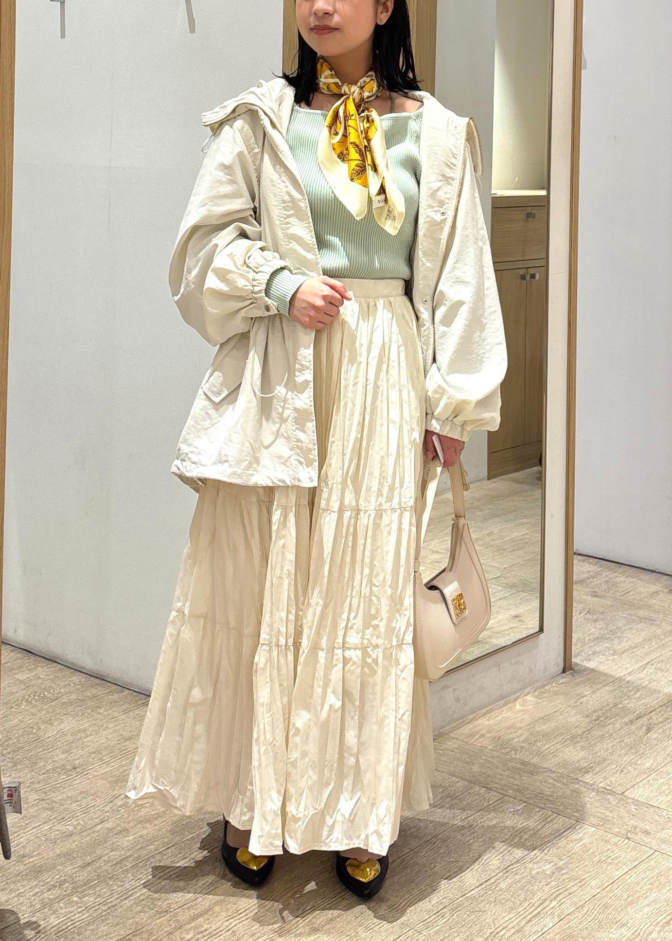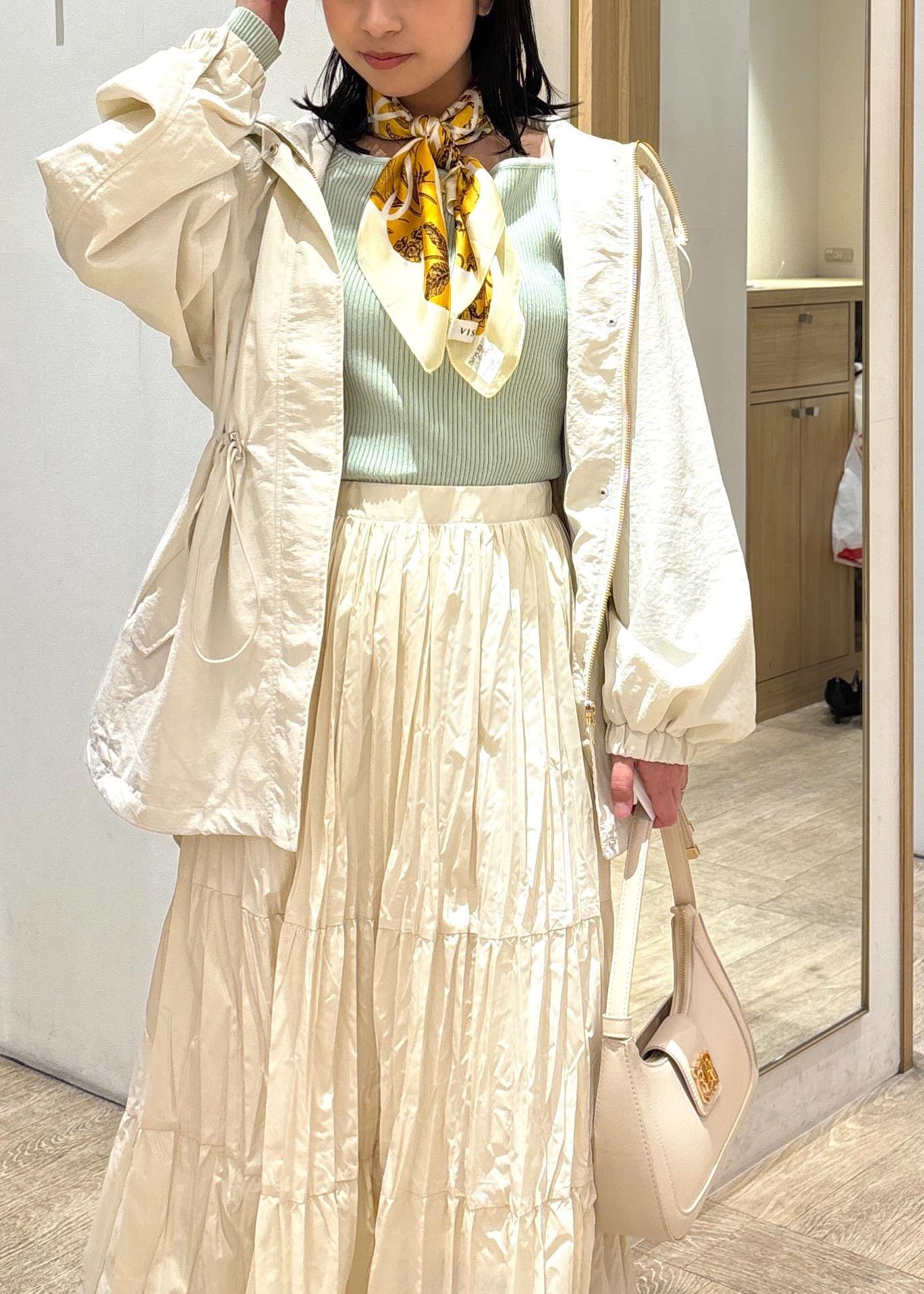 マウンテンパーカーを春カラーで女性らしく着こなすコーデです。