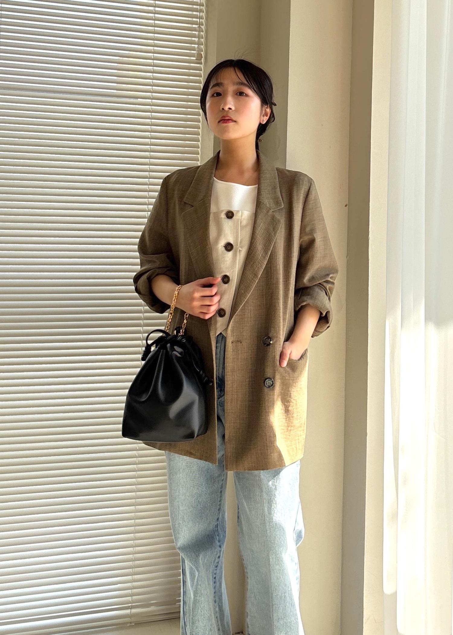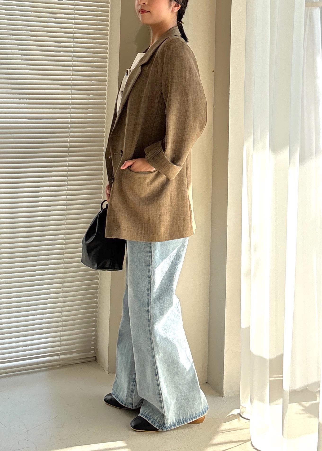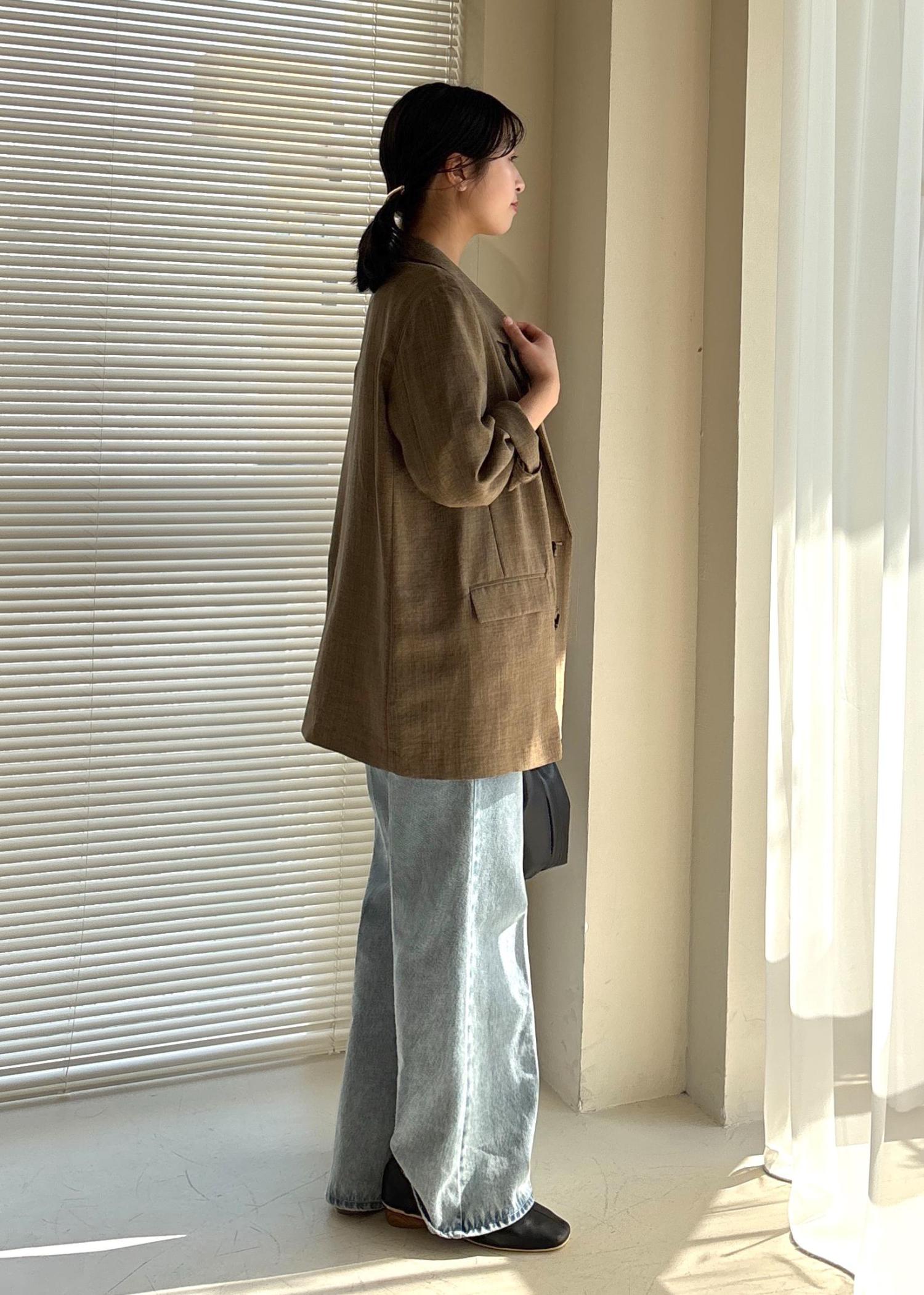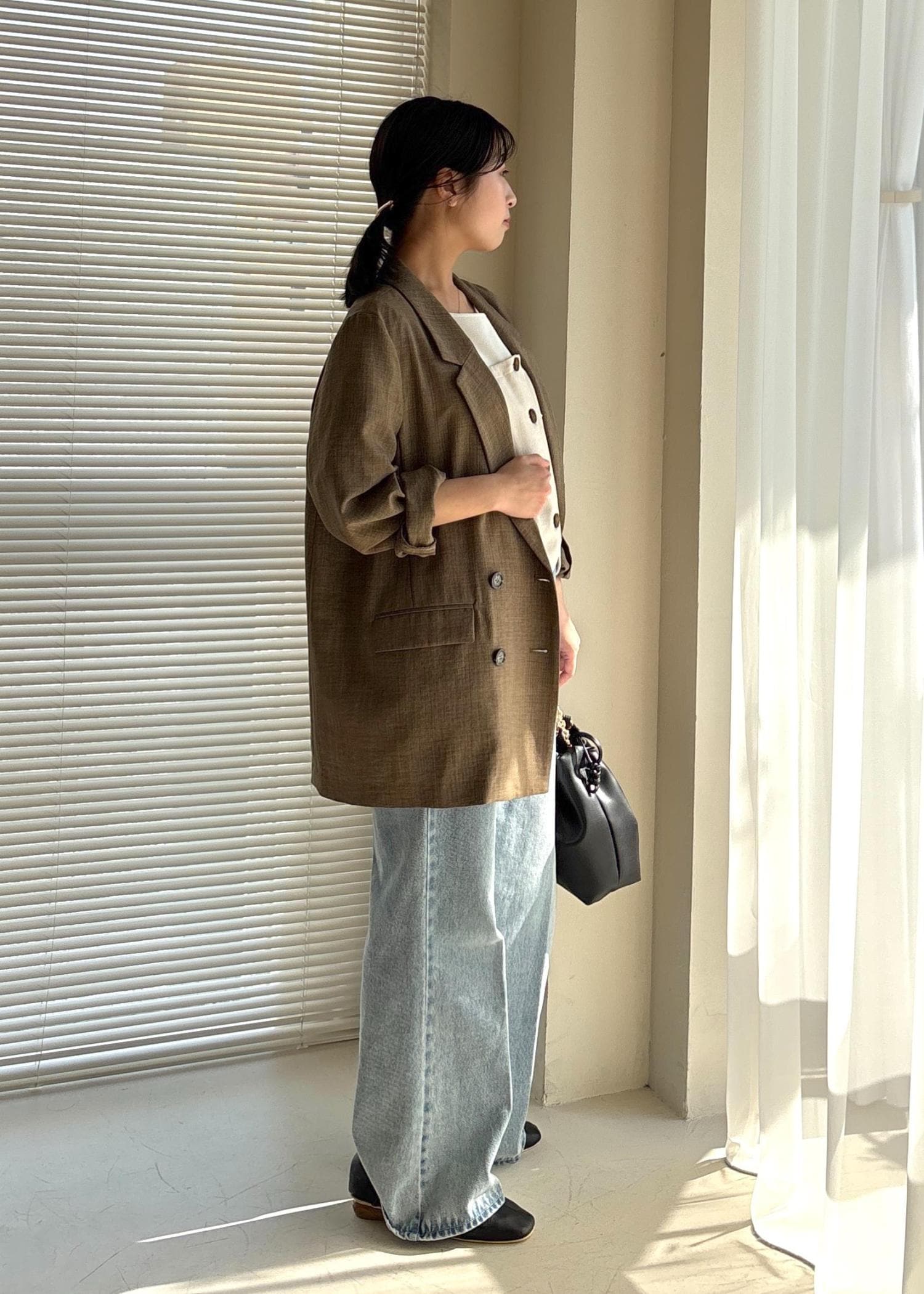 大人気の涼しいトップスをジャケット×デニムで大人カジュアルに着こなすコーデです。