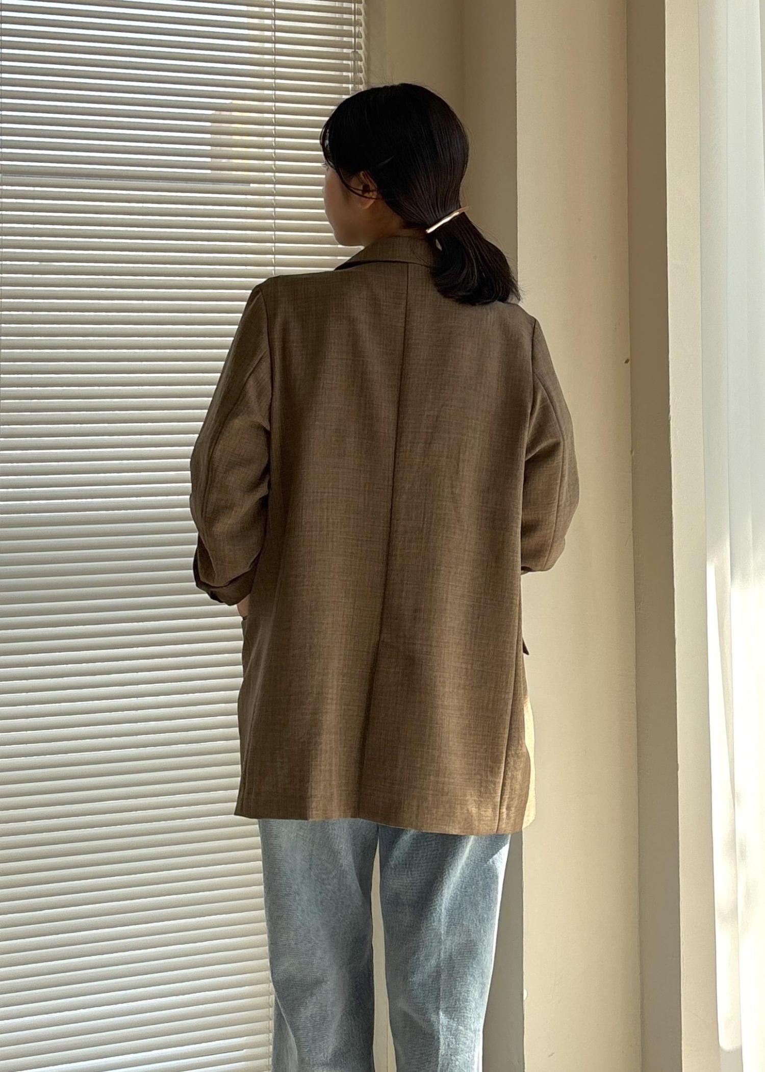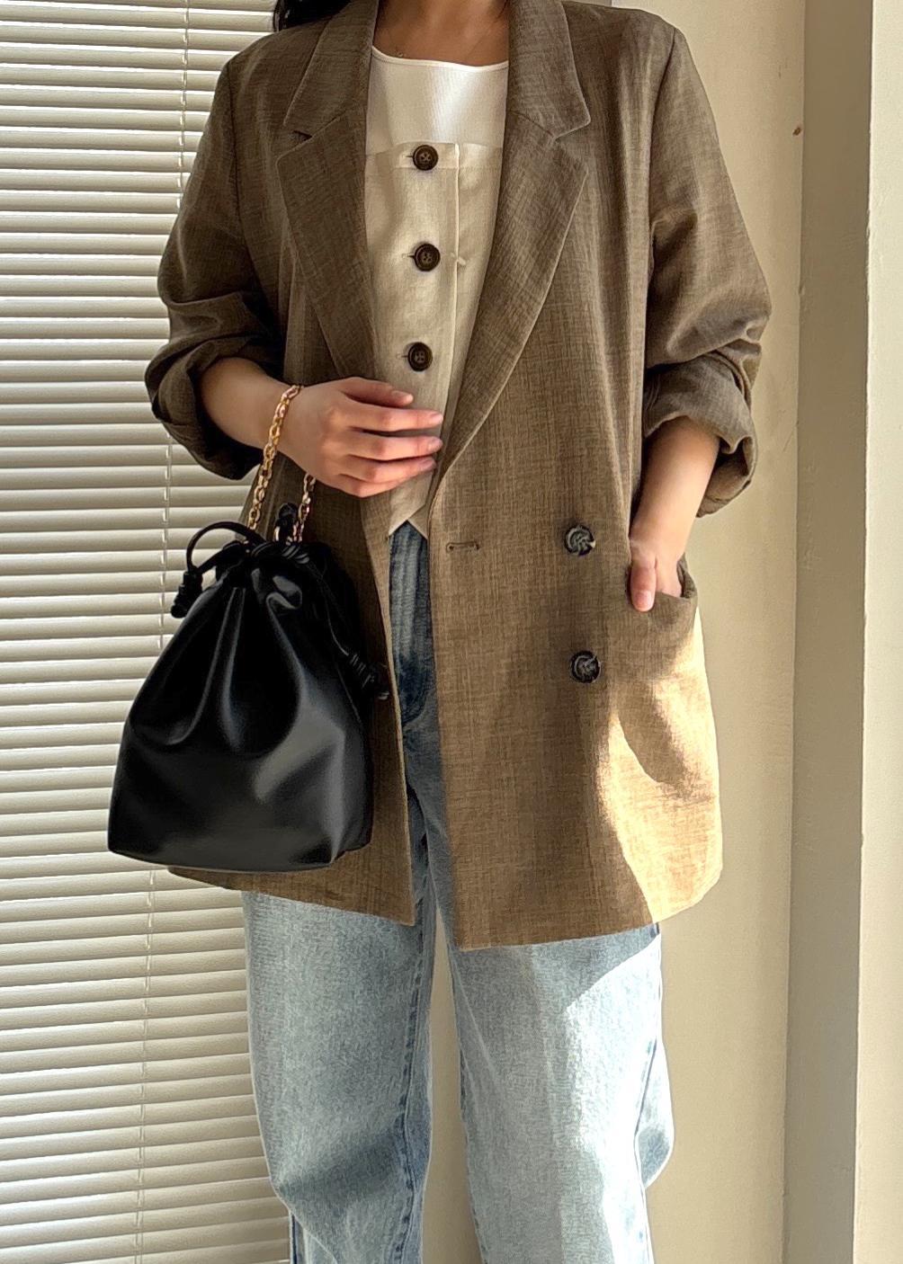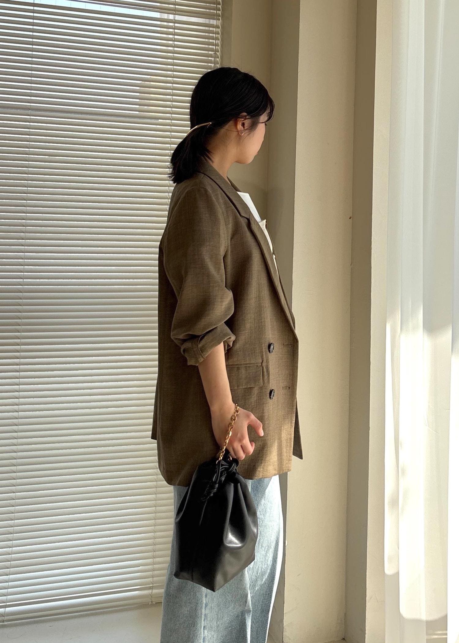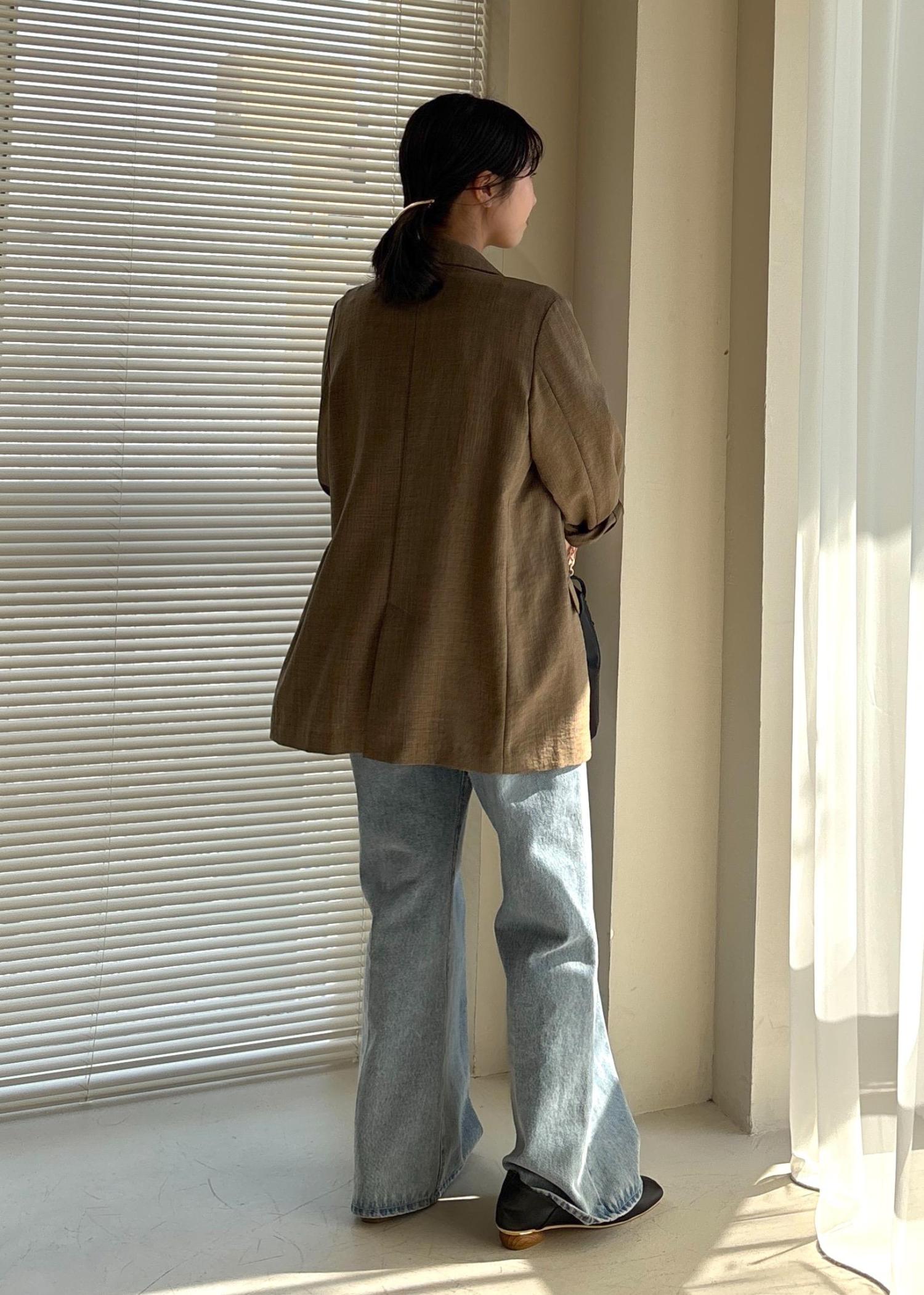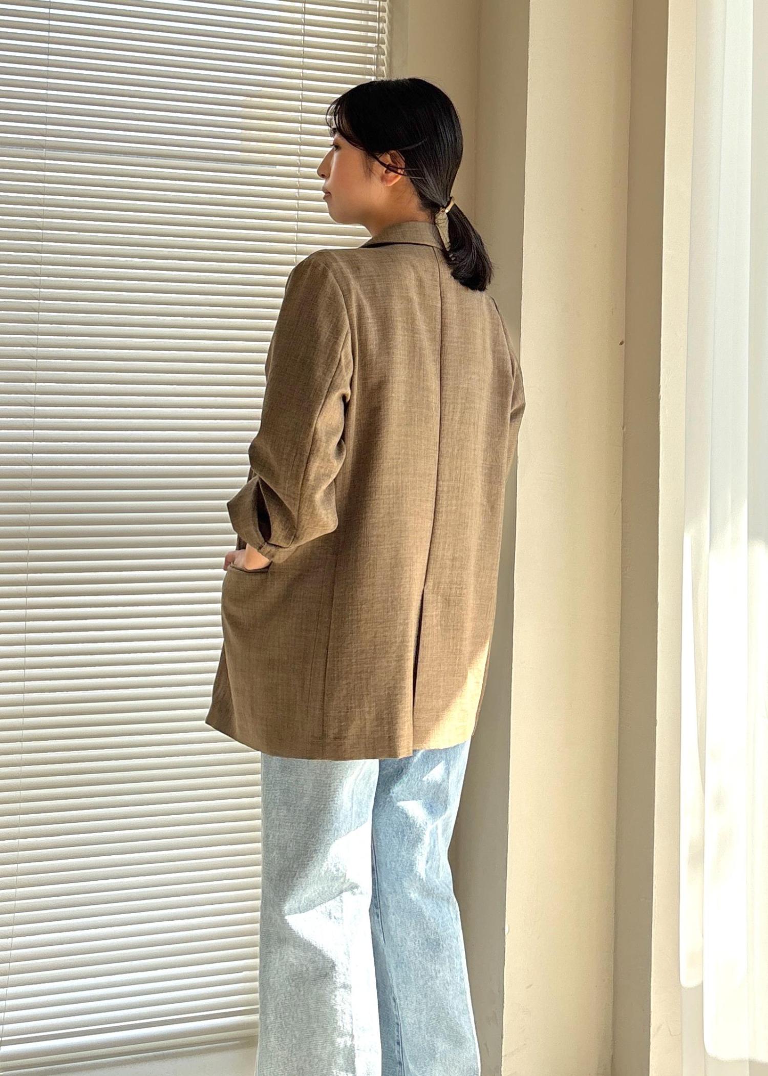 大人気の涼しいトップスをジャケット×デニムで大人カジュアルに着こなすコーデです。