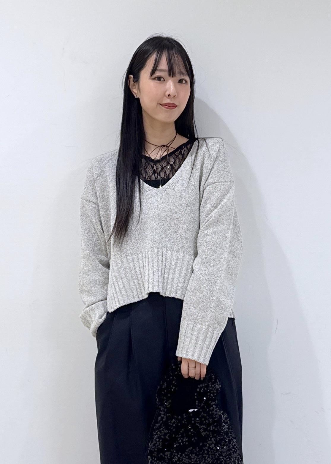カジュアルめなデザインのニットに、大人っぽい黒色のレースインナーを合わせたコーデです