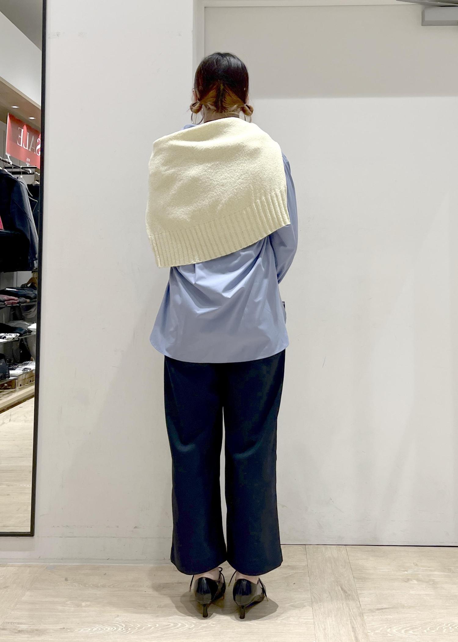 ゆったり目のシルエットもいい感じ〜グルカパンツのゆるっとさとの相性も◎ポイントにニットを肩がけでこなれ感もプラスです。