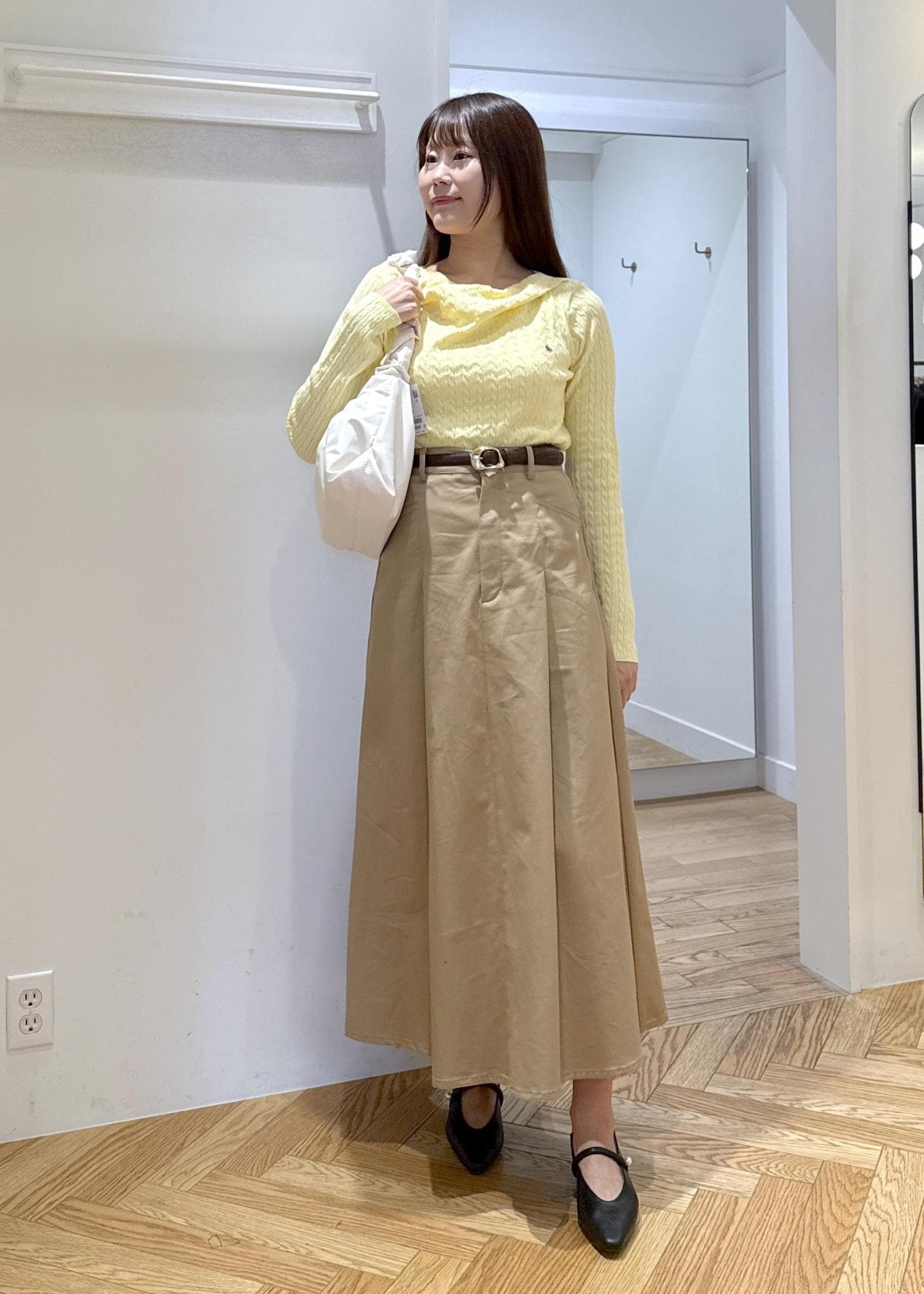生地はしっかりとした生地ですが、肌あたりはサラッとしていて、膝回りもシワがなりにくいので、きれいなシルエットで着用できます。 -