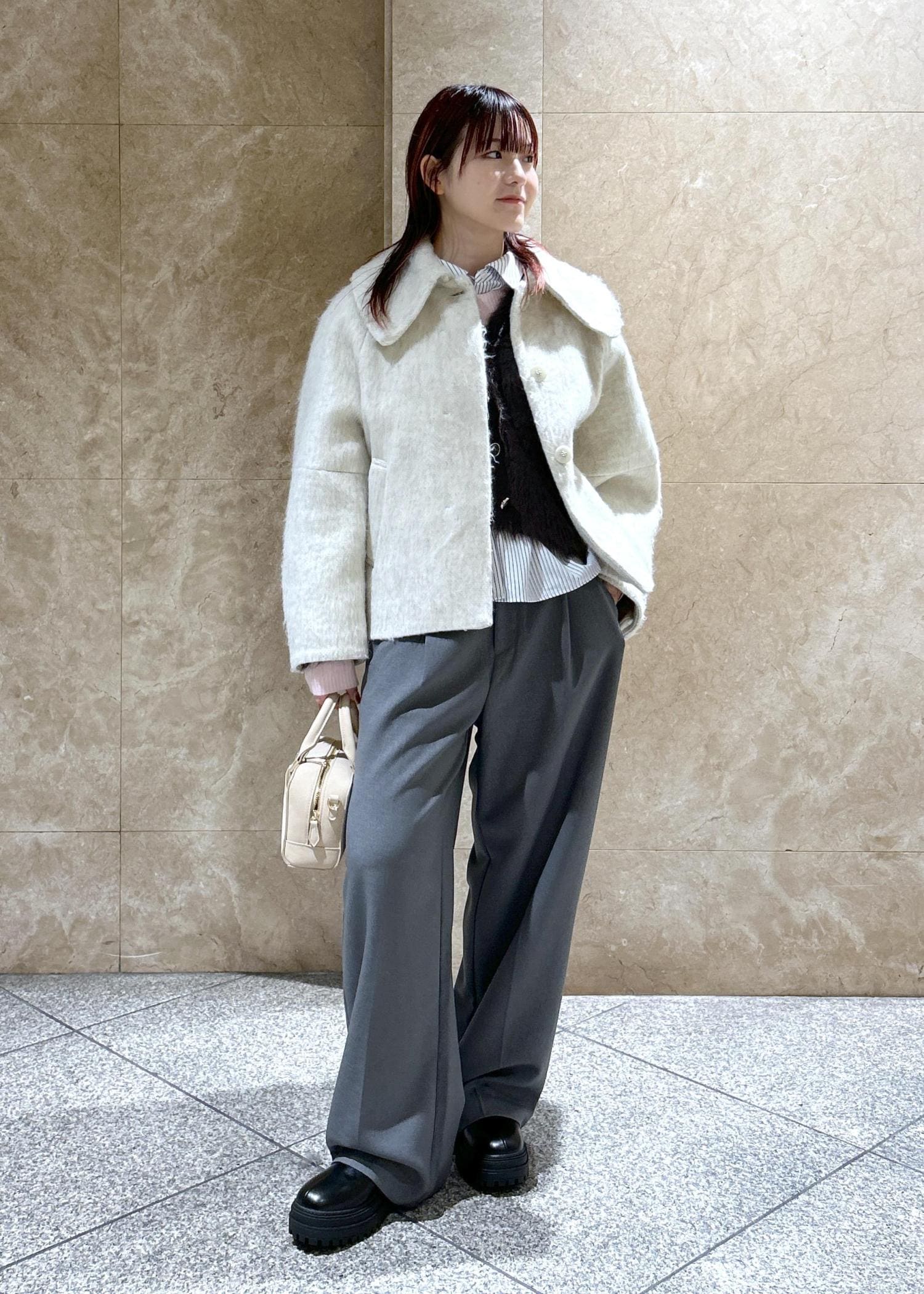 ウエストが絞れるようになっているので、一度ここで絞りを入れシルエットにメリハリを作ると、小柄な方でもバランスが取りやすく、着やすいと思います!