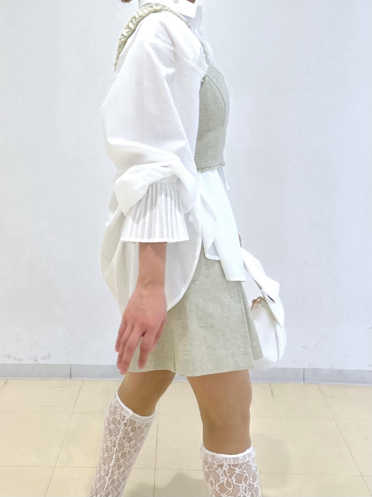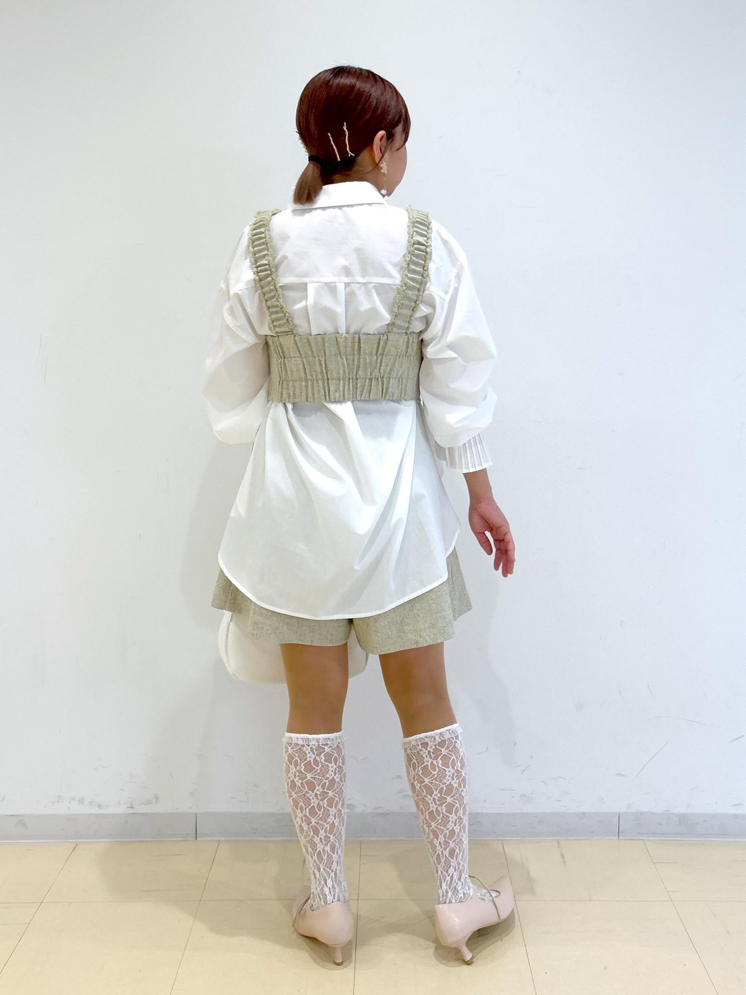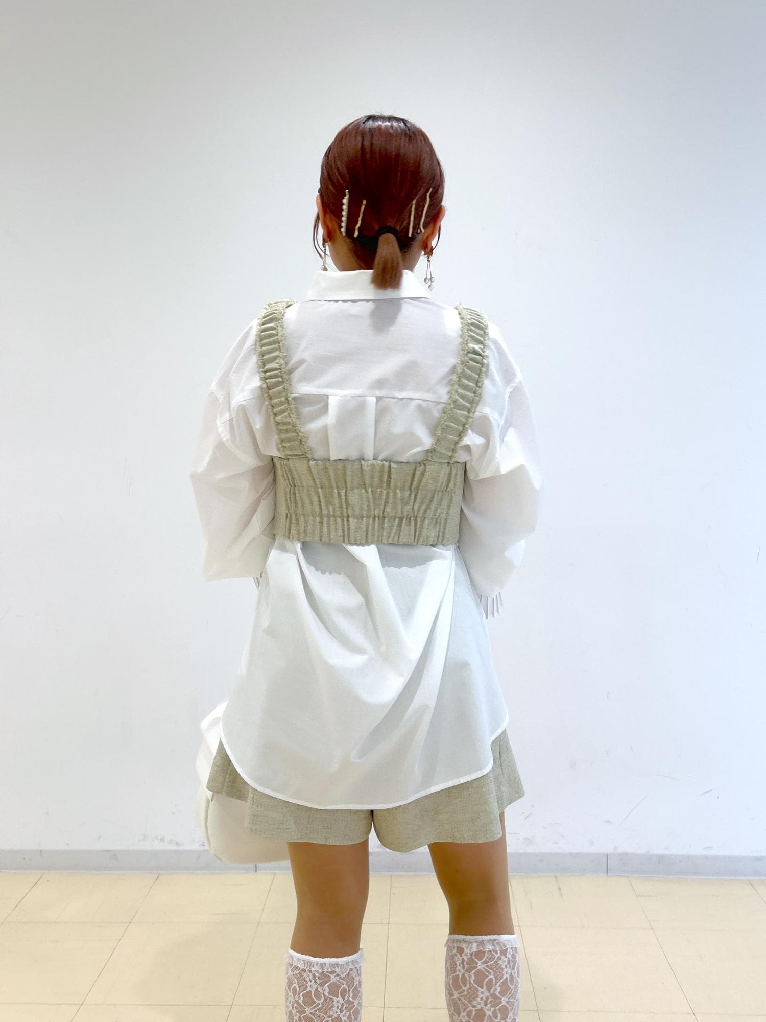 パンツとビスチェのセットアップをシャツに合わせて、少しキレイめのレイヤードコーデです♪
