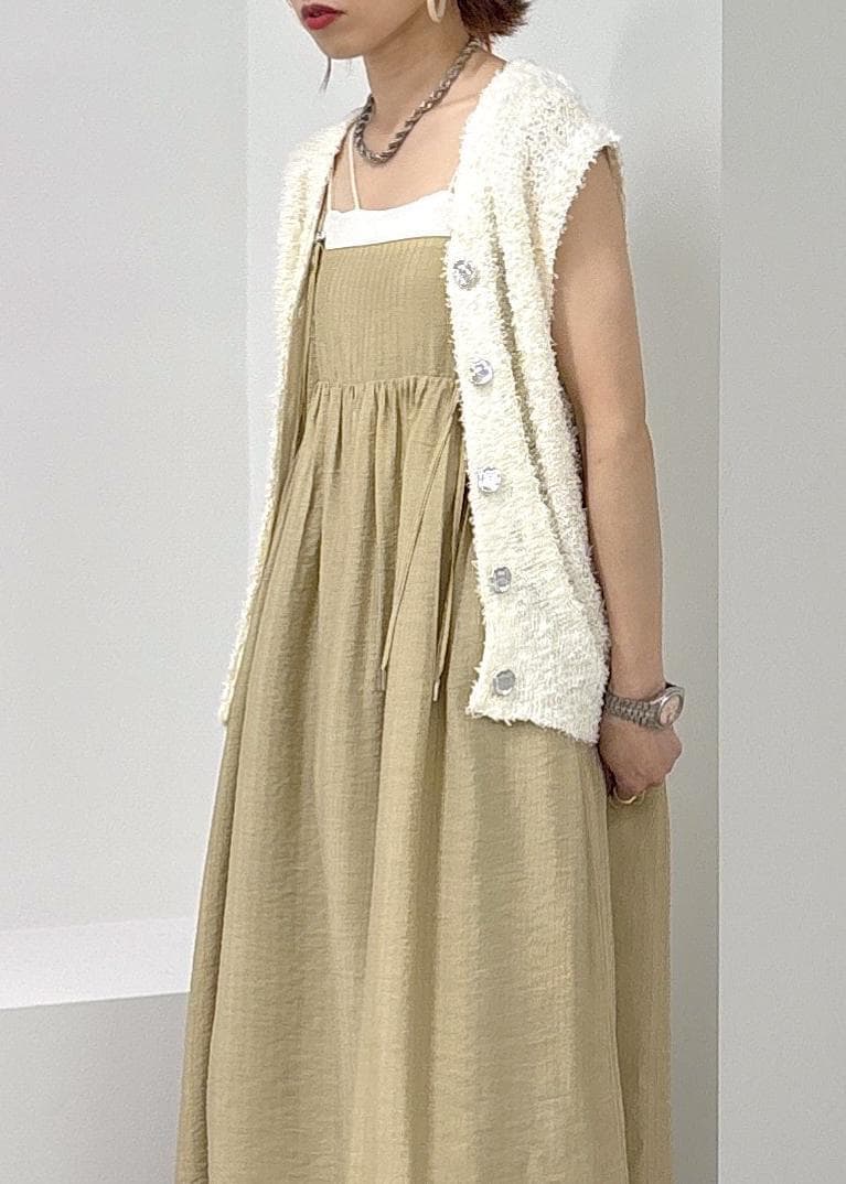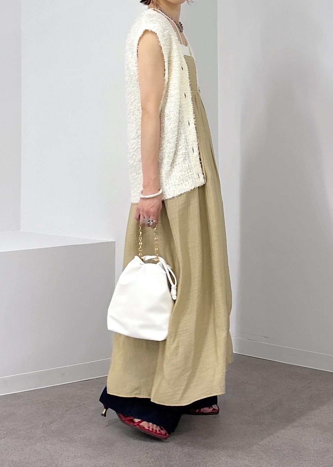 一枚で存在感のあるキャミワンピ♪インナー次第で春夏活躍するアイテムです◎今回はふわふわベストを羽織り、ワイドデニムとレイヤードしたお出かけスタイルにまとめました。柔らかなホワイト×ベージュが可愛いです。春夏オススメの大人カジュアルコーデ。