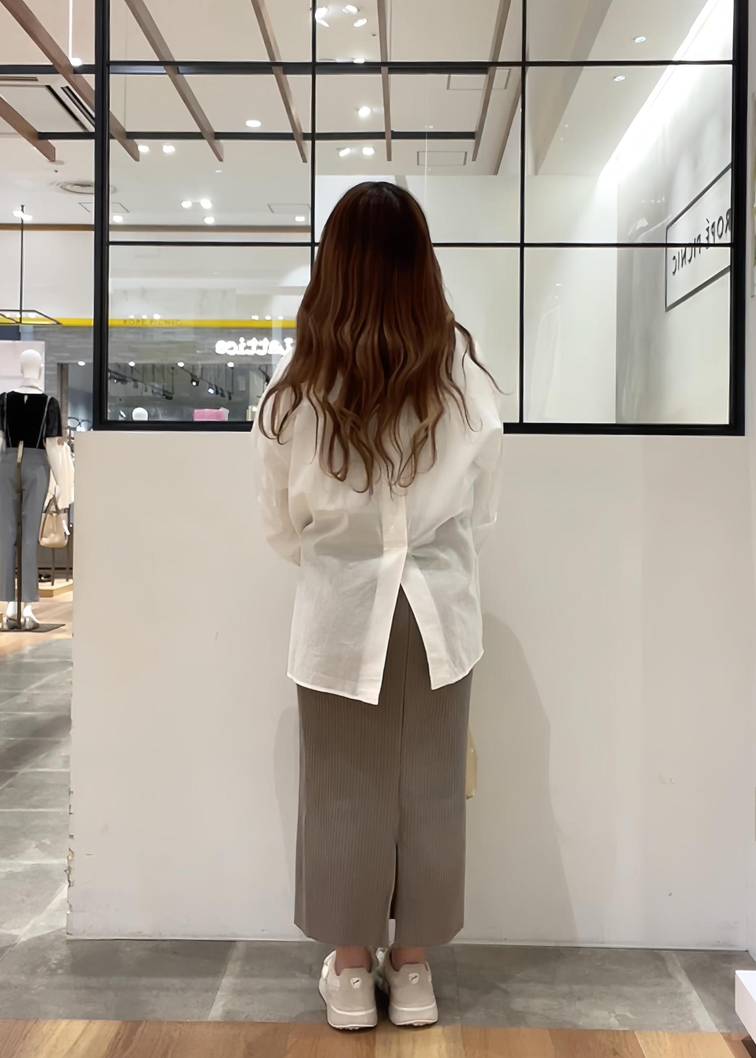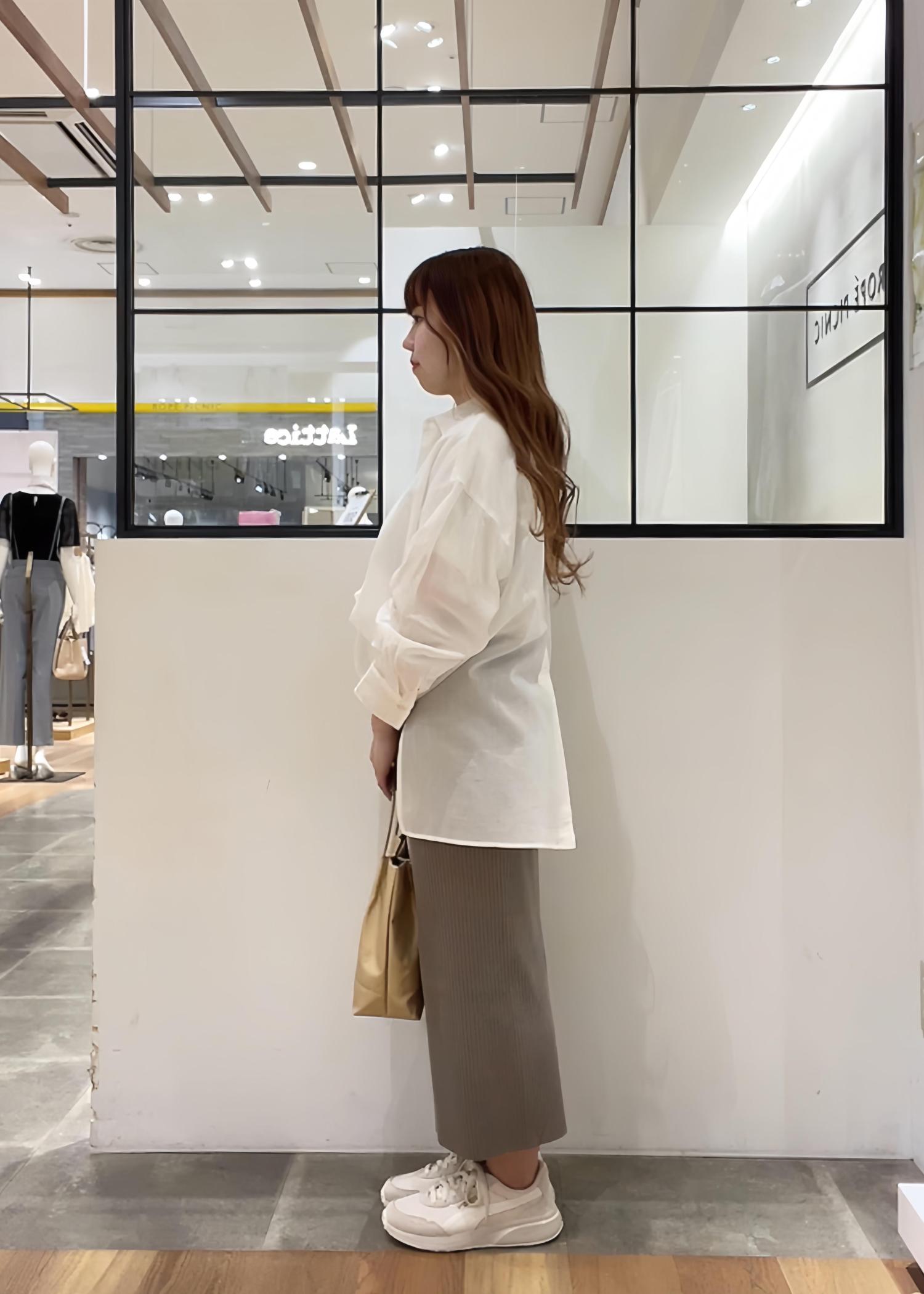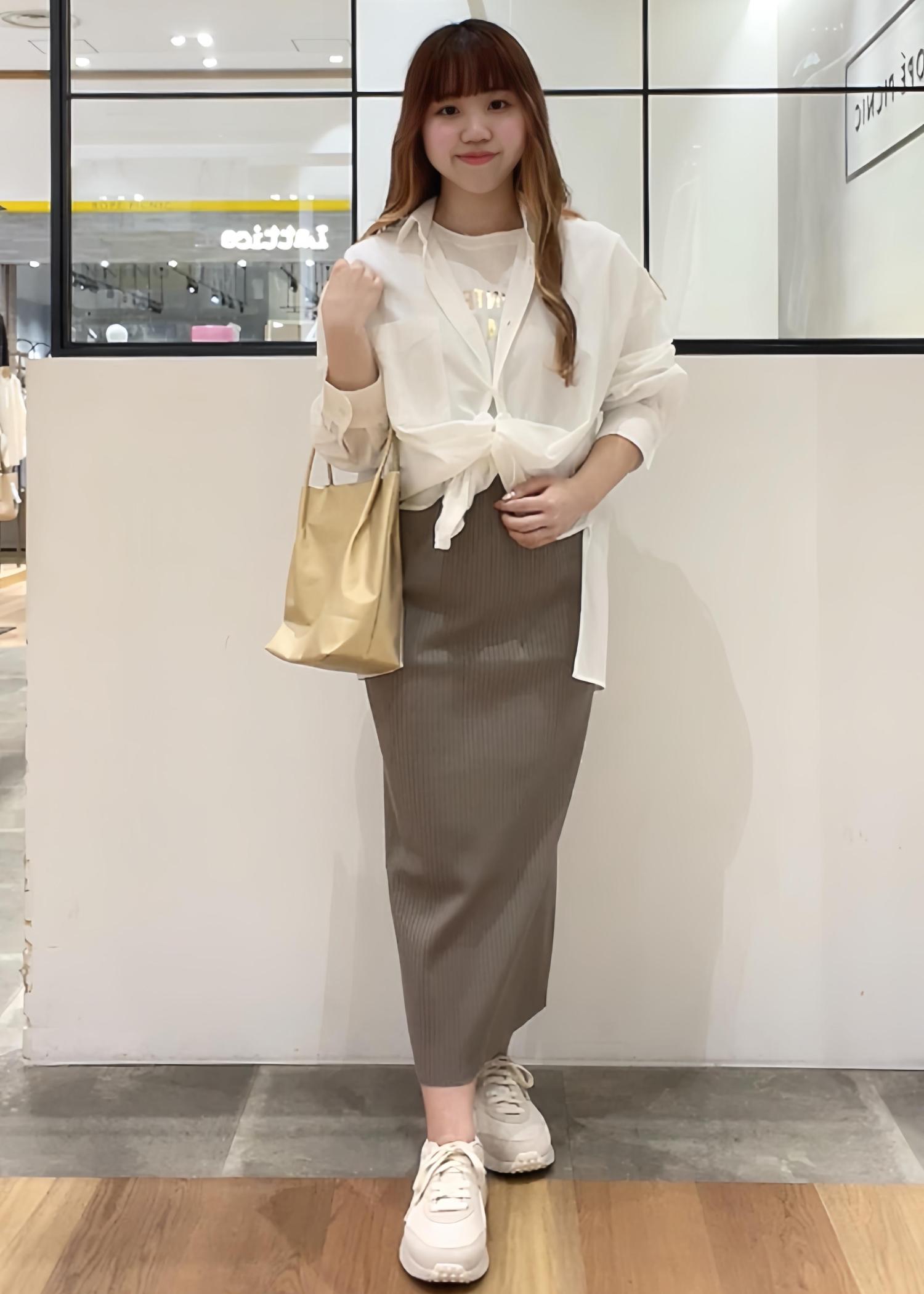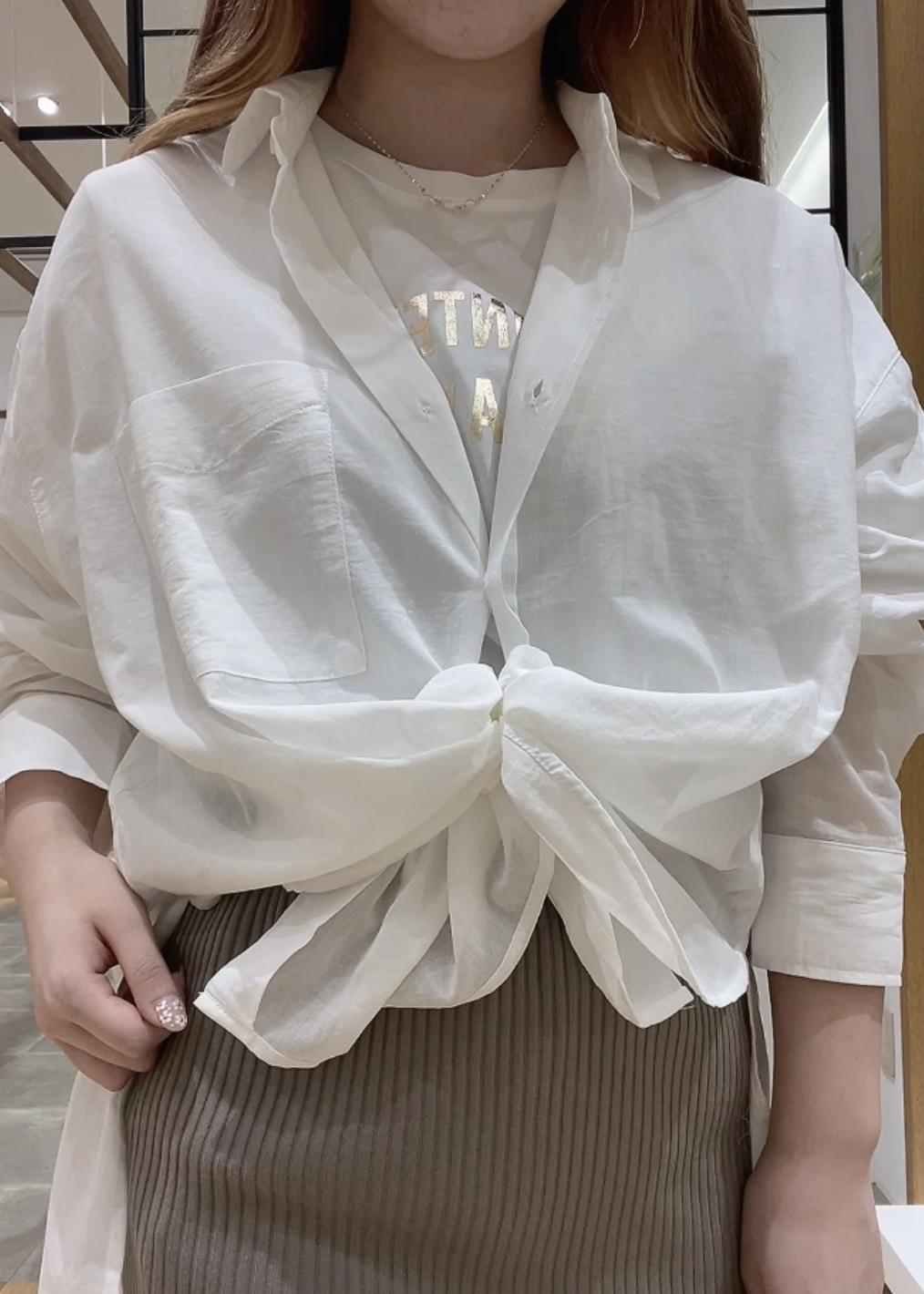 シンプルなロゴシャツに透け感のあるシャツをレイヤードし、タイトなニットスカートと合わせて大人カジュアルコーデに♪