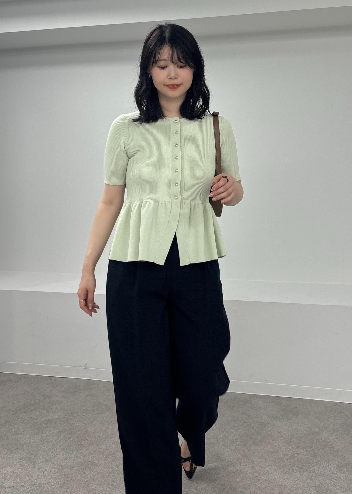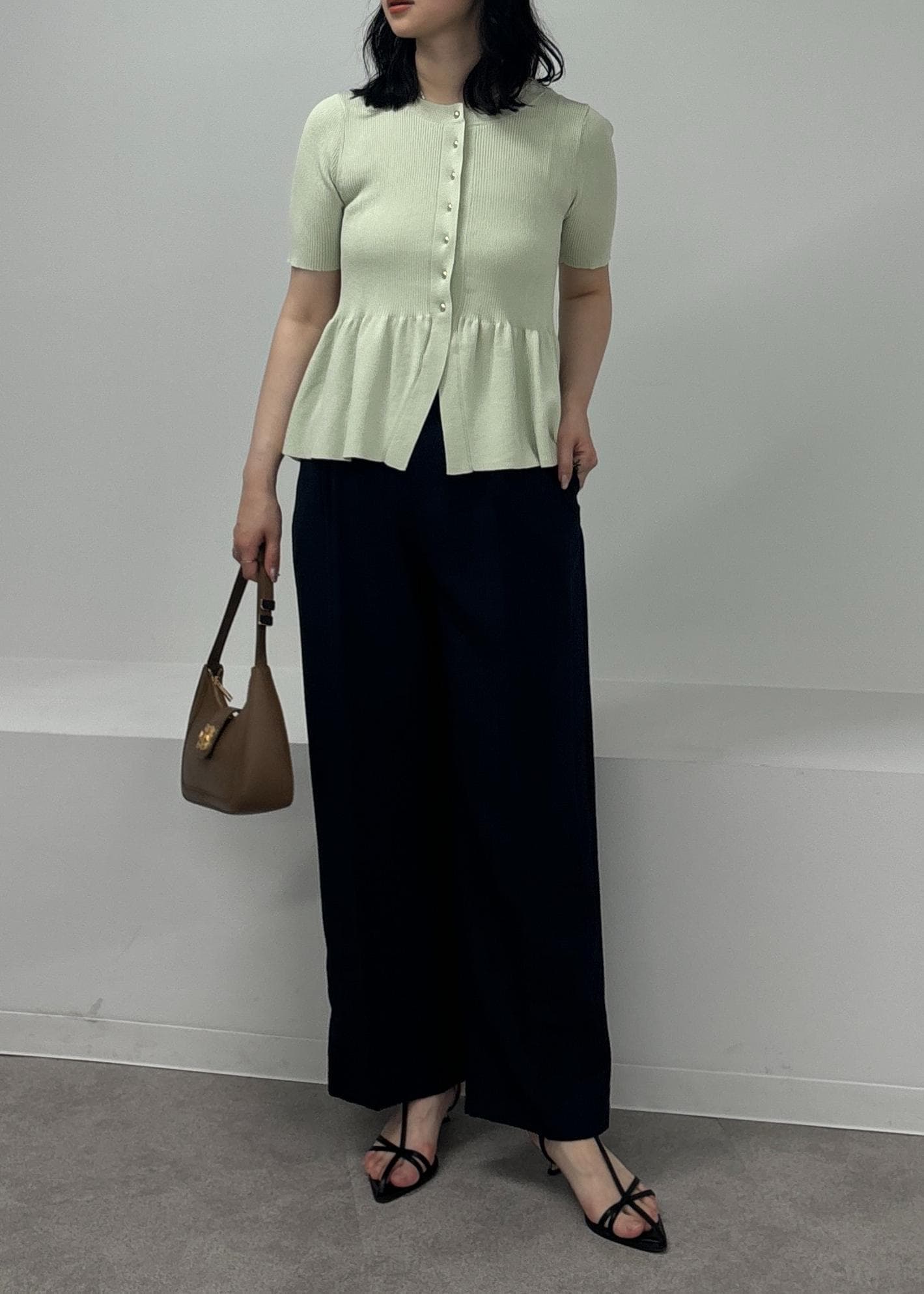 綺麗見えが叶うペプラムカーディガンは柔らかいグリーンカラーに、パンツはネイビーのワイドパンツできちんと感も◎