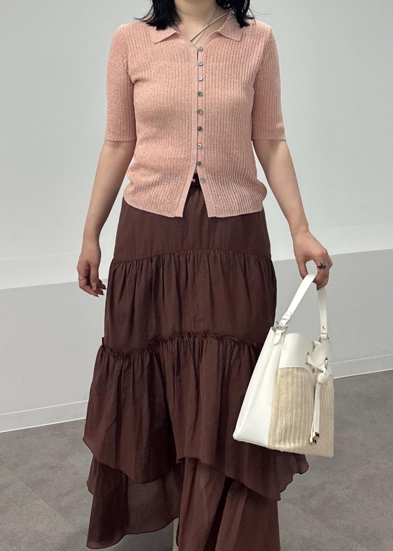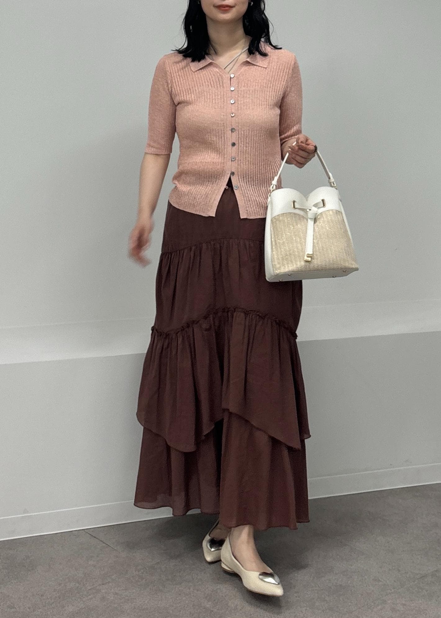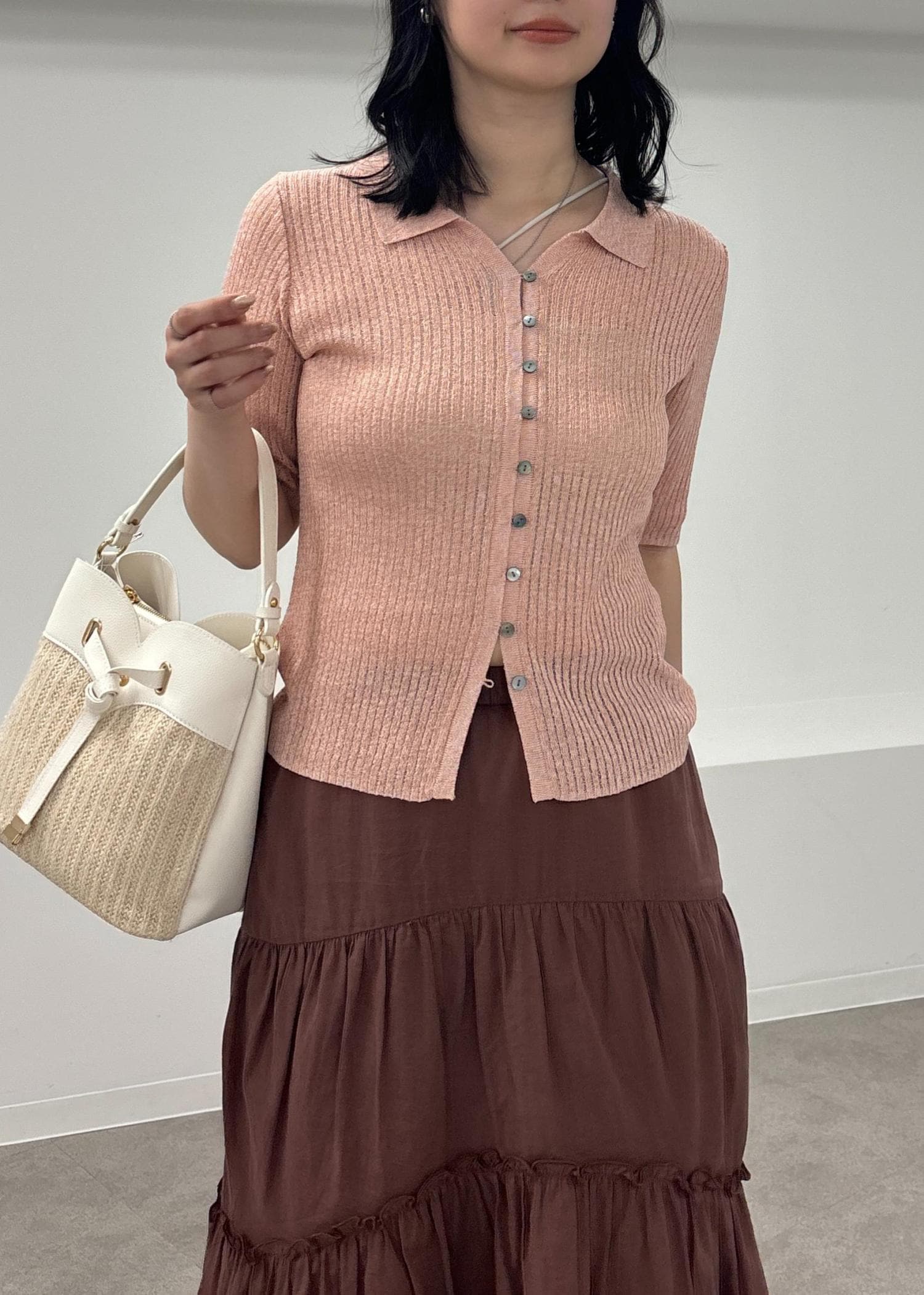 ほんのり甘めなピンクのポロカーディガンに、ブラウンのティアードスカートを合わせ甘さの中にもお洒落見えするカラー合わせのコーディネートにしてみました!