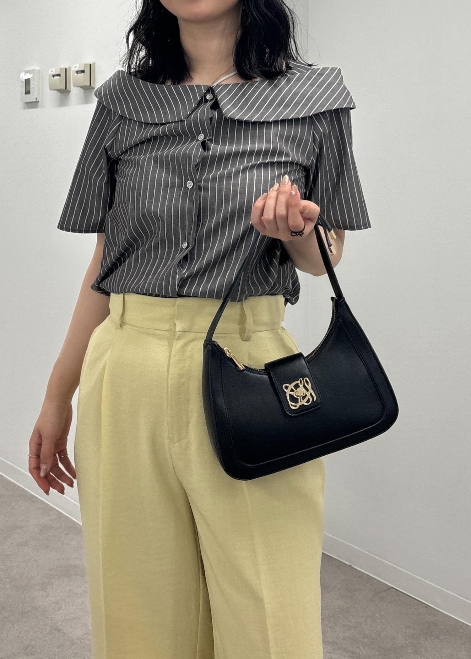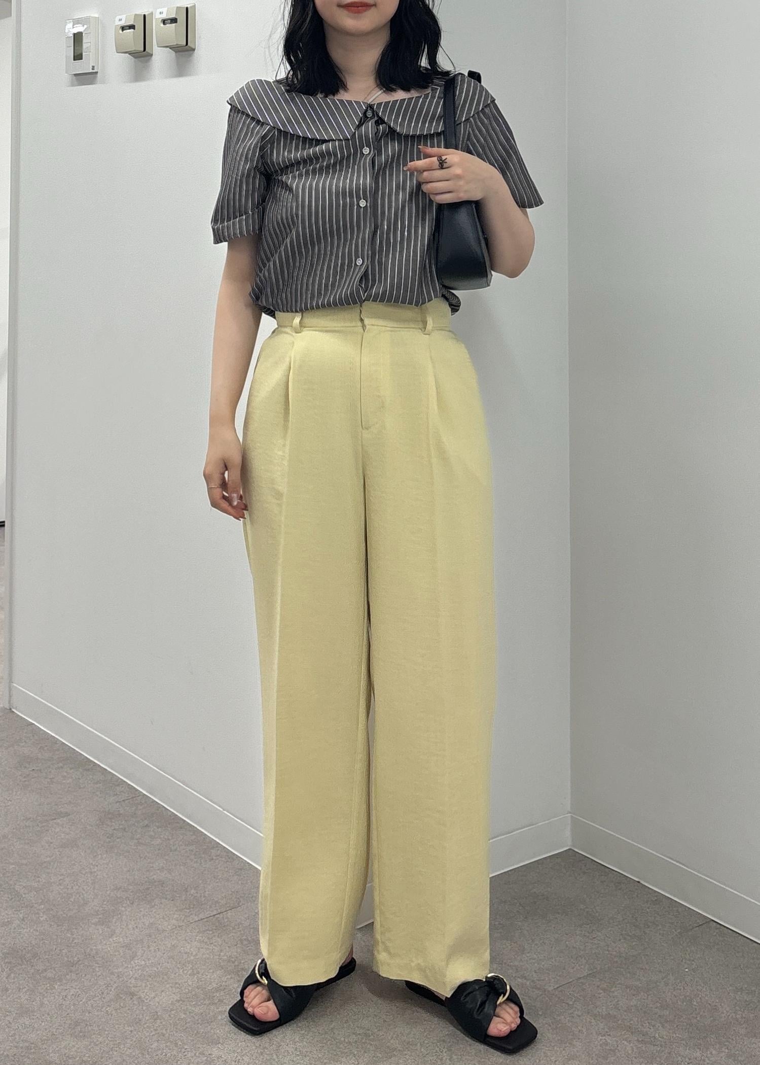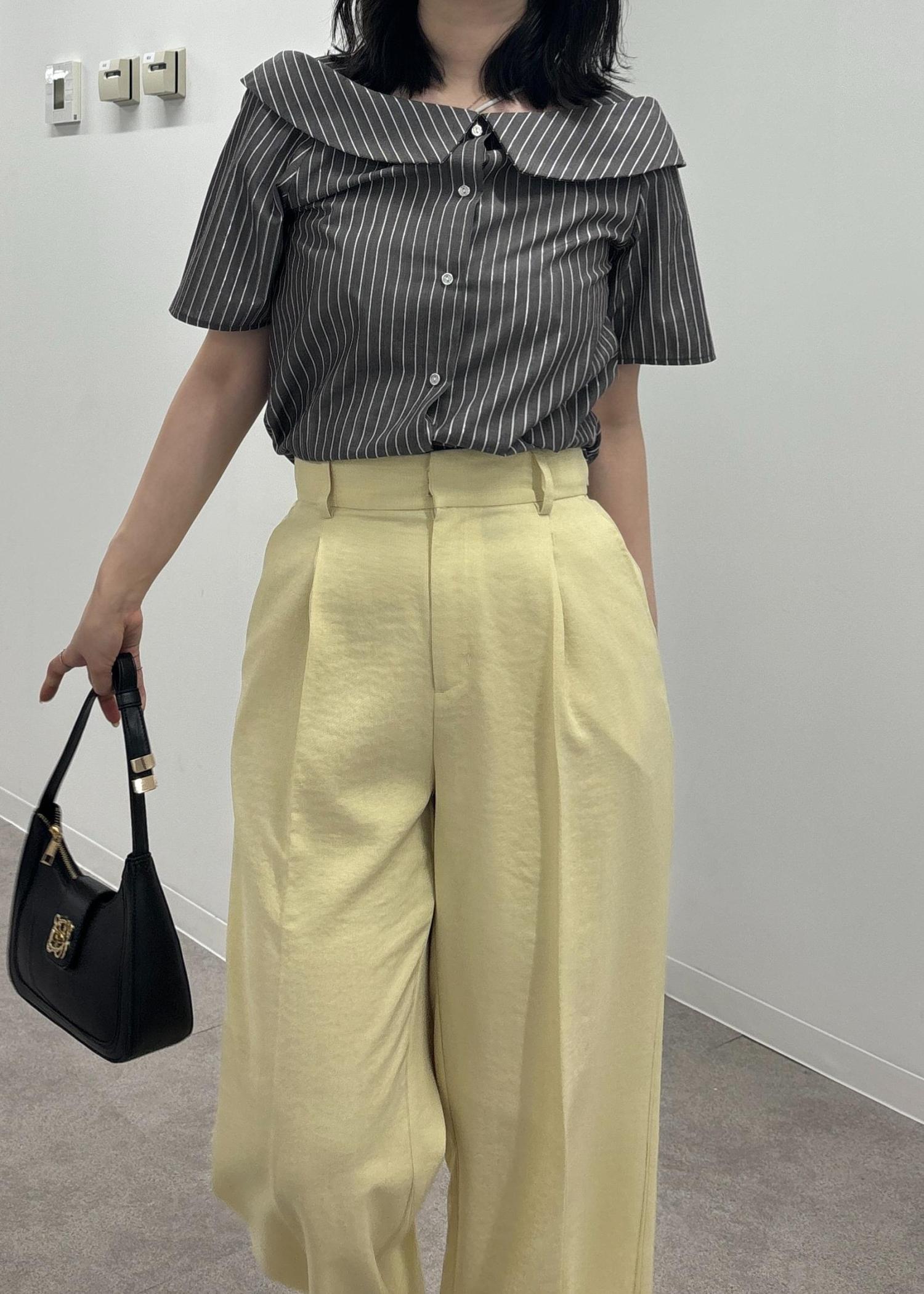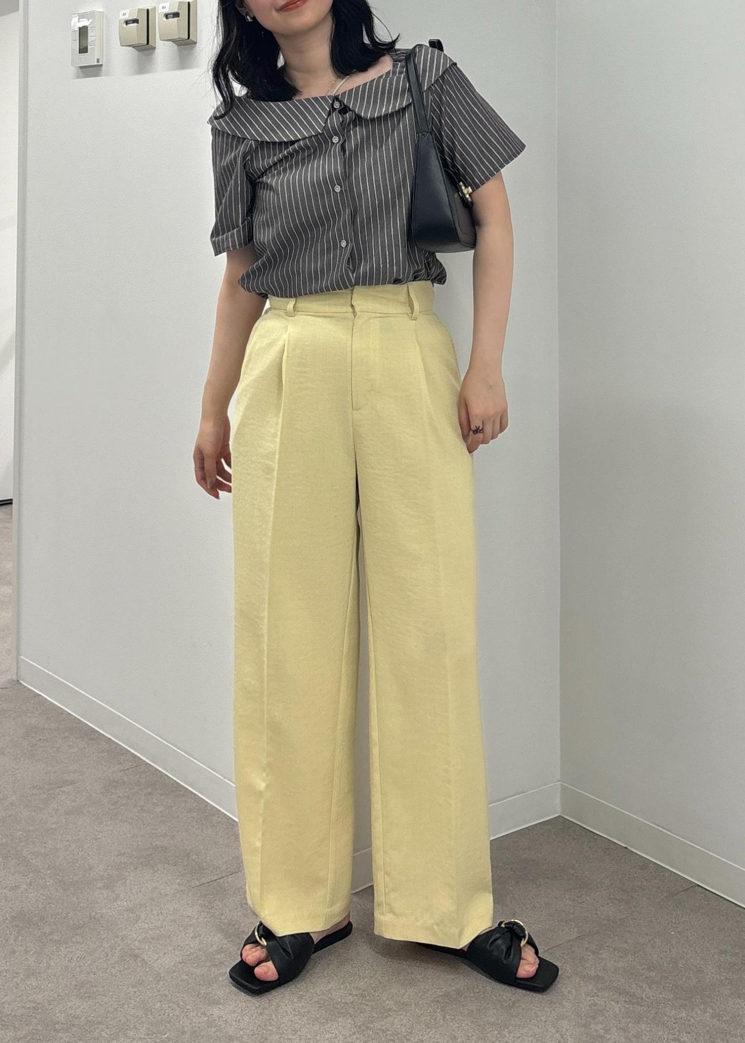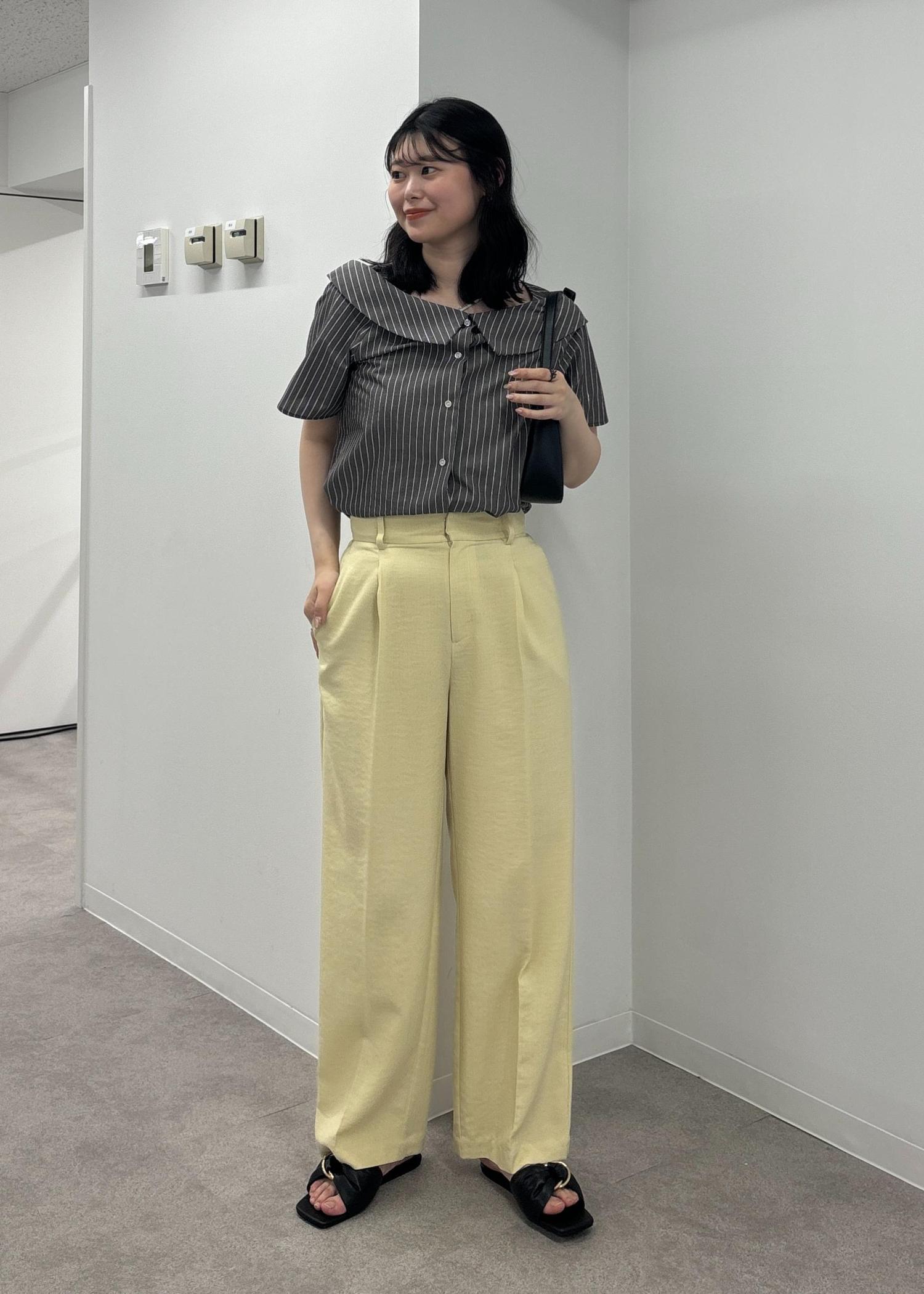 ラメ入りの気映えも、体型カバーも叶うストライプシャツにイエローの綺麗なカラーパンツを合わせ、小物はブラックで絞めたスタイリングにしてみました!