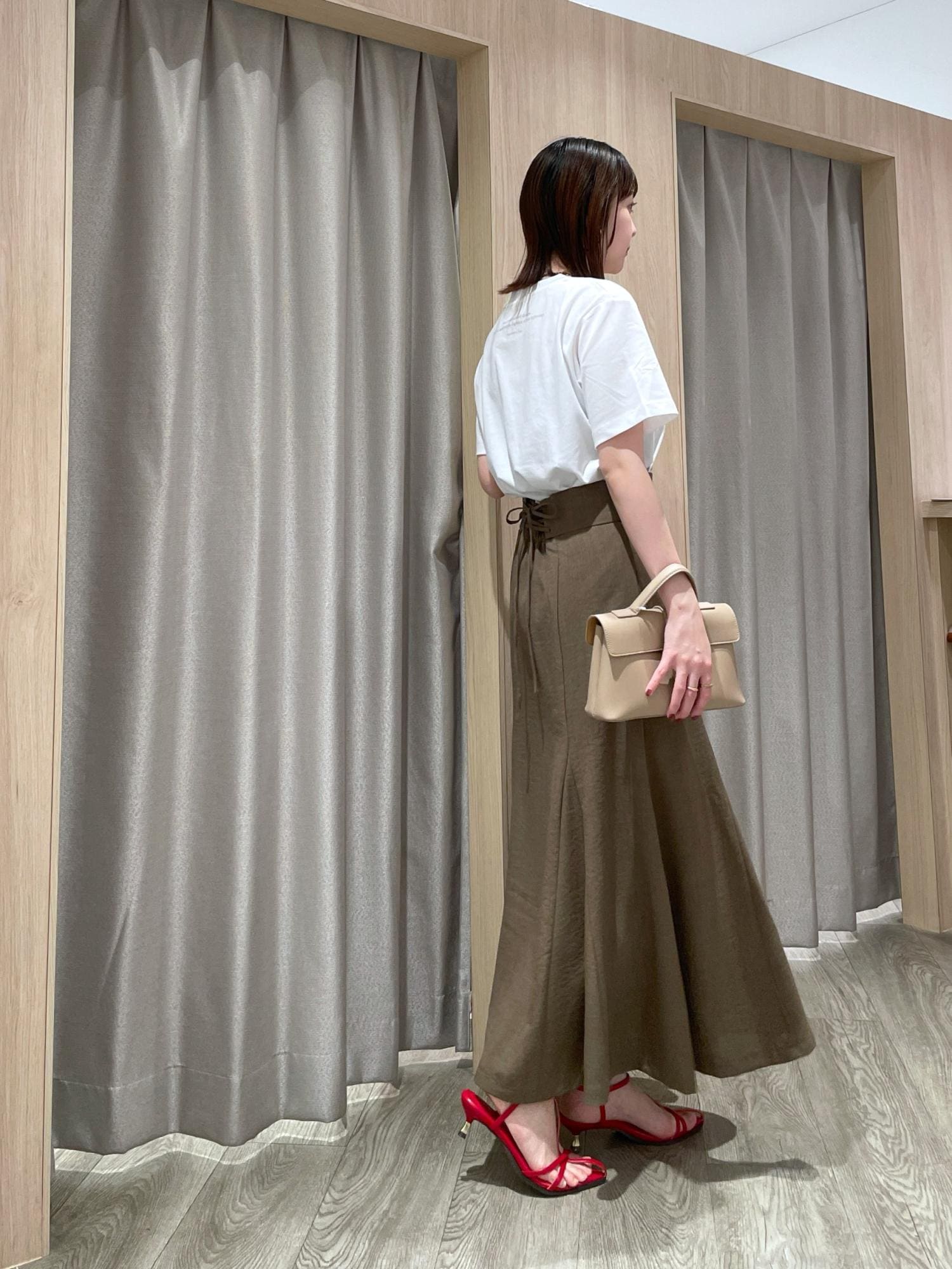 身長159cmで足首が見える着丈、長過ぎず丁度良かったです。腰回りはややフィット感がありボディラインを綺麗に見せてくれます。シンプルだけど、バックのレースアップや立体的なフレア感でお洒落見えもします◎