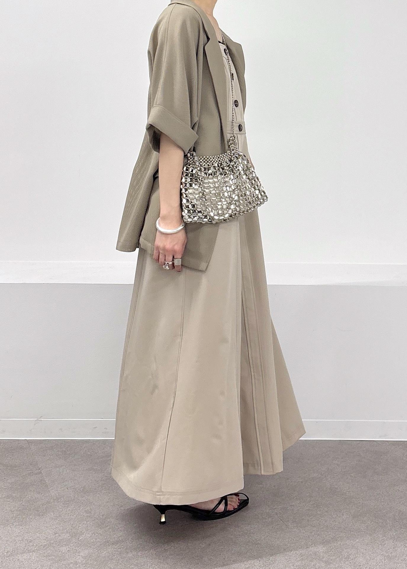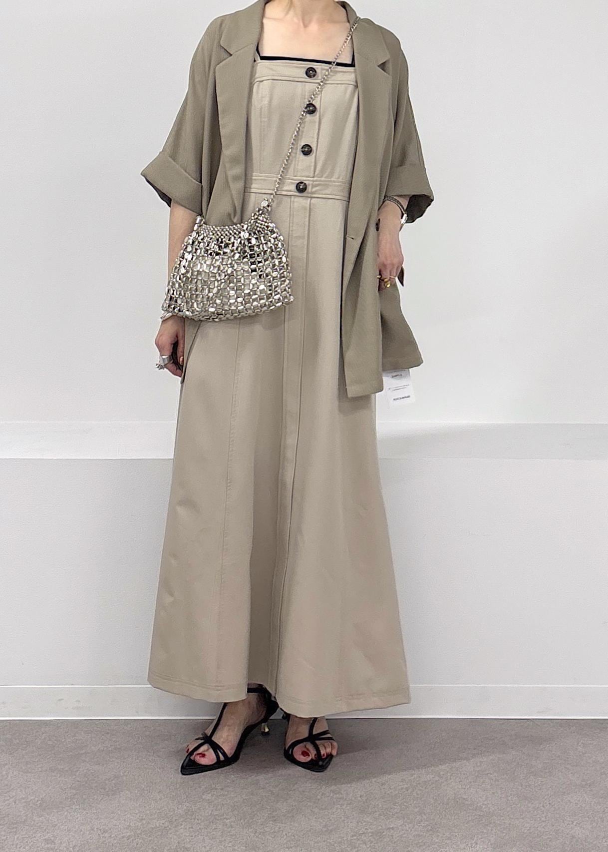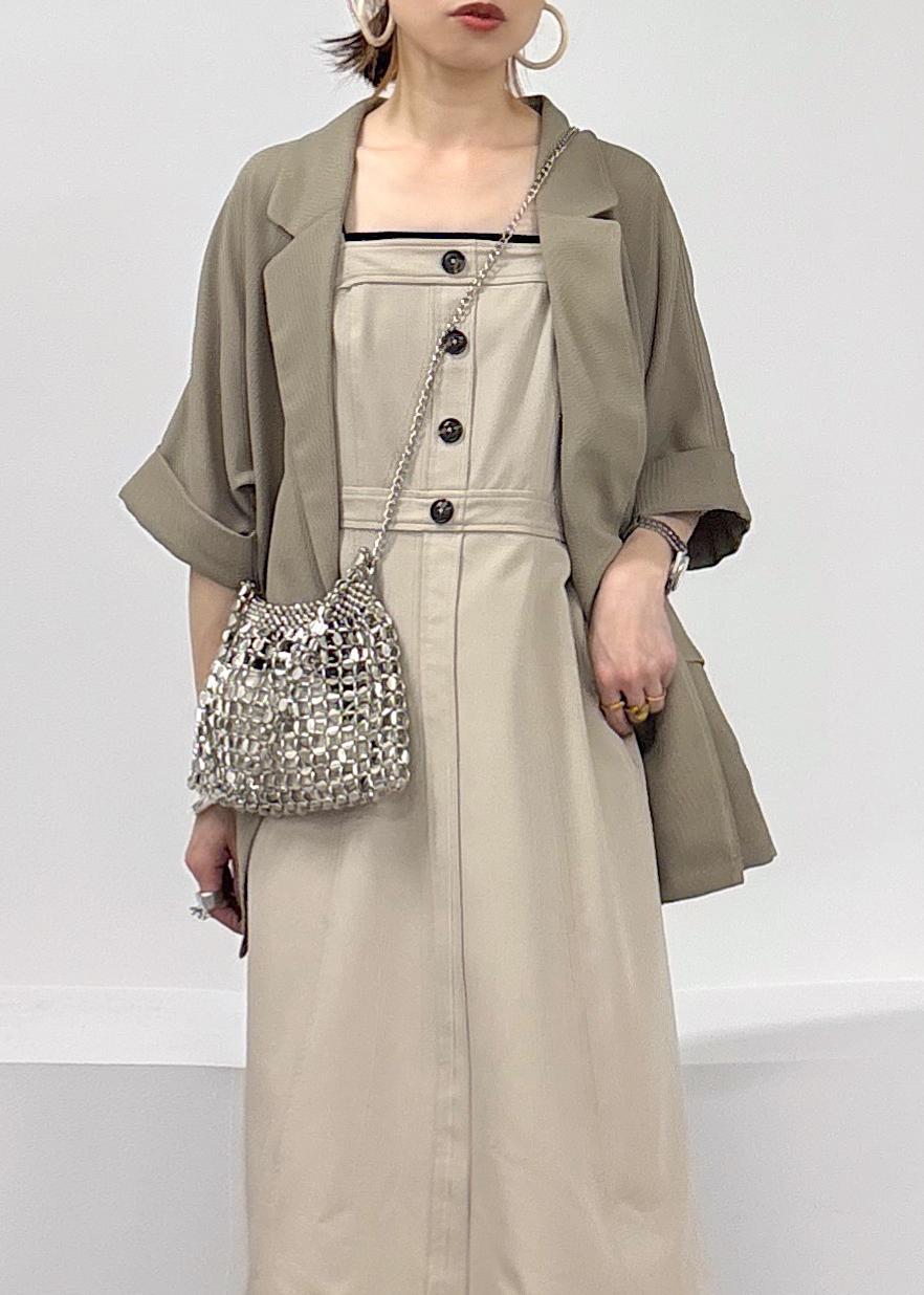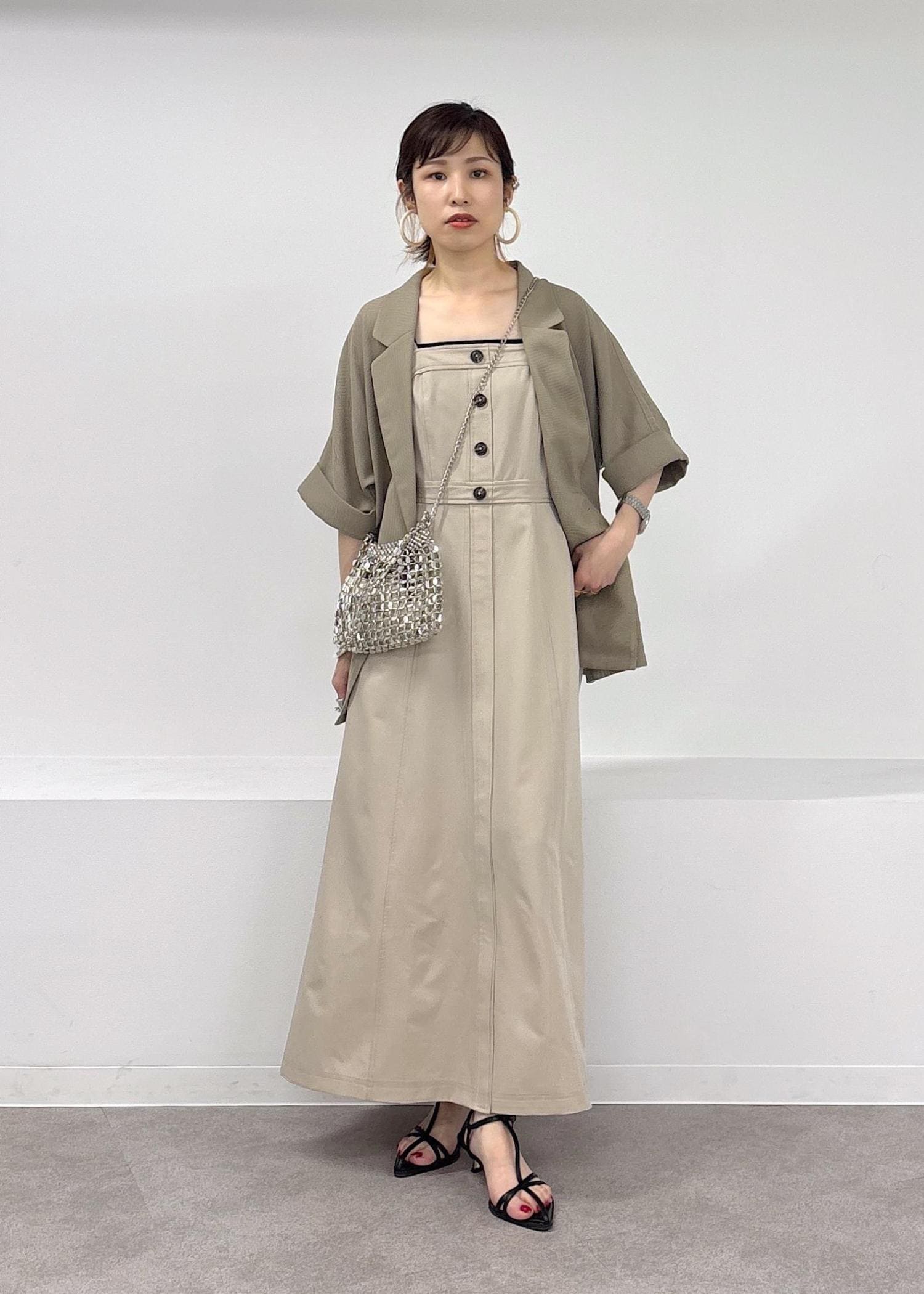 POLO BCS | VIS別注ワンピースをメインに、メッシュジャケットと合わせた淡色スタイル♪ワンピースは胸下切り替えなので、ゆるっとしたジャケットの相性◎ヒールサンダル、ビーズバックと少しレディ要素を足しました。春夏のお出かけにぴったりな大人カジュアルコーデ。