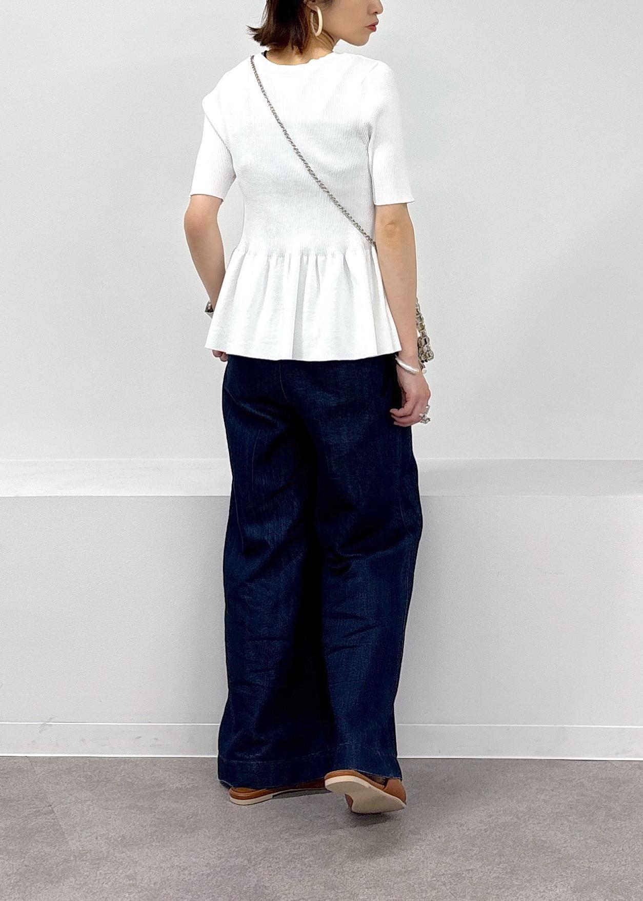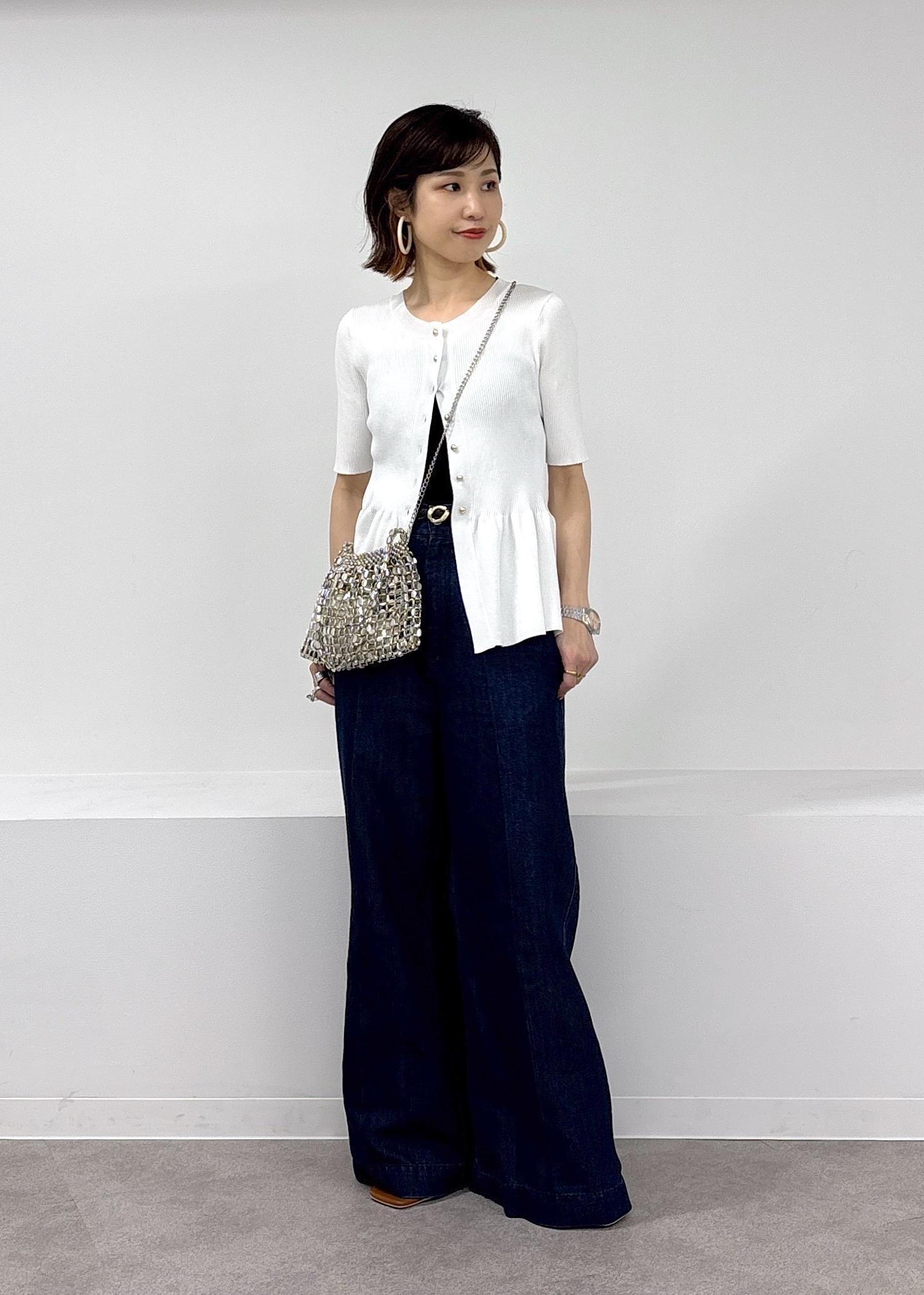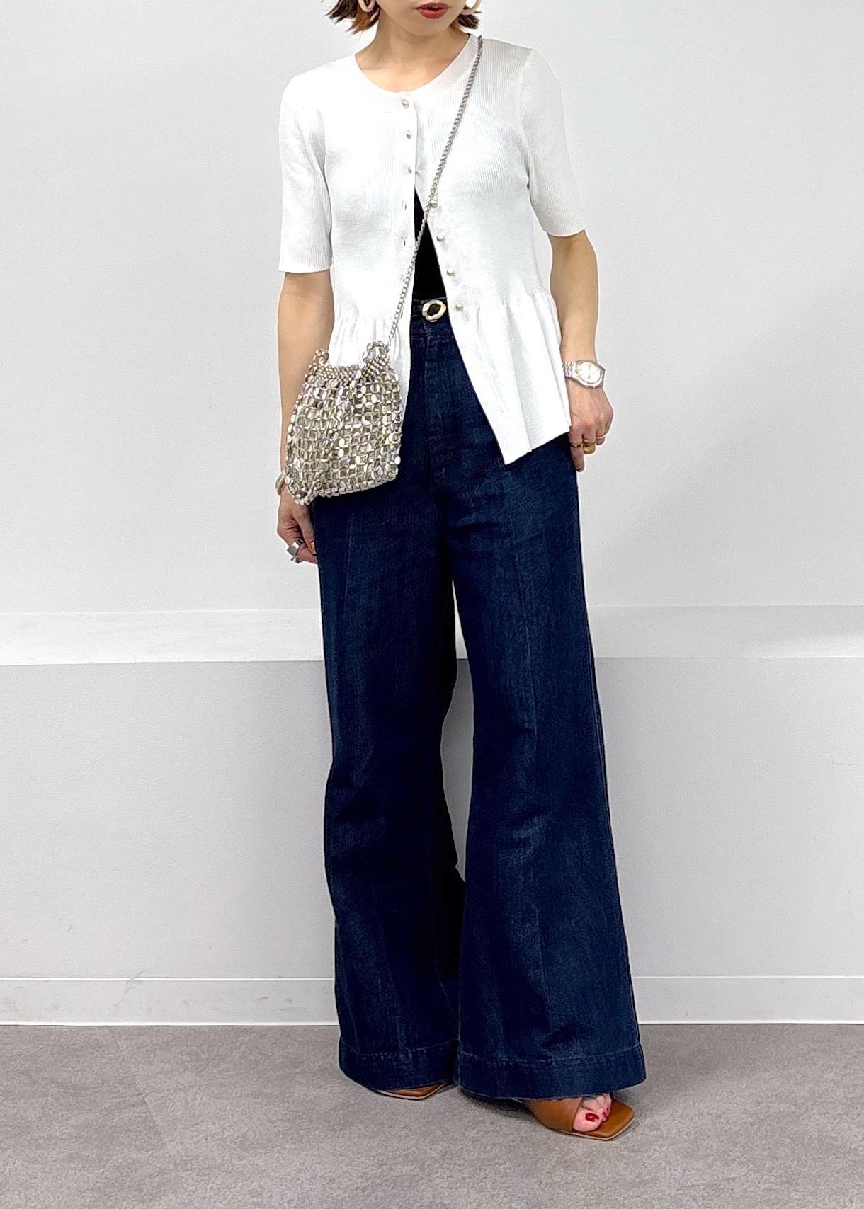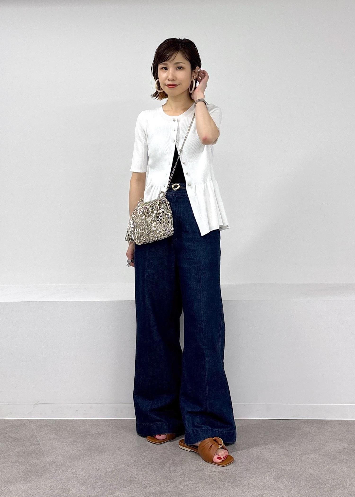 よりさらっとした着心地、半袖と夏場も快適に着回せる仕様になってます。ワイドデニムとの合わせはトップスの裾近くのボタンを少し外して、ウエストマークを見せるのがスタイルup見えしてオススメです。春夏オススメの大人カジュアルコーデ。