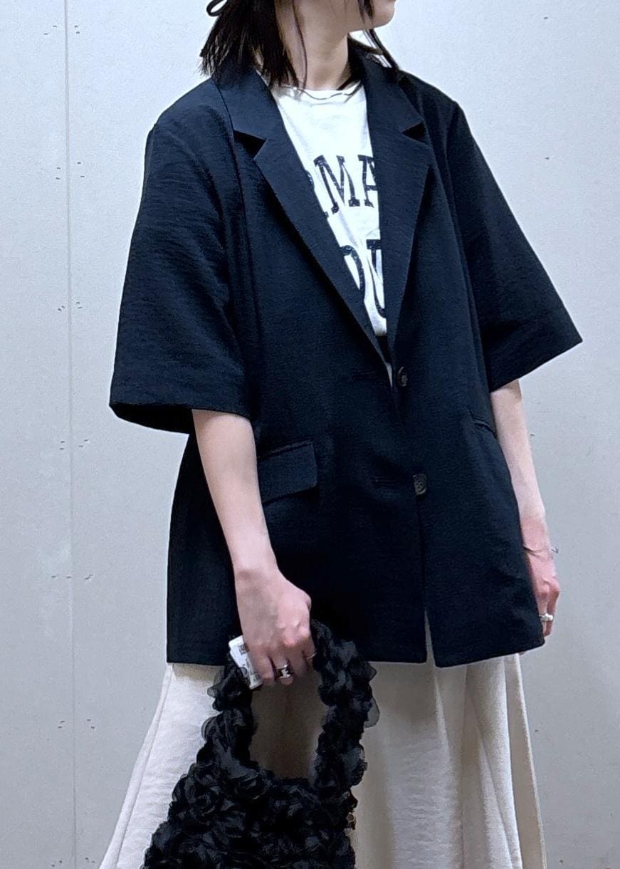 VIS【美easy】ハーフスリーブジャケット/セットアップ対応・洗えるネイビー / S¥7,909レビュー155cmでSサイズ着用、袖はひじくらい、丈はおしり隠れる長さでオーバーサイズ。