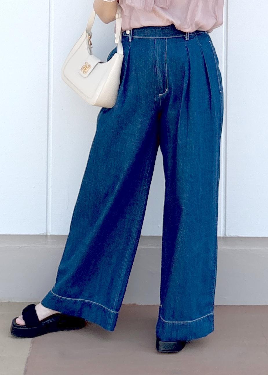 アウトレットVISタックデザインリラックスデニムパンツブルー / M¥3,460レビュー153cm、Mサイズ着用でヒールを履いて地面につかないぐらいの丈感です!