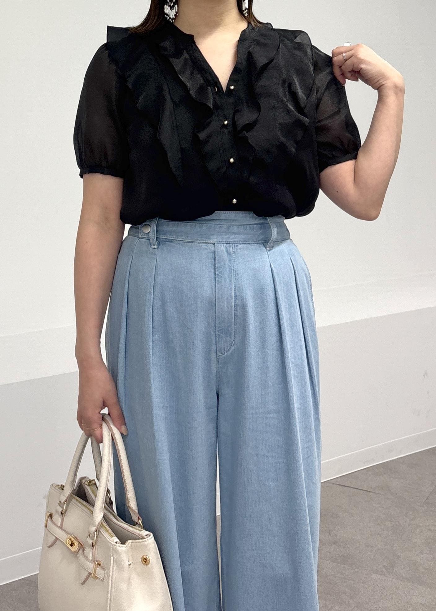 Vネックなので顔周りはすっきりしつつ、フリルで華やかな印象になります -