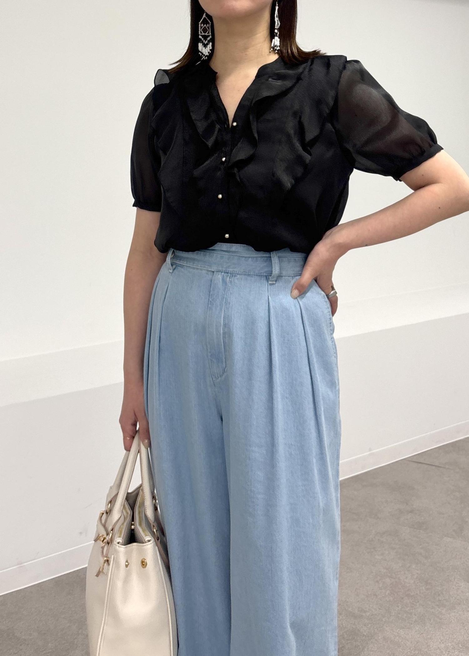 アウトレットVIS【洗える】シアーラッフルフリル半袖ブラウスブラック / F¥4,391レビュー大人気のシアーブラウスが半袖になって登場!