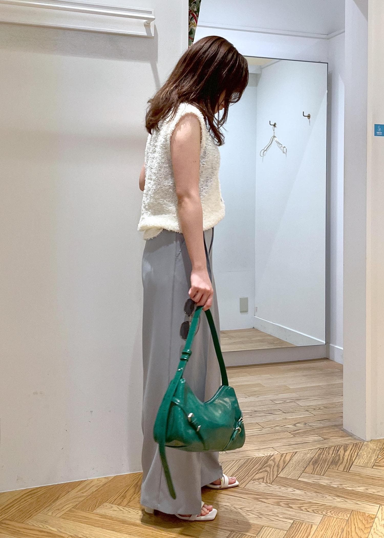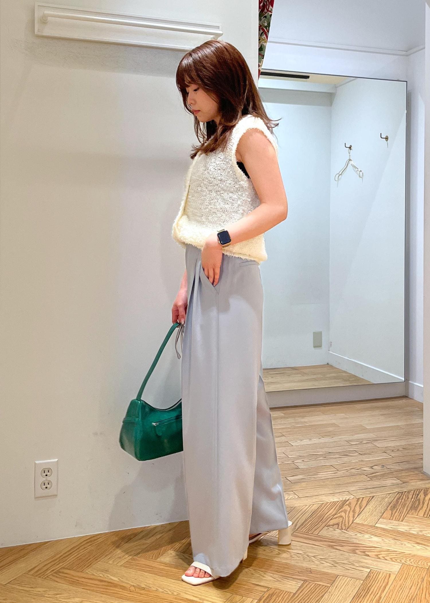 綺麗めですが外しでフロントベルトのバッグを合わせて大人カジュアルなスタイリングです。