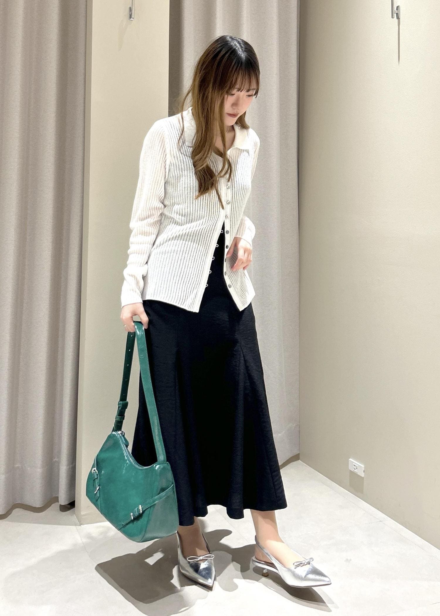 大人コーデということでシンプルに黒と白、差し色で緑、爽やか感プラスのシルバーを使ってコーディネートを組みました。