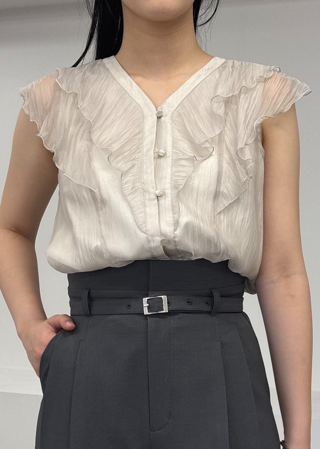 アウトレットVISシアーラッフルフリルブラウス/通勤対応ベージュ / F¥3,842レビュー165cmで腰がほぼ隠れる丈感です。