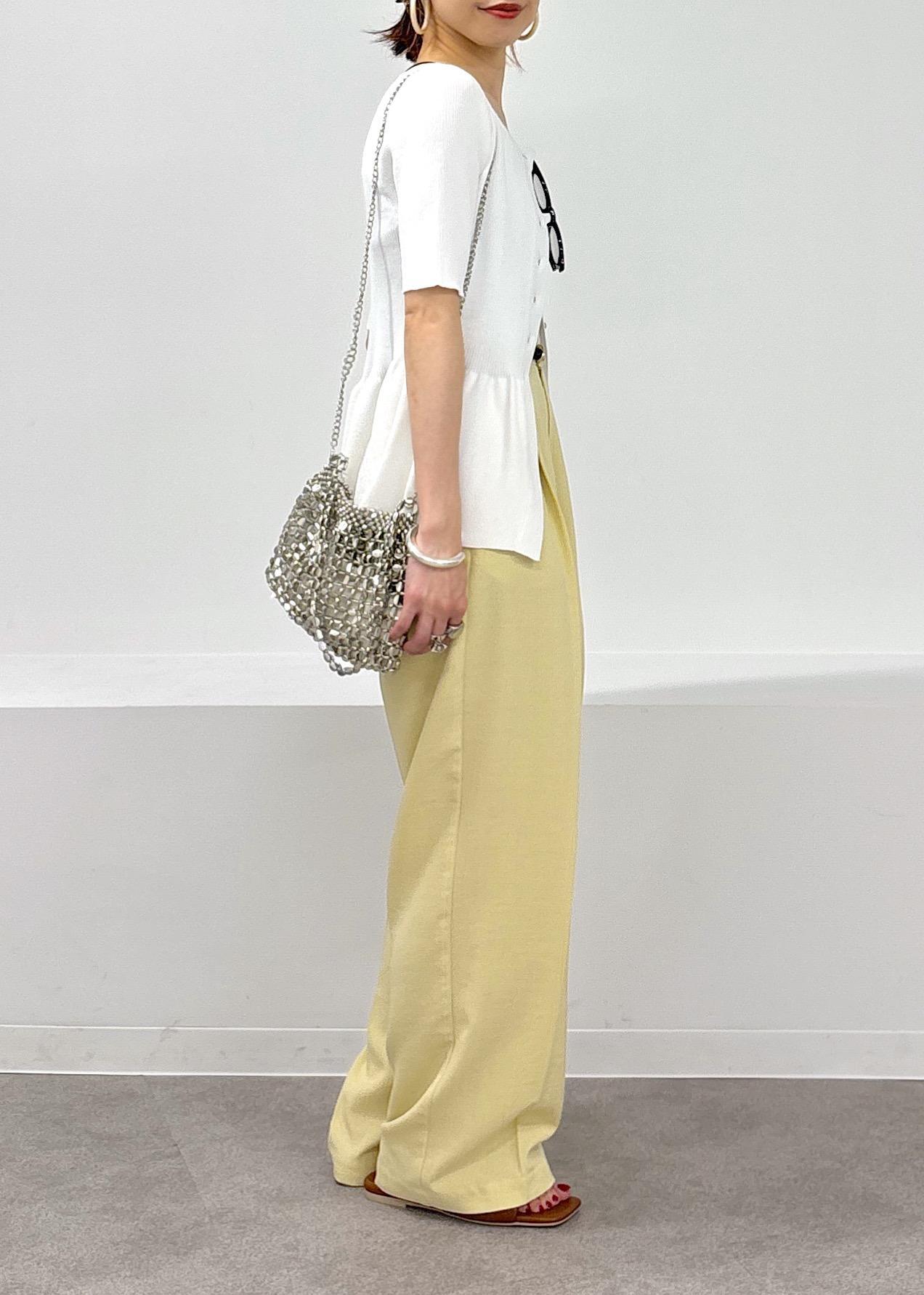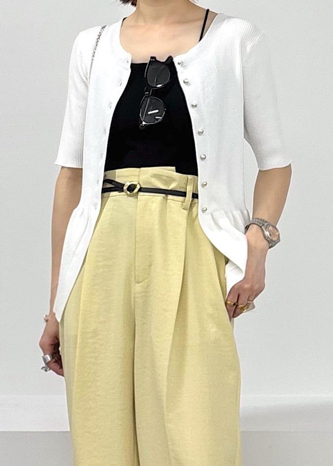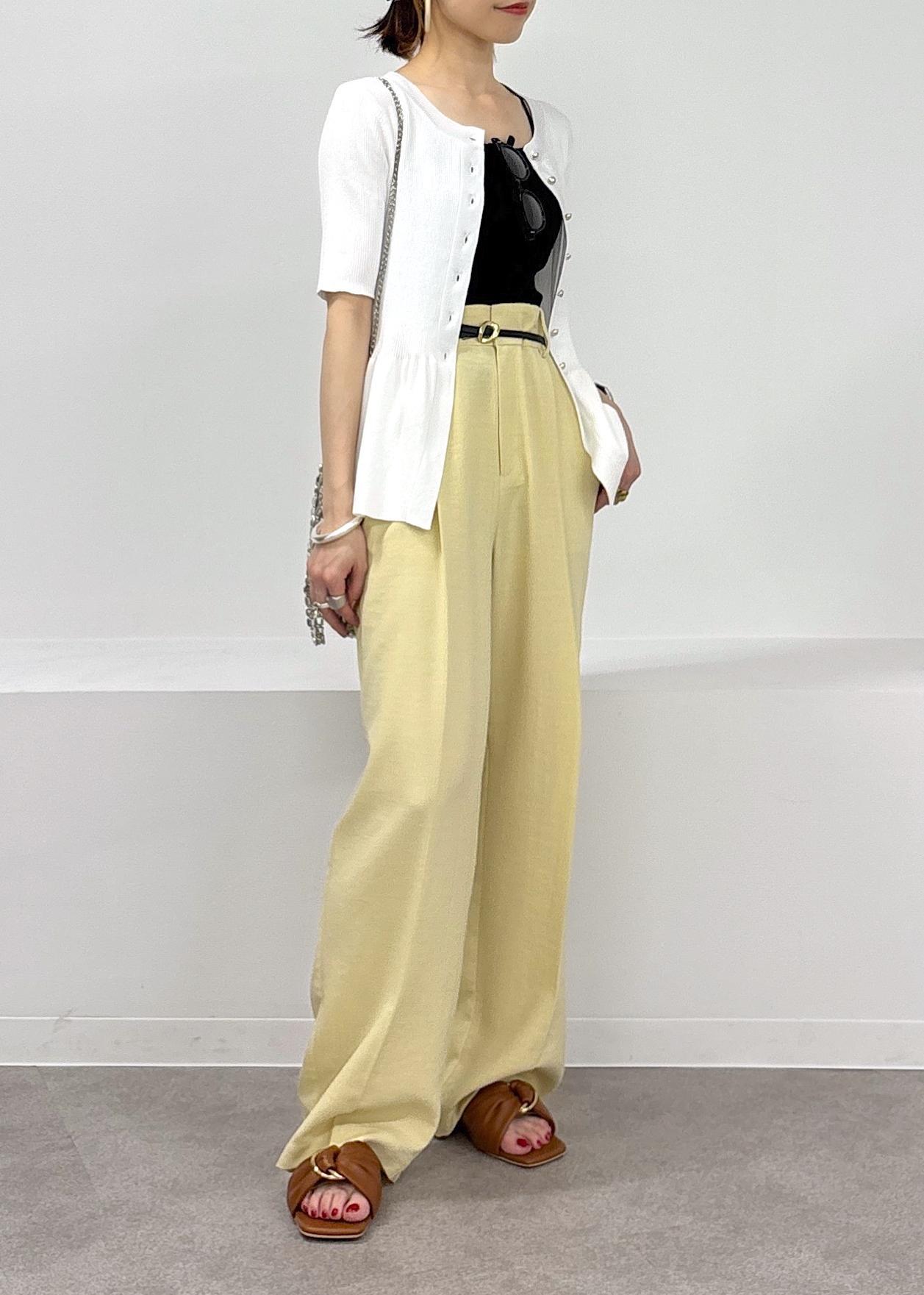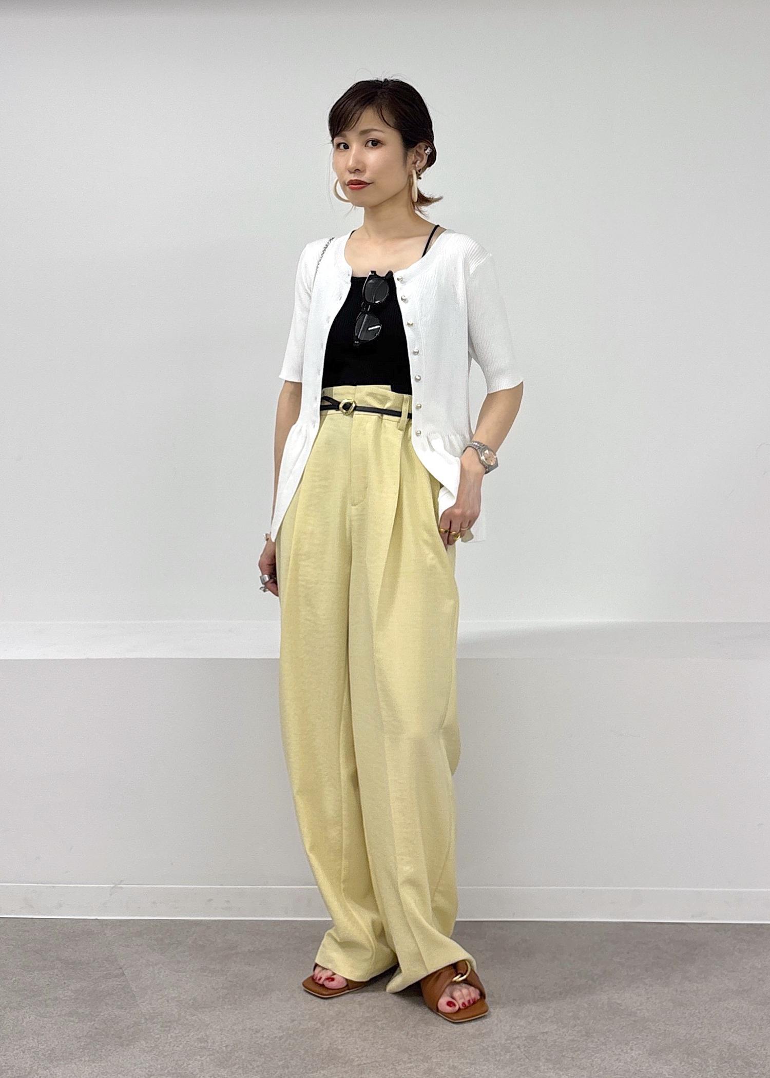 今年らしいイエローカラーがきれいなパンツをポイントに、ペプラムカーディガンのトップスを羽織りにして合わせた大人カジュアルスタイル♪緩やかパンツは少しハイウエストでイン、ベルトマークをしっかり見せることでバランス良く見えるのでオススメです◎サラっとした涼しい素材で合わせてるので夏場も快適に着れるアイテム同士です♪夏場のお出かけにもピッタリ。