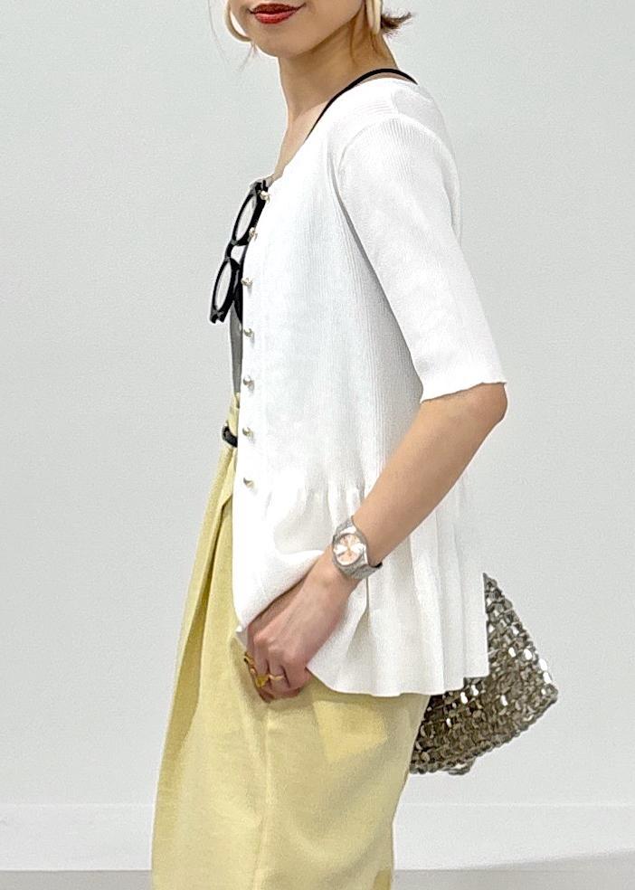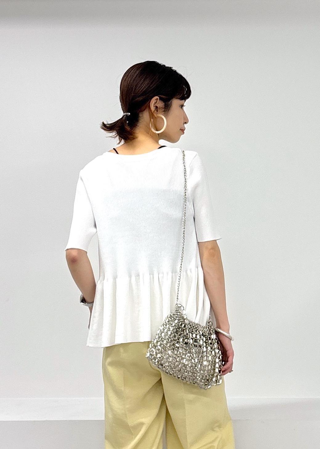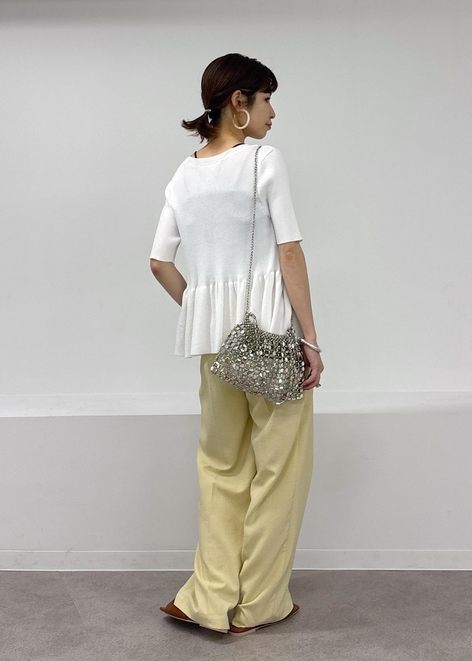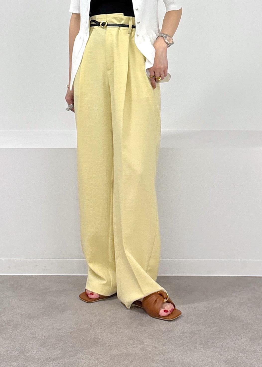 今年らしいイエローカラーがきれいなパンツをポイントに、ペプラムカーディガンのトップスを羽織りにして合わせた大人カジュアルスタイル♪緩やかパンツは少しハイウエストでイン、ベルトマークをしっかり見せることでバランス良く見えるのでオススメです◎サラっとした涼しい素材で合わせてるので夏場も快適に着れるアイテム同士です♪夏場のお出かけにもピッタリ。