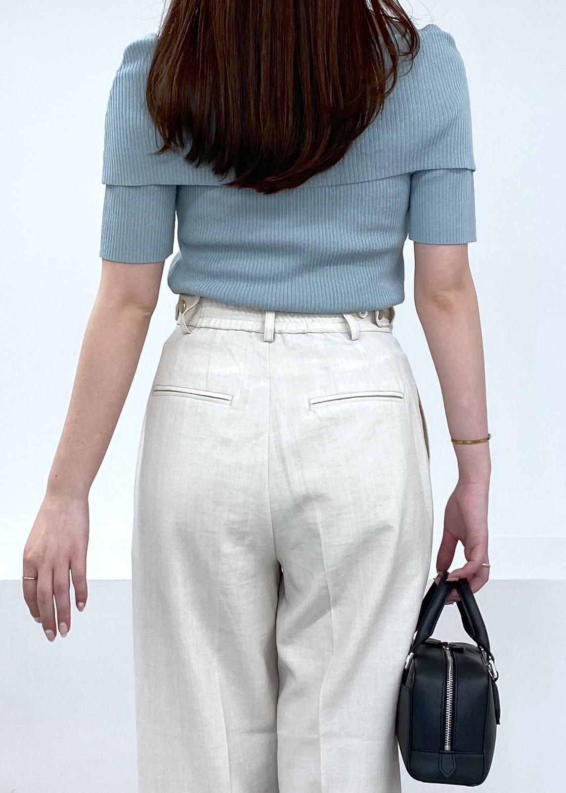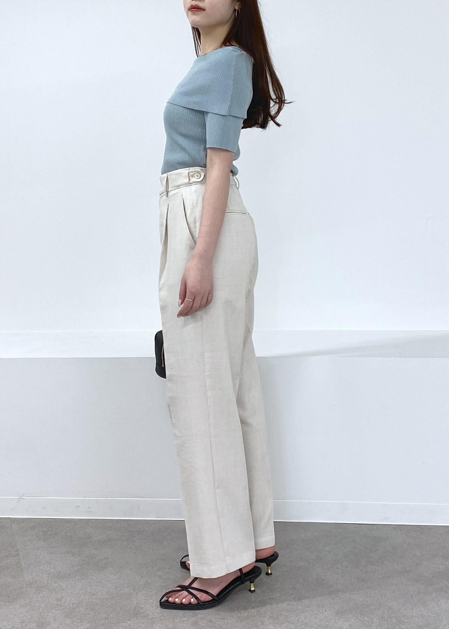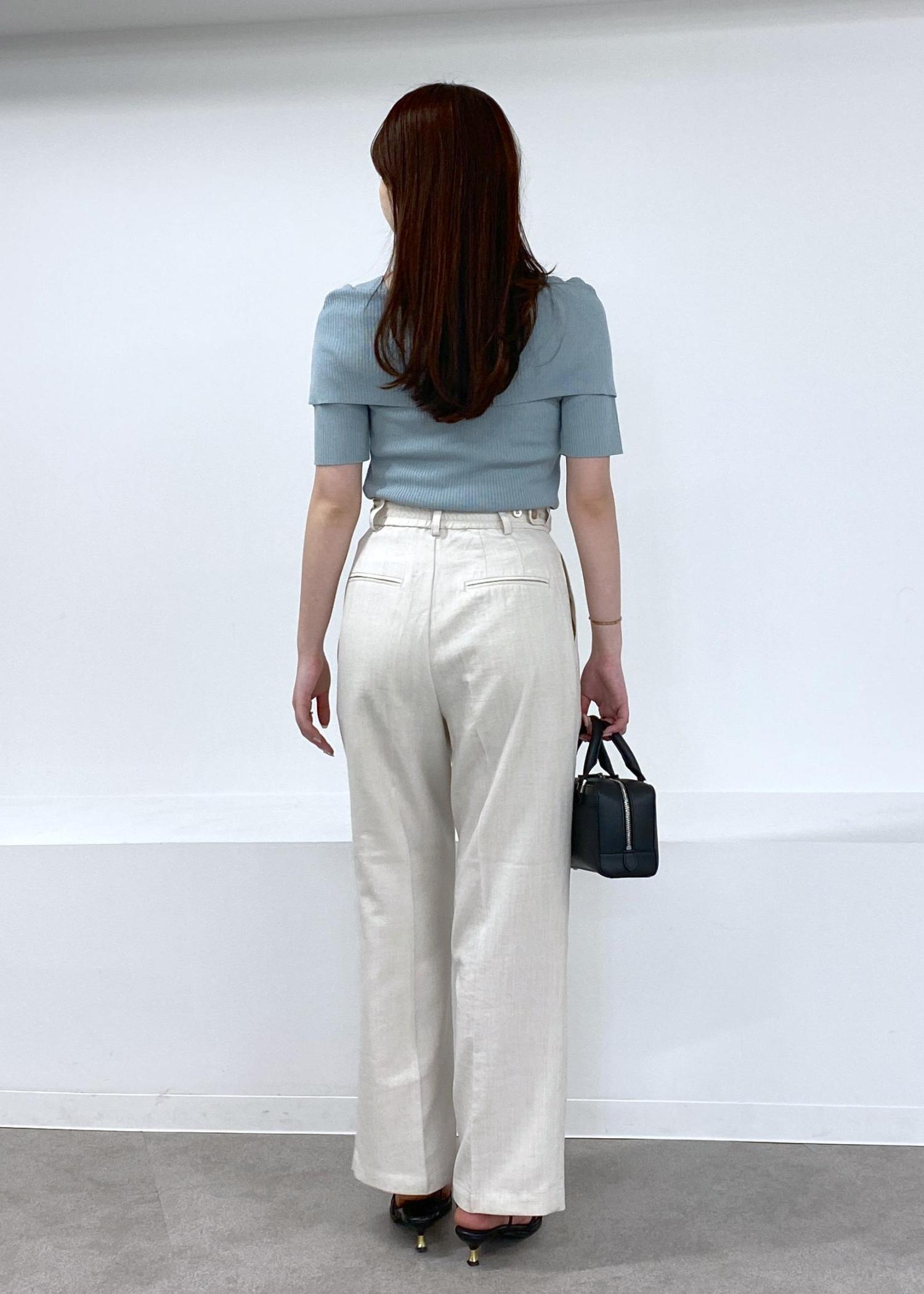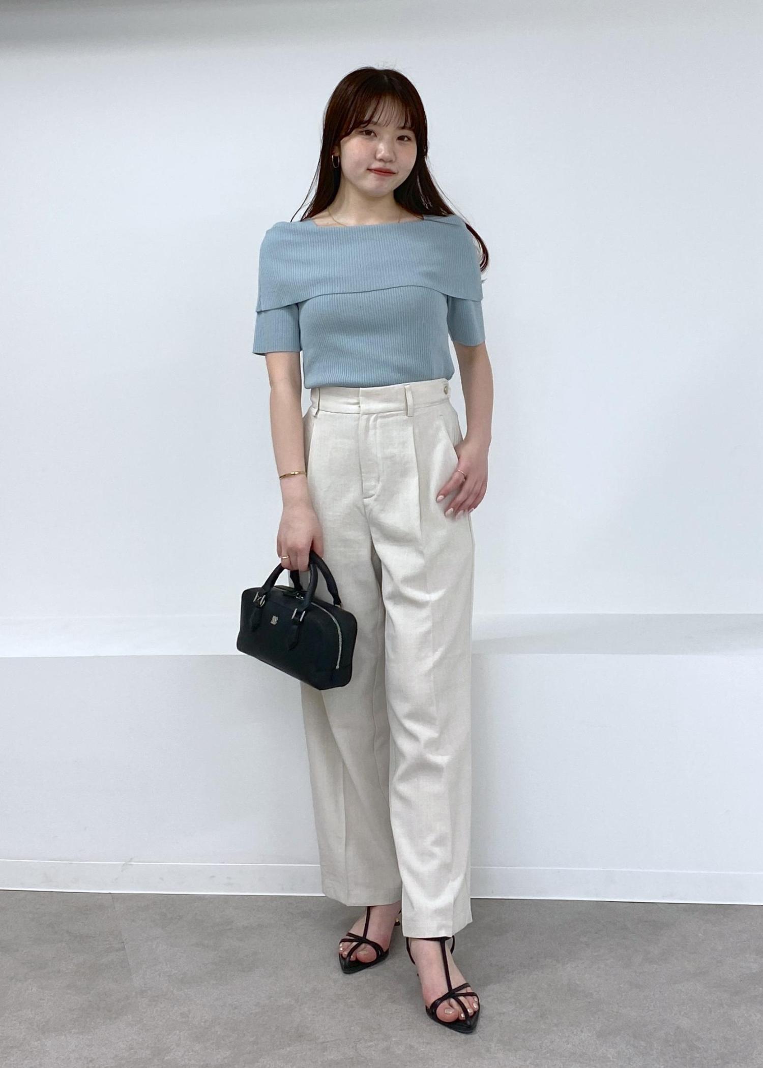 大人気の美easyリネンライクワイドパンツを合わせて、きれいめヘルシーな印象に✴︎ 小物はブラックカラーでまとめてすっきりしたスタイリングに◎