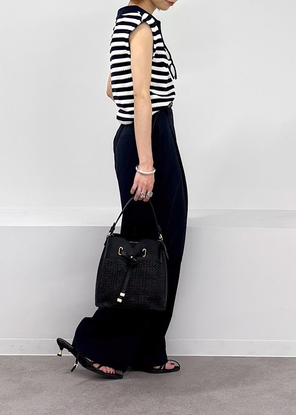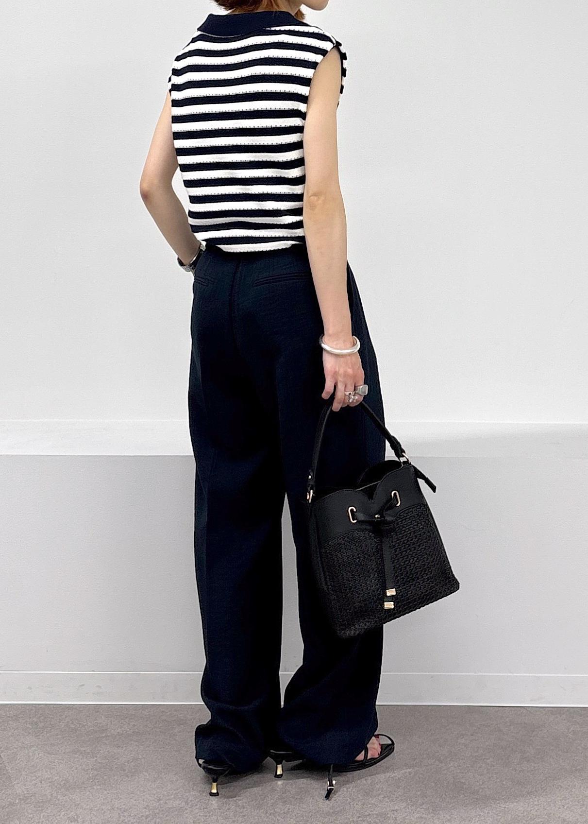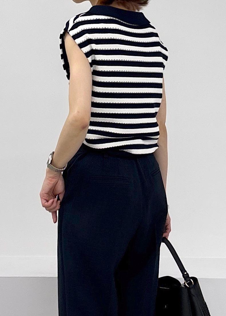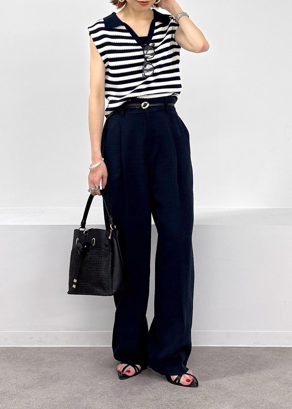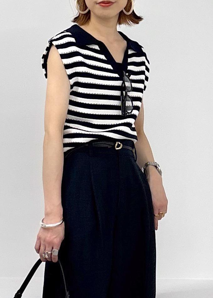 夏らしいボーダーが涼しさを感じるサマーニット♪スキッパーデザインが涼しさを感じます。アイレット編みのデザインなので、透け感を感じにくい安心感のある一枚で、ボーダーのカラーに合わせてボトムもネイビーでスッキリとまとめました。夏場に向けてオススメの大人カジュアルコーデ。
