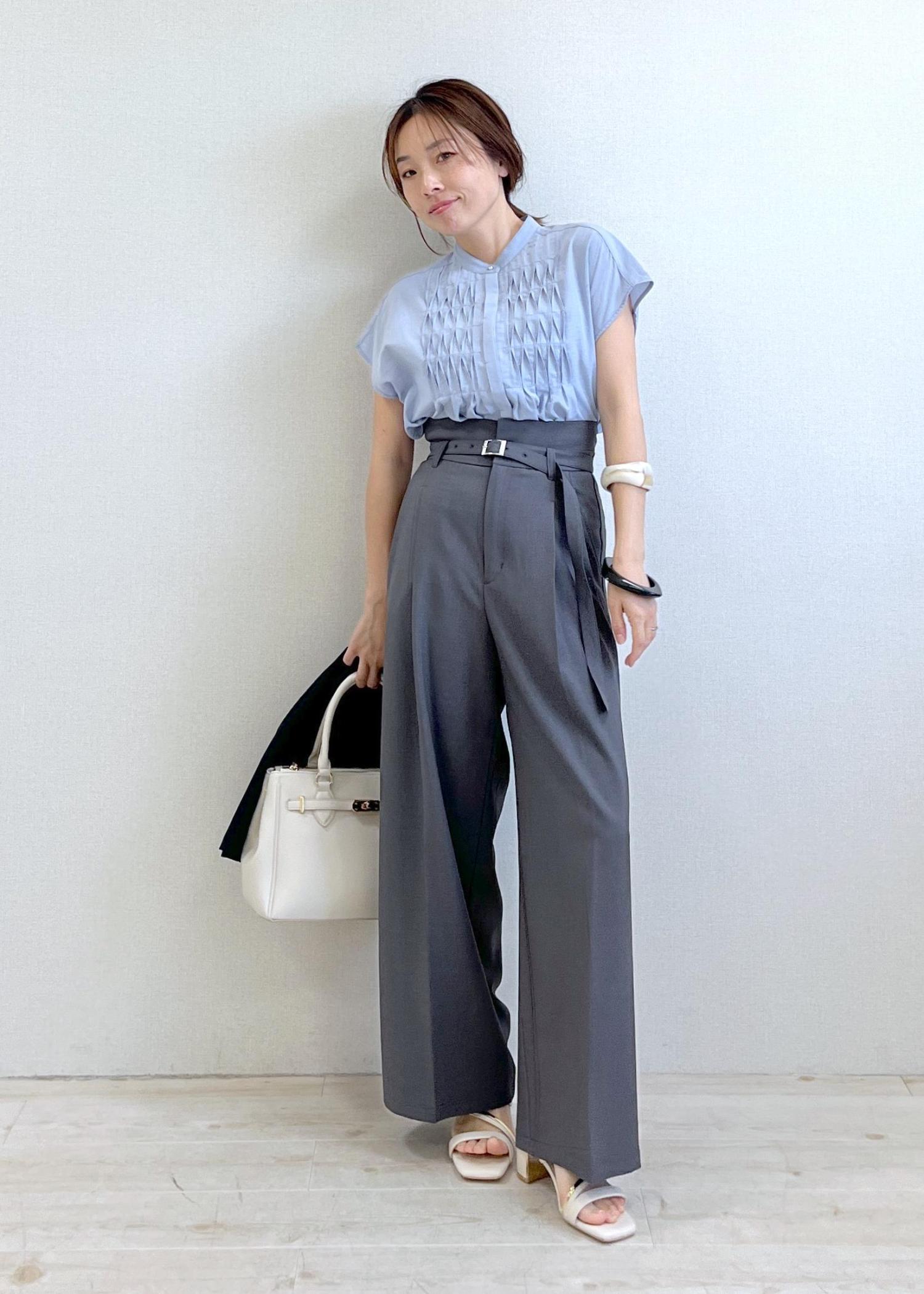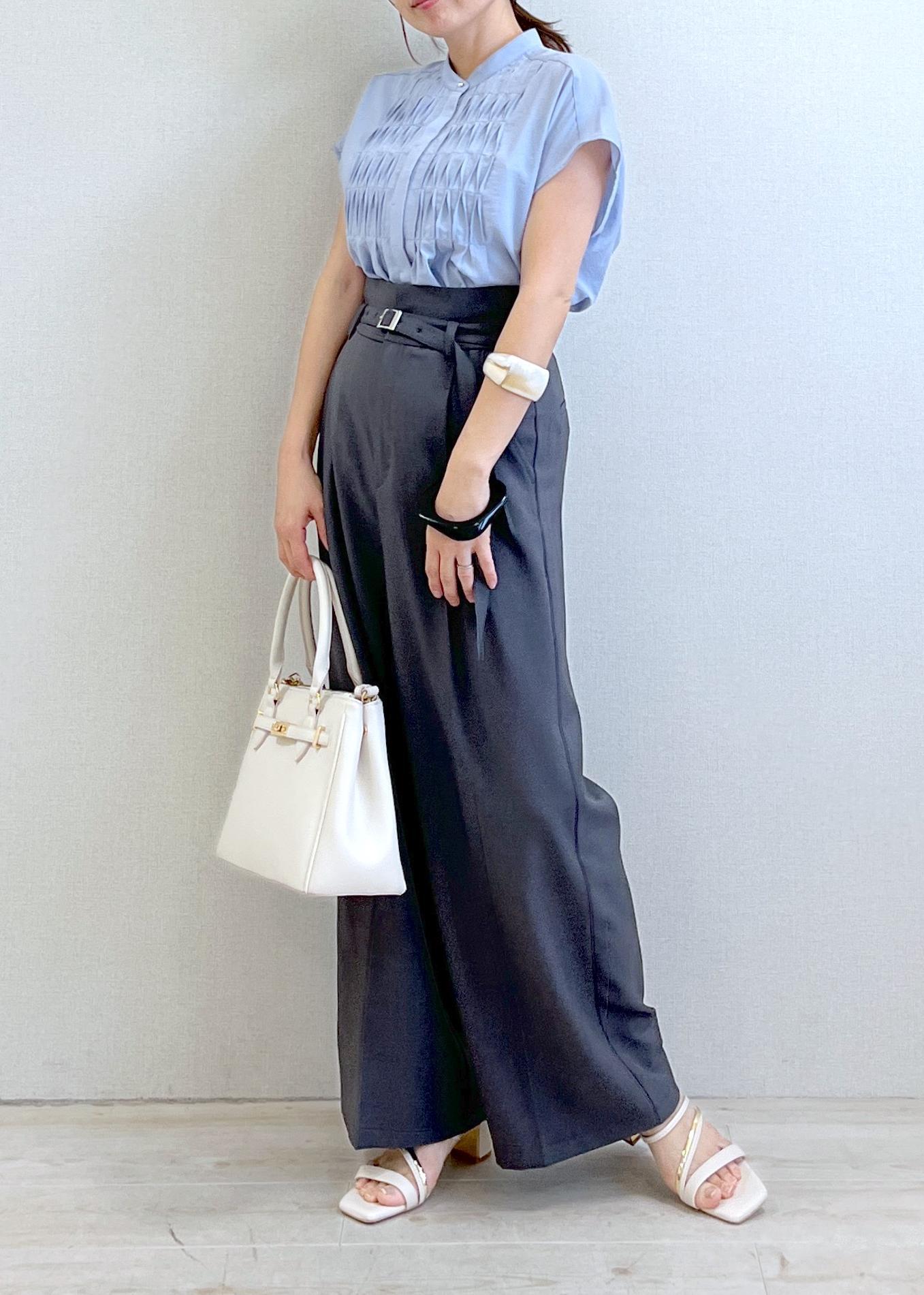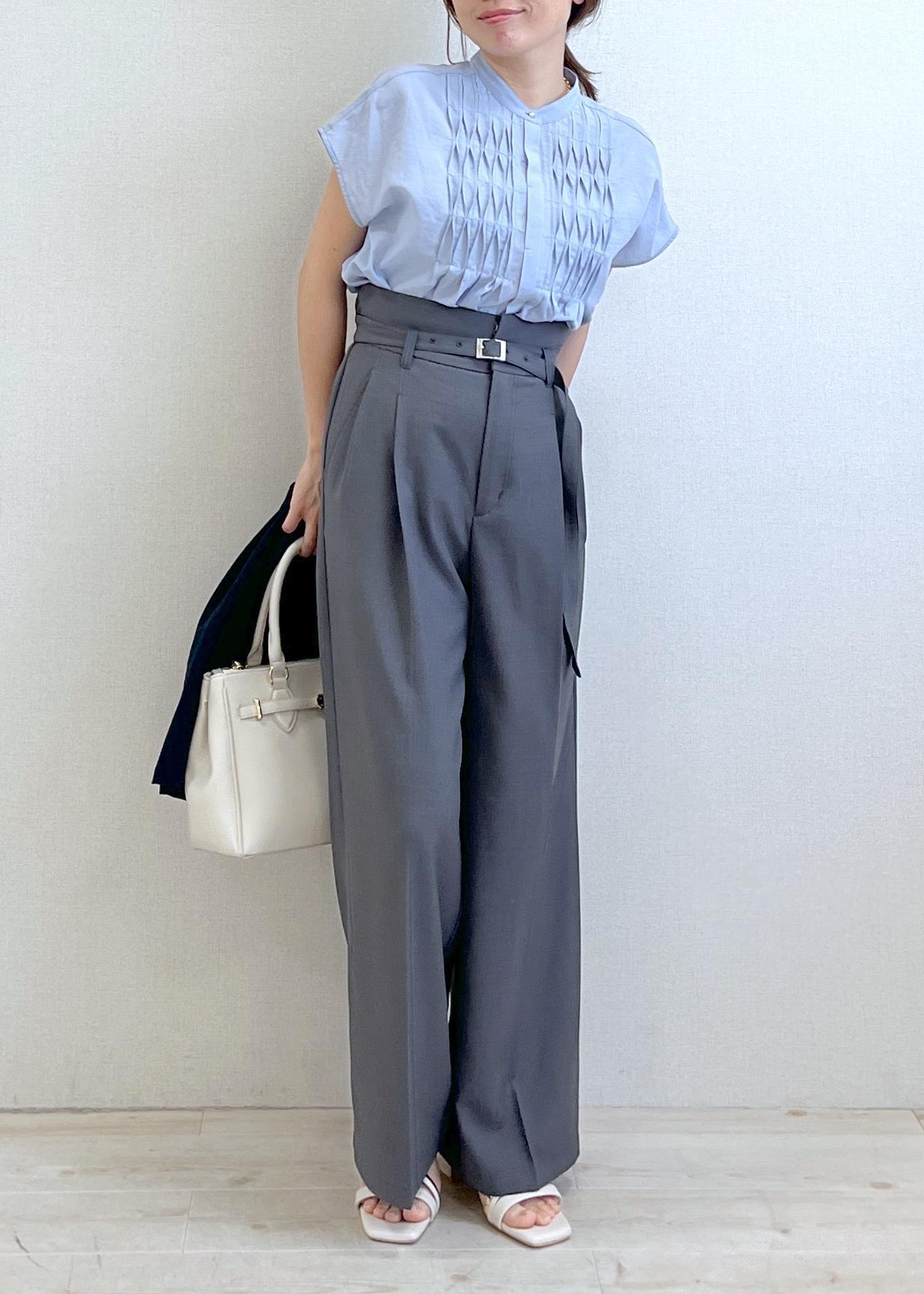 VIS【新色追加】【防シワ/接触冷感】ベルトディテールタックワイドスラックスパンツチャコール / S¥6,589レビュー152cmでSサイズ着用し高めの位置で付属のベルトでしめてペタンコ靴でギリギリ床につかないくらいの長め丈。オチ感のある素材でシワにもなりにくく、とっても履きやすかったです。太すぎないワイドシルエットでどんなスタイリングにも使えそうです!