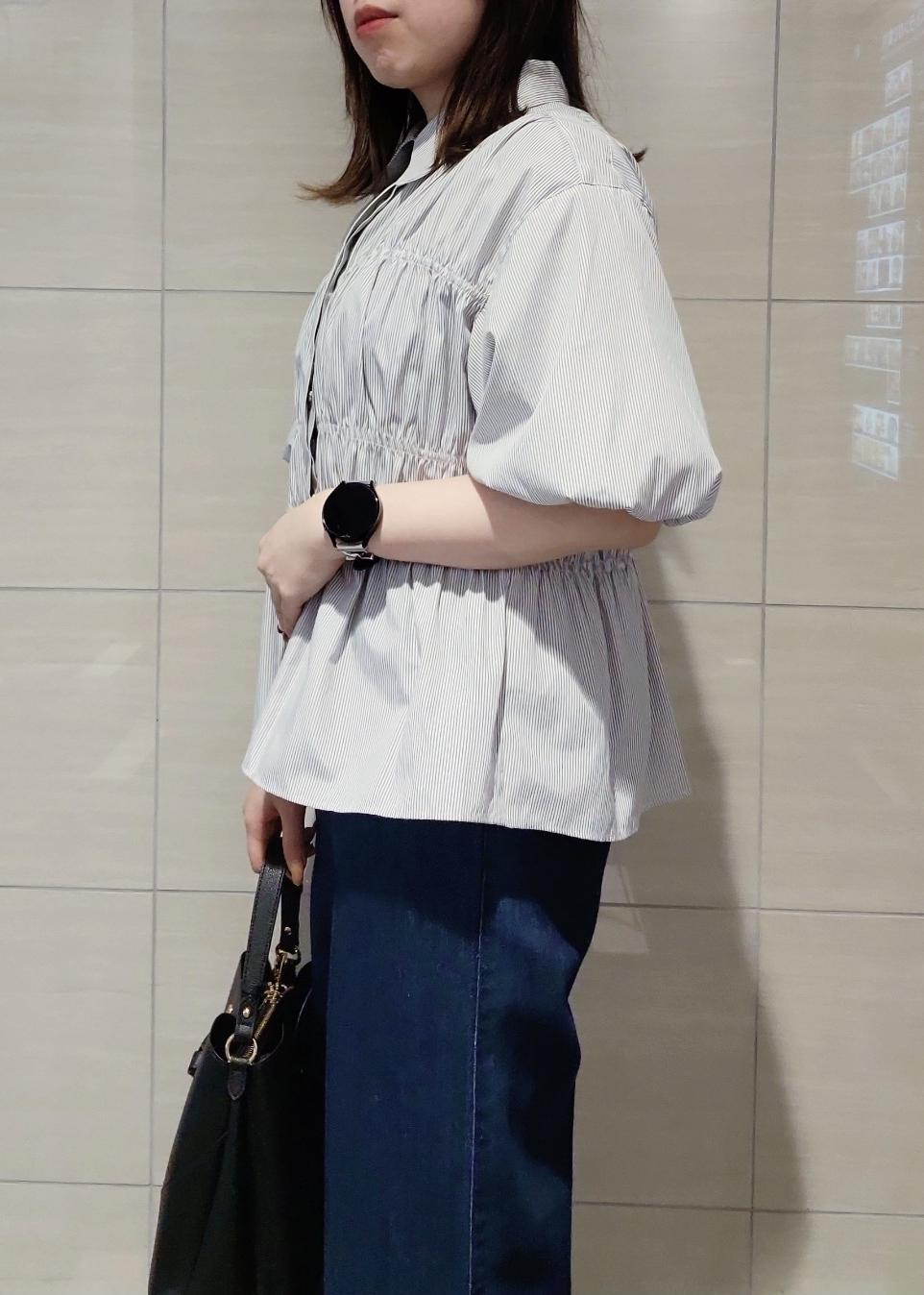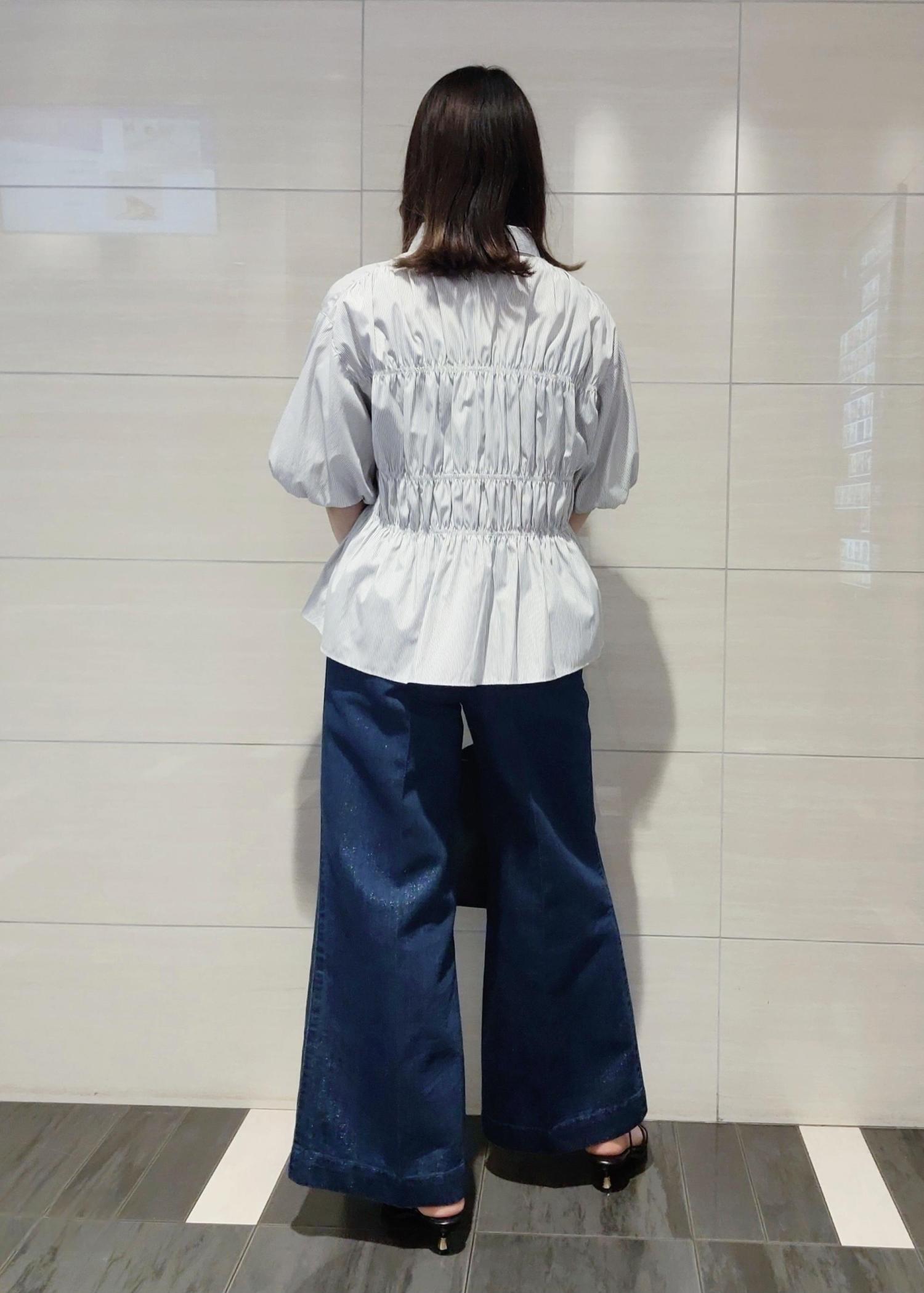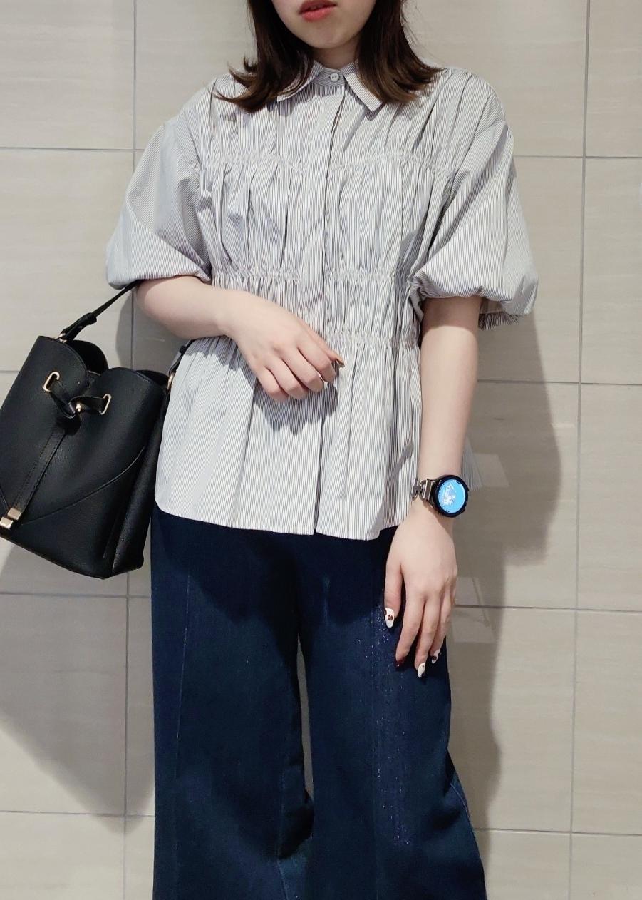 シャーリングのバルーンスリーブブラウスがデザイン性が高いのでシンプルな合わせでも着映え◎デニム合わせでON/OFF兼用に着れるスタイリングにしました♪