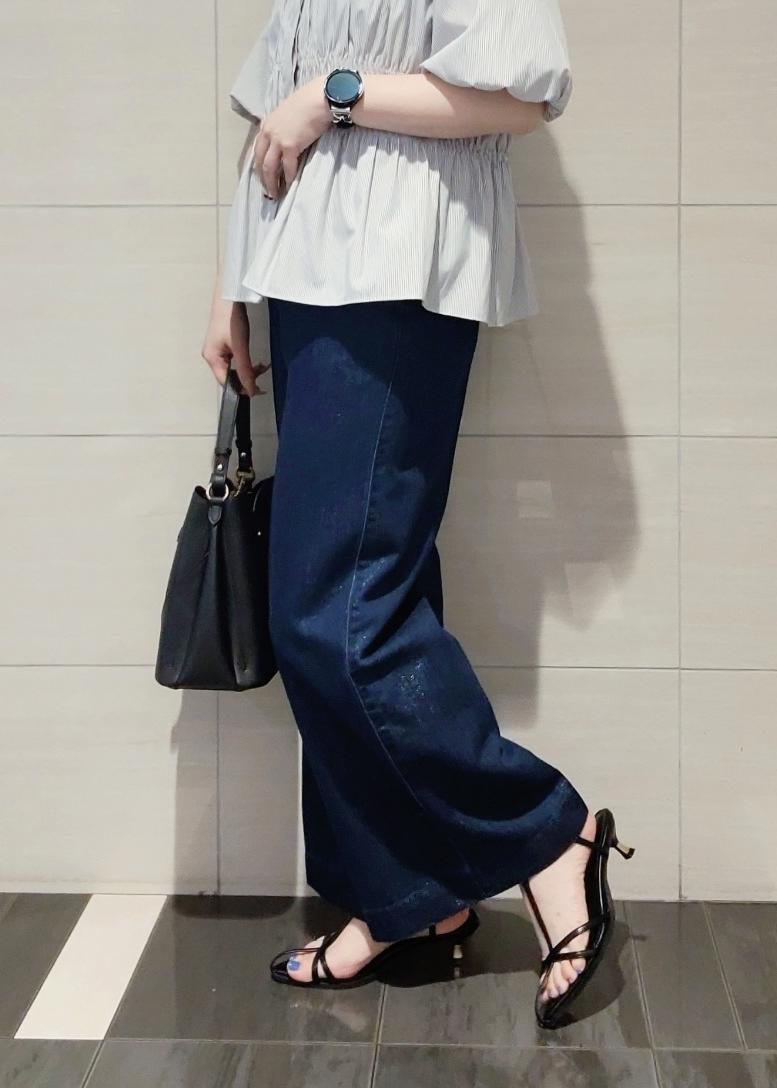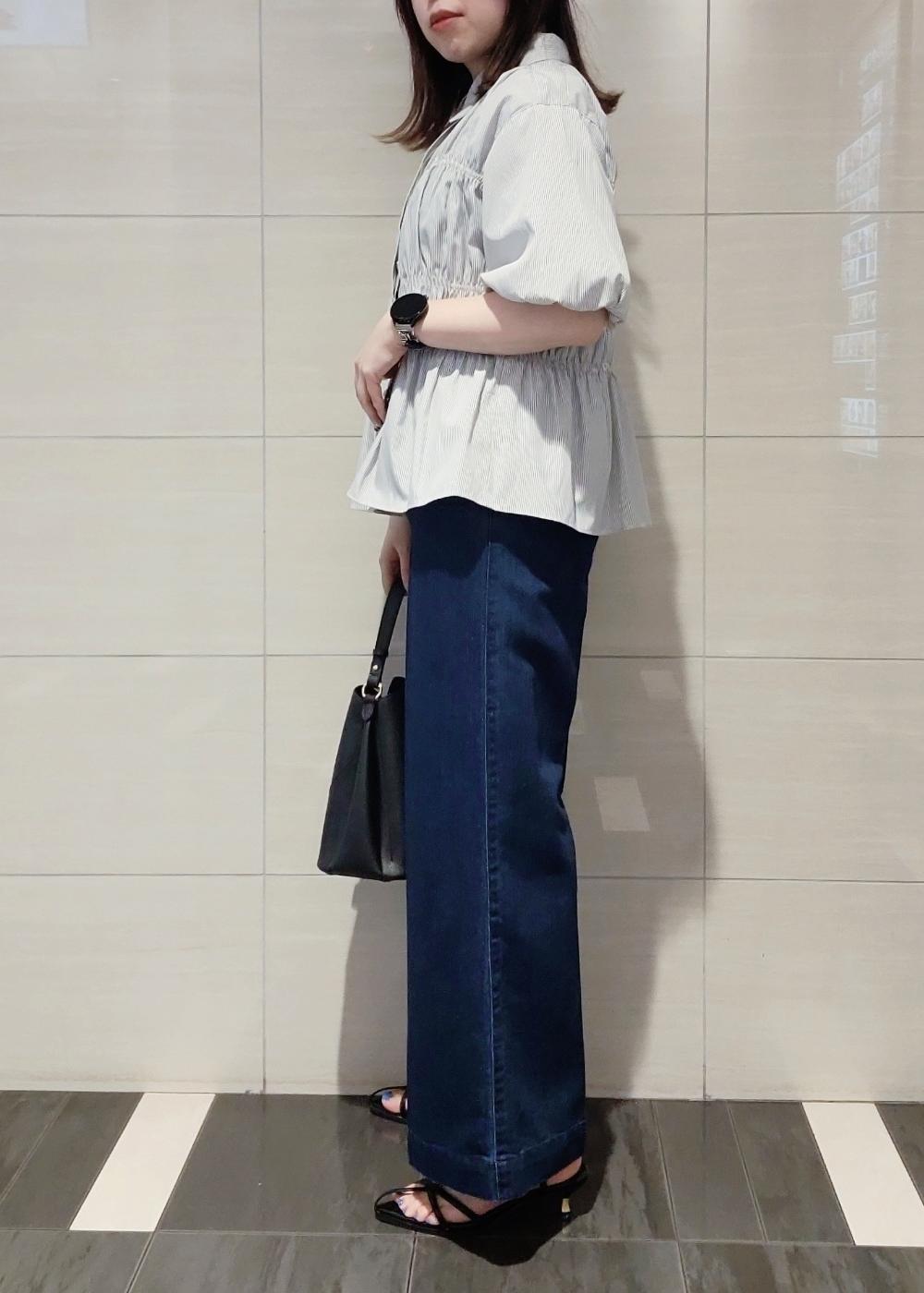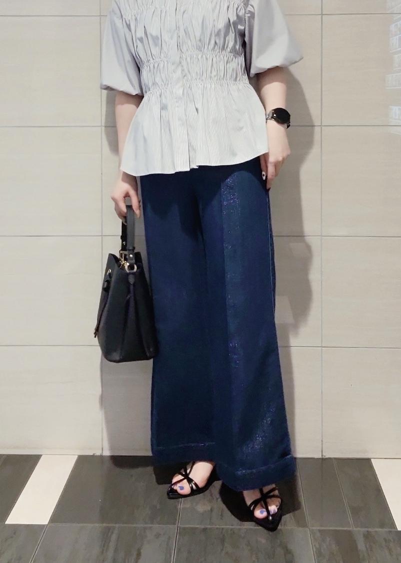 シャーリングのバルーンスリーブブラウスがデザイン性が高いのでシンプルな合わせでも着映え◎デニム合わせでON/OFF兼用に着れるスタイリングにしました♪
